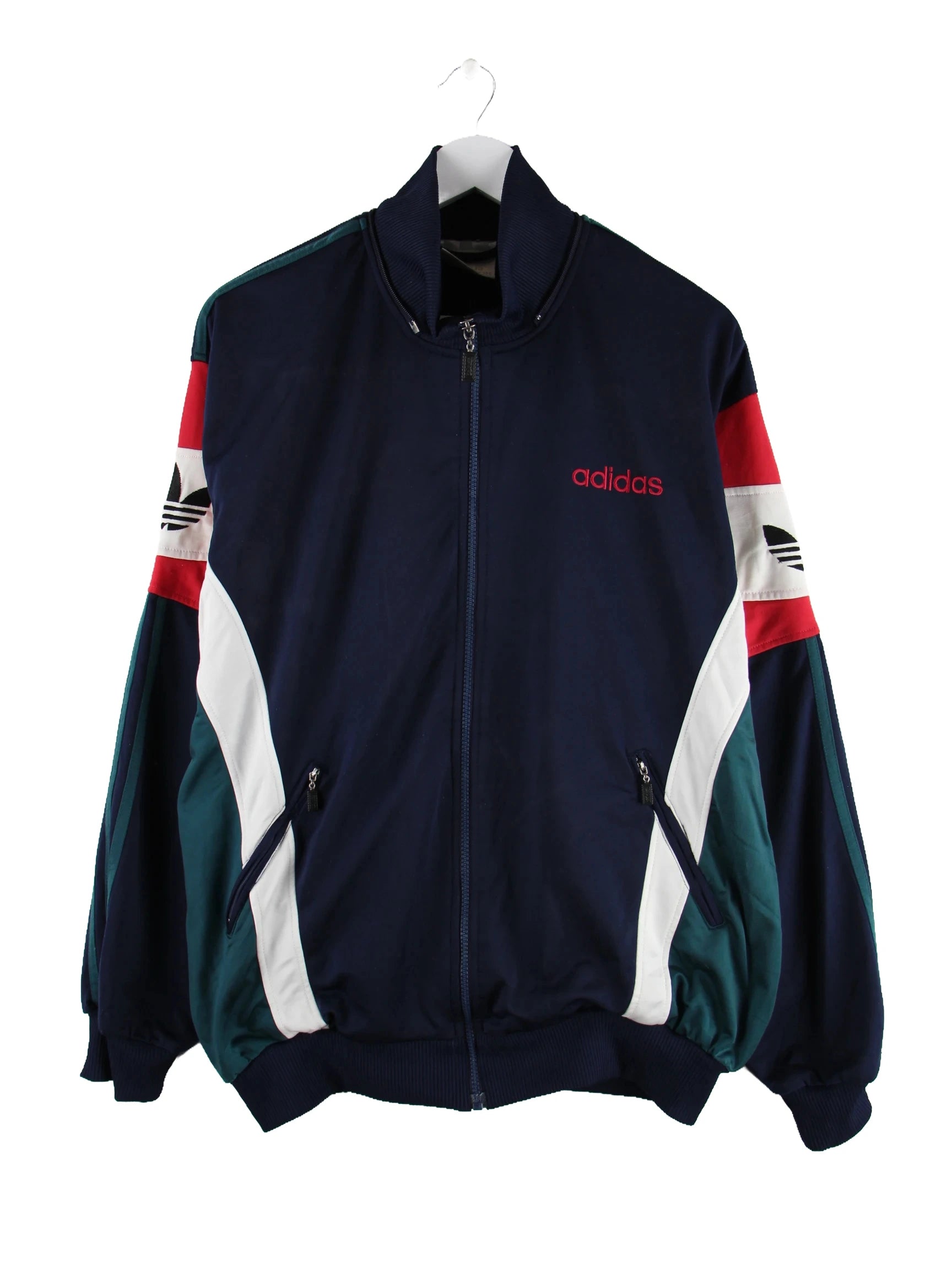 Blaue Trainingsjacke des Labels Adidas aus den 80'ern in Größe XXL. Sie ist aus Synthetik gemacht und in gutem Zustand bei uns vorrätig.