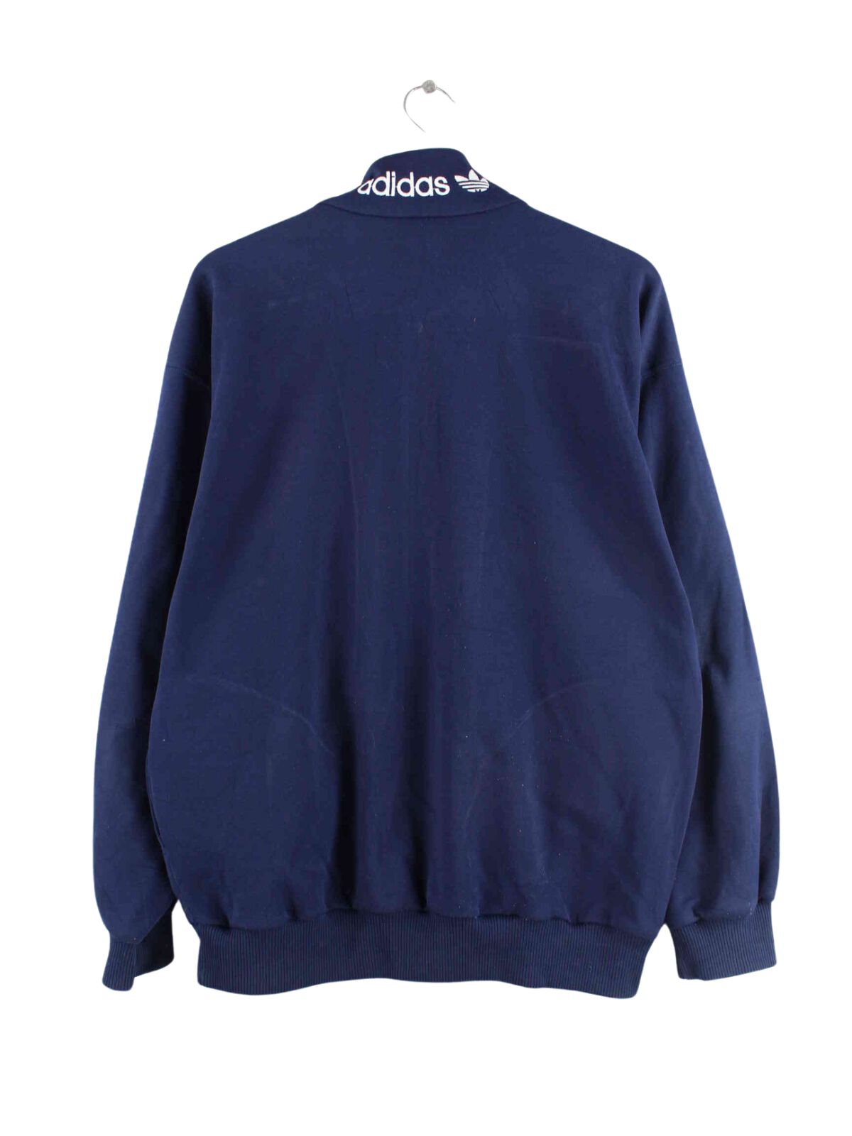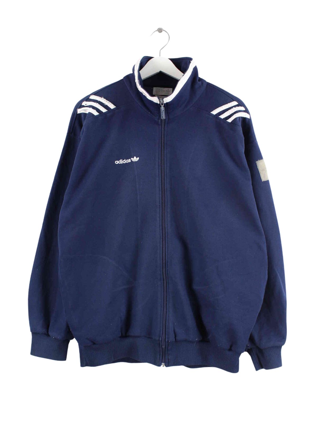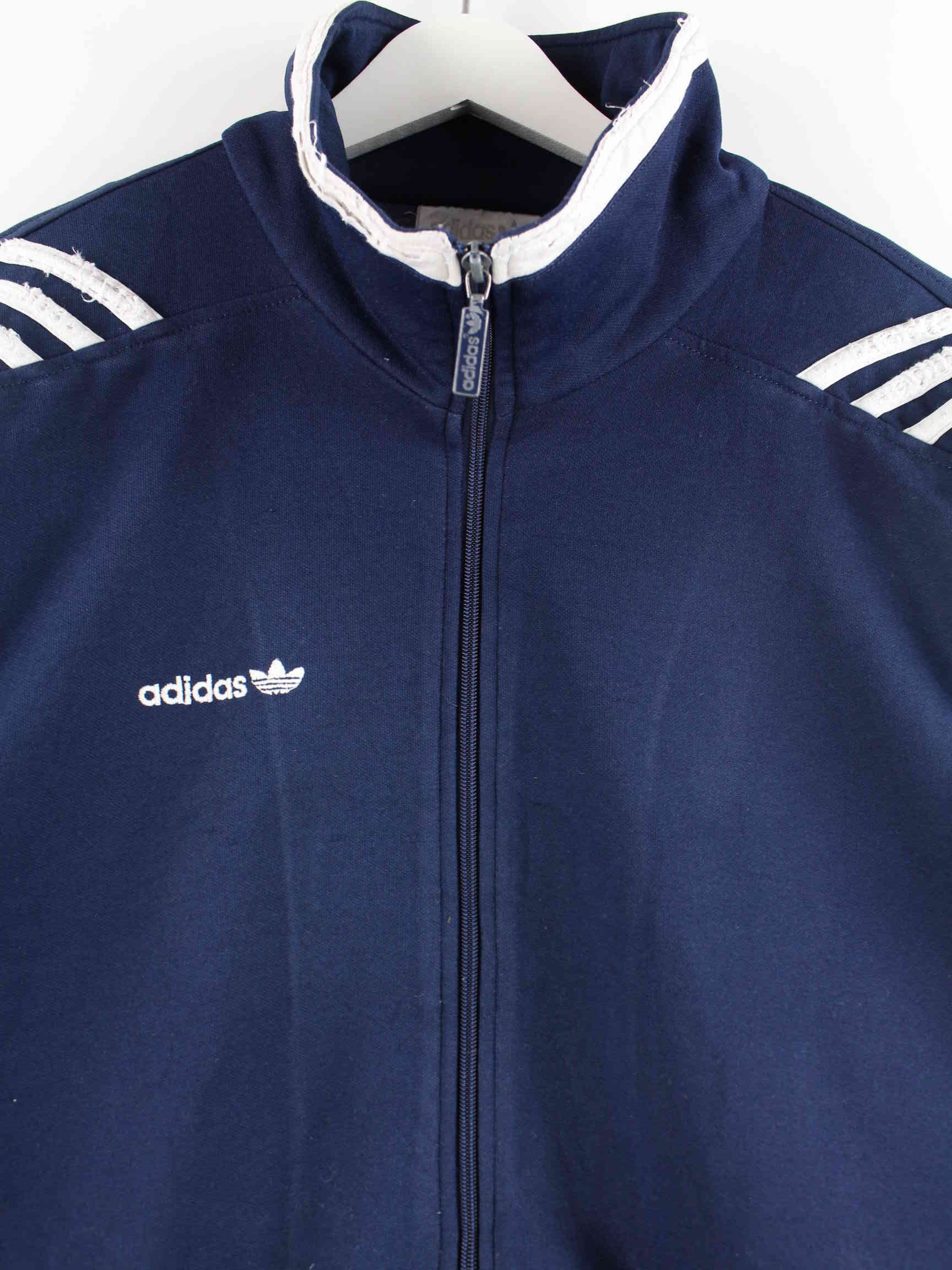 Blaue Trainingsjacke der Brand Adidas aus den 80'ern in Größe L. Sie ist aus Synthetik hergestellt und in gutem Zustand zu haben.