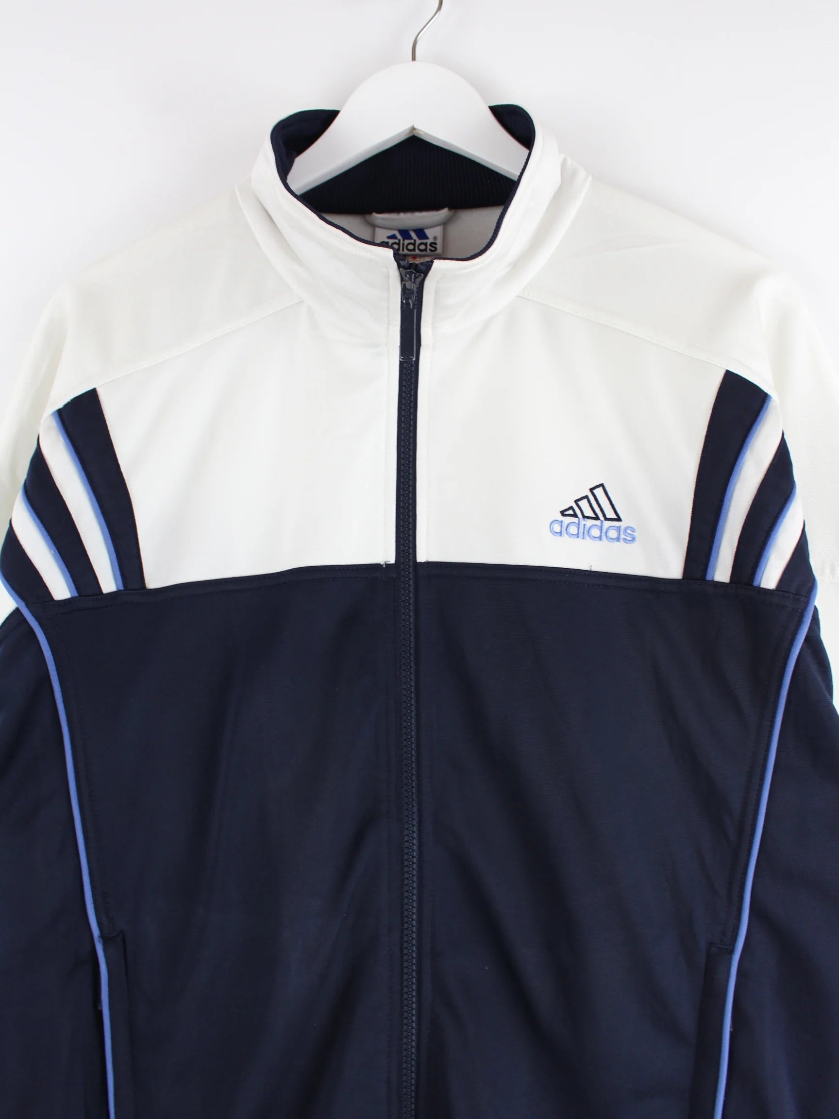Blaue Trainingsjacke des Labels Adidas aus den 90'ern in Größe XL. Sie ist aus Synthetik gefertigt und in gutem Zustand zu bekommen.