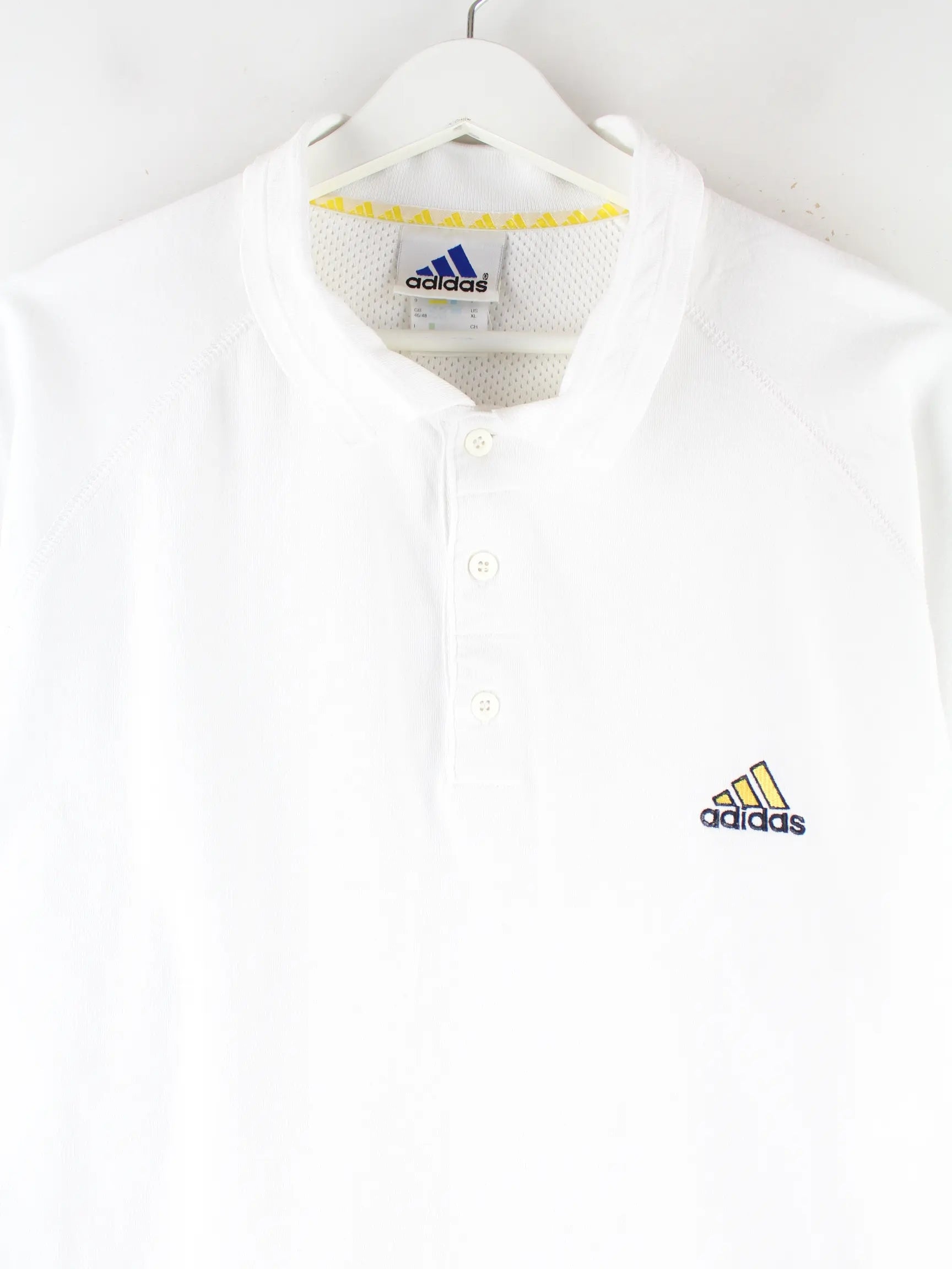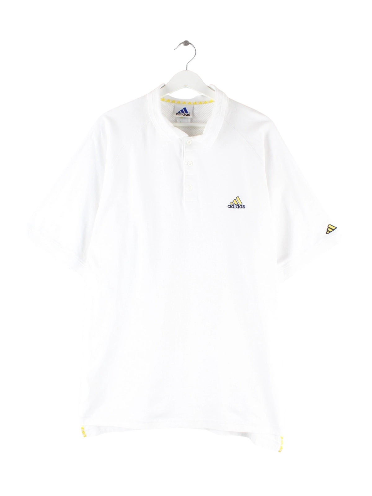 Poloshirt des Labels Adidas in Größe XXL aus den 90'ern. Es ist aus Baumwolle gefertigt und in Weiß in Stock.