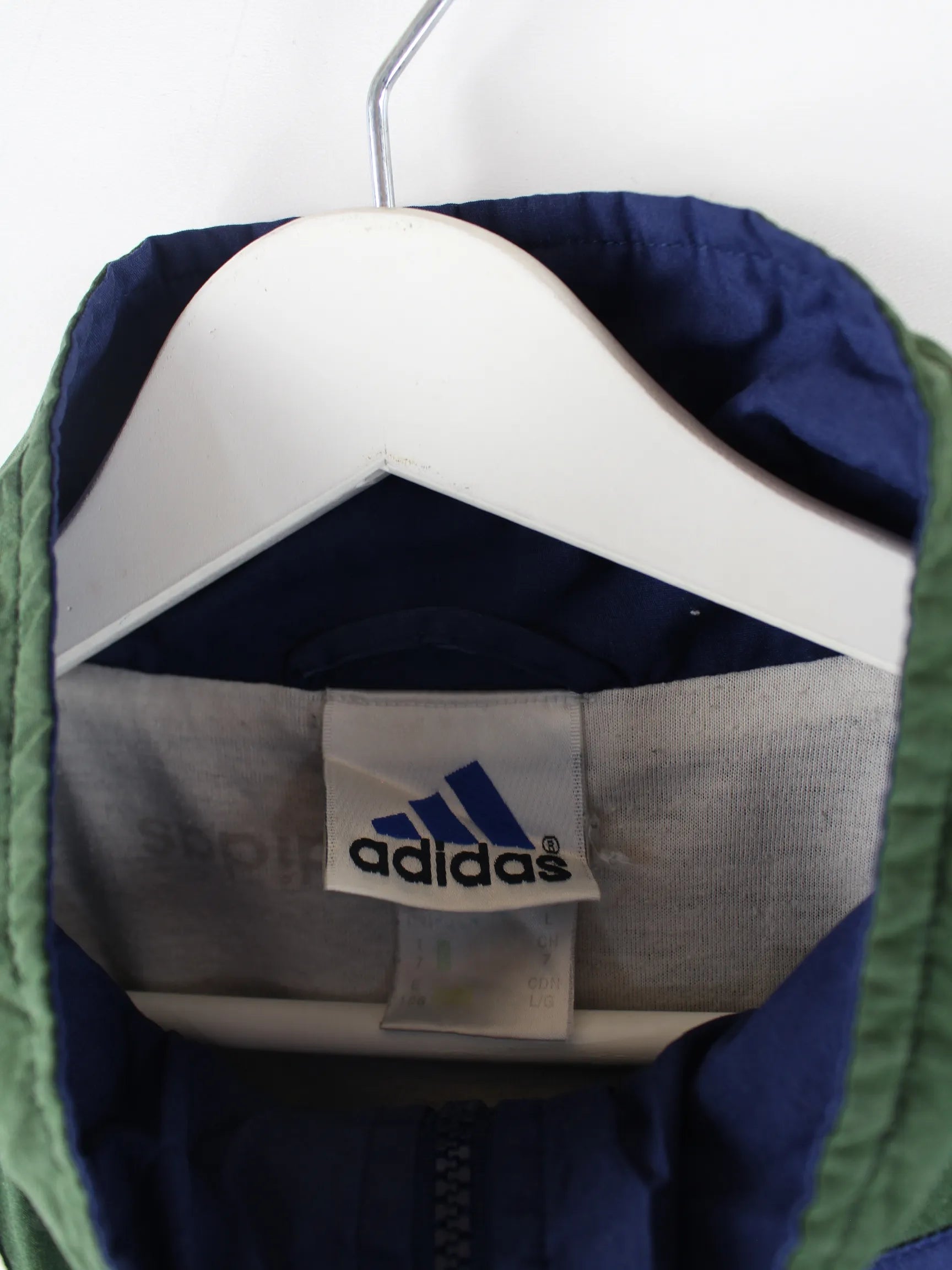 Blaue Trainingsjacke der Brand Adidas aus den 90'ern in Größe XL. Sie ist aus Synthetik produziert. Den Zustand würden wir als 'In Ordnung' bezeichnen (vergl. Bilder).