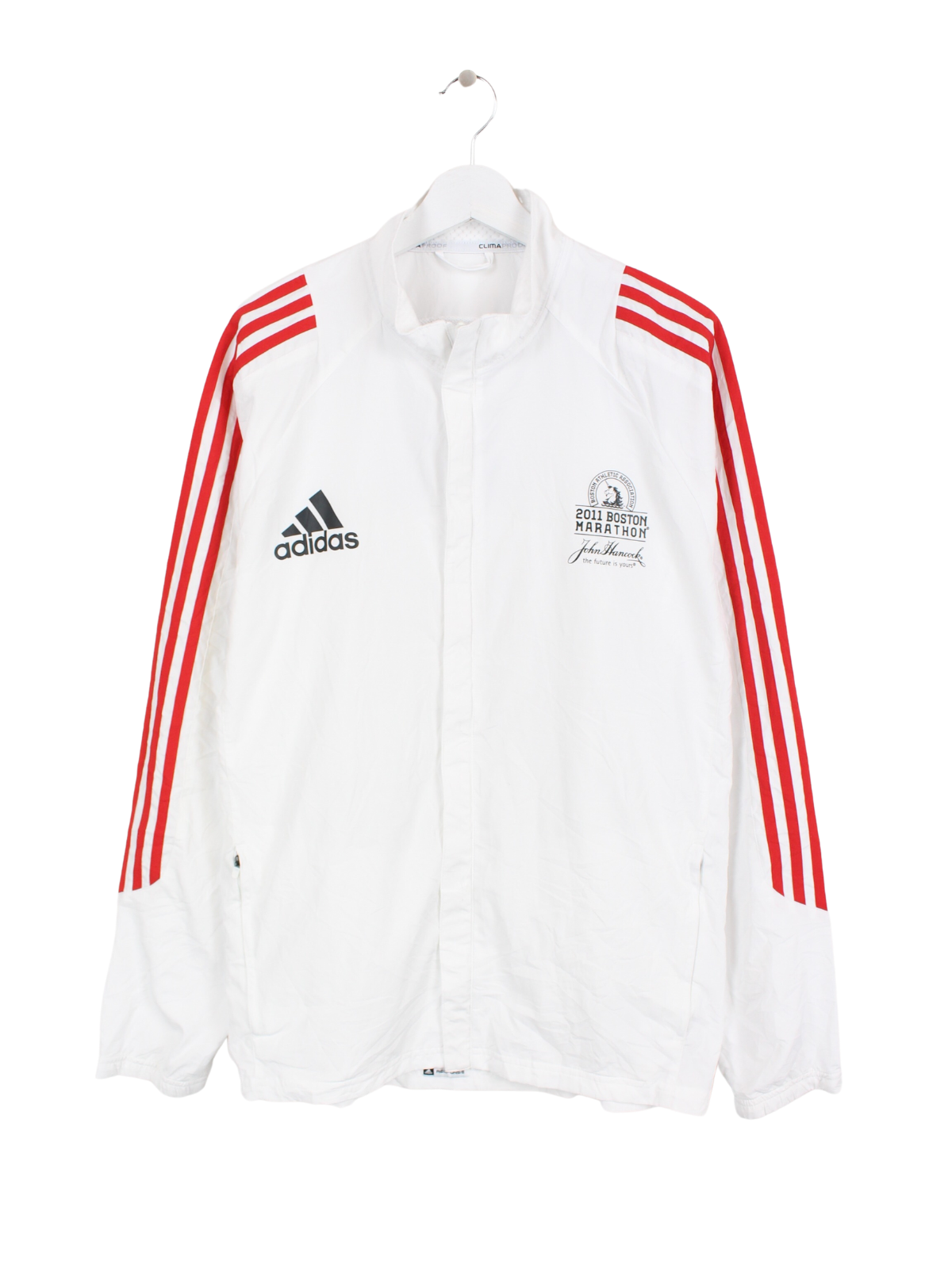 Weiße Adidas Trainingsjacke vom Boston Marathon 2011.