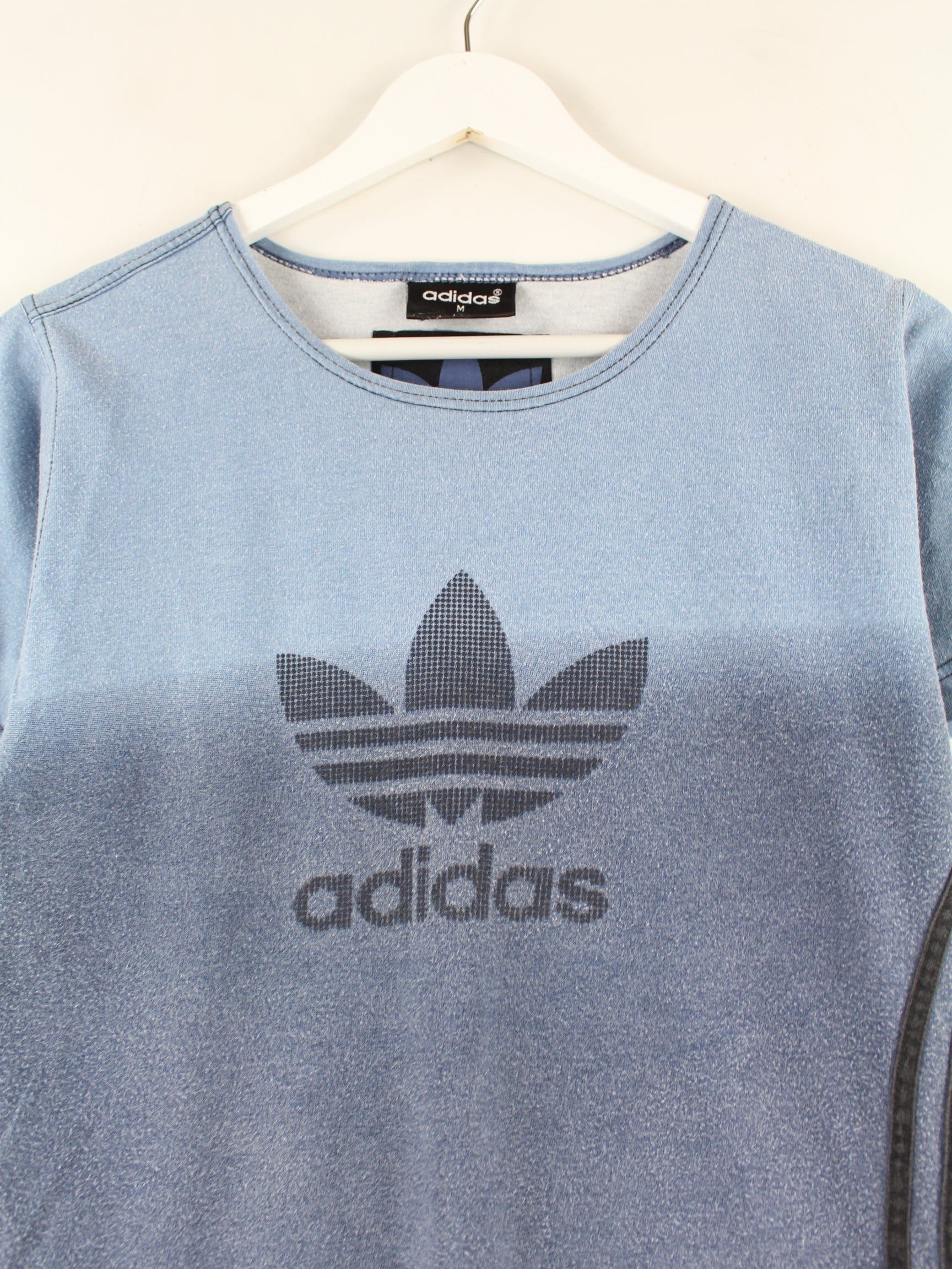 Blaues T-Shirt von Adidas aus den 90'ern in Größe M. Es ist aus Baumwolle gefertigt und in sehr gutem Zustand zu bekommen. Mit chiquem Trefoil Print.