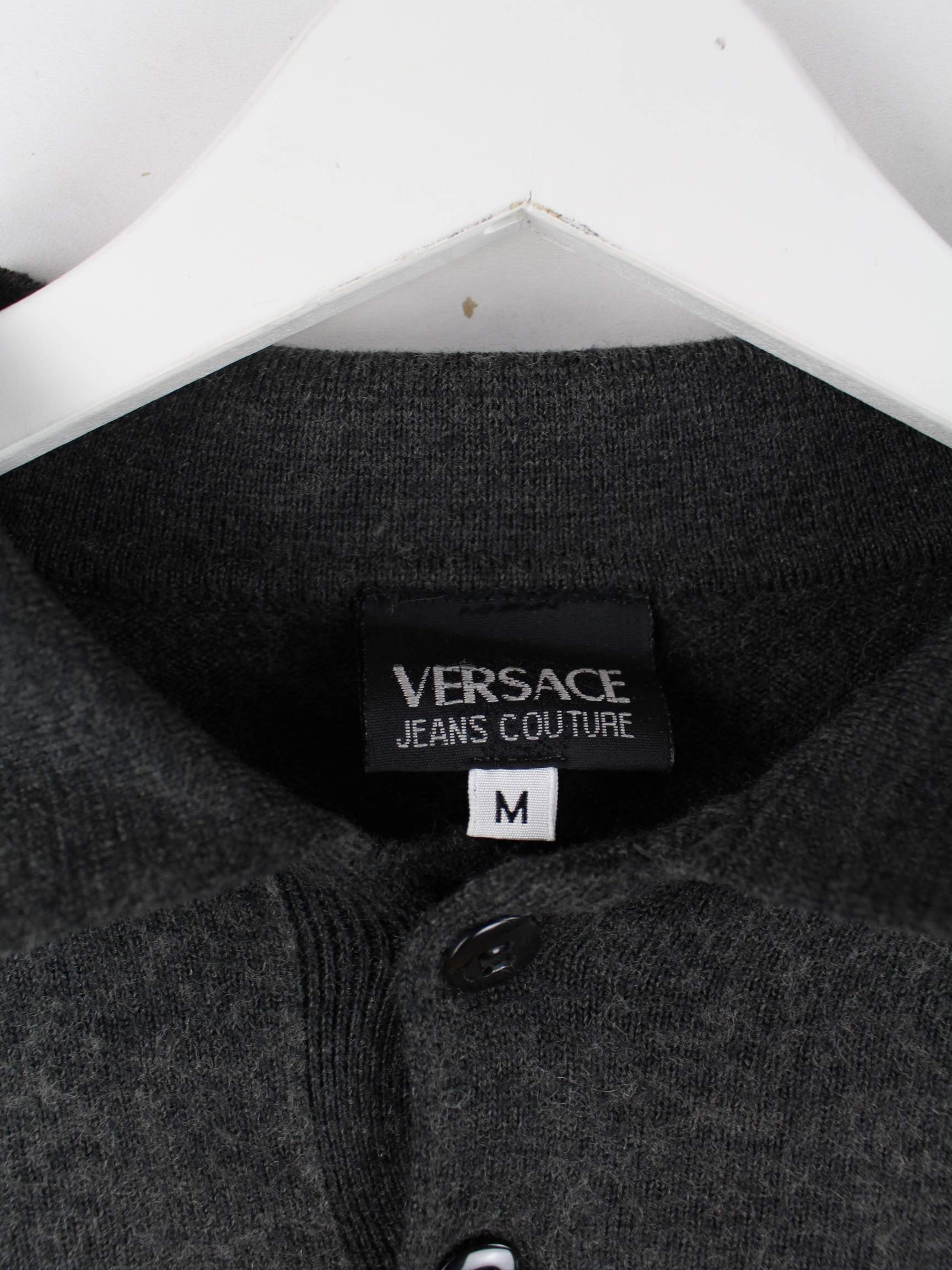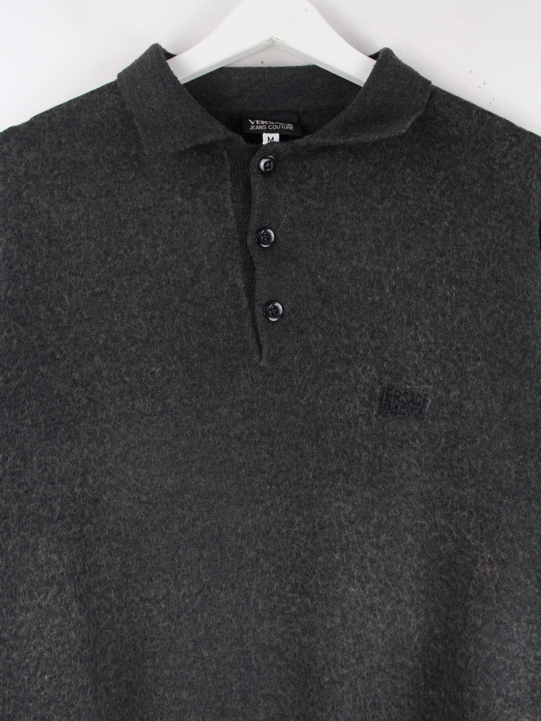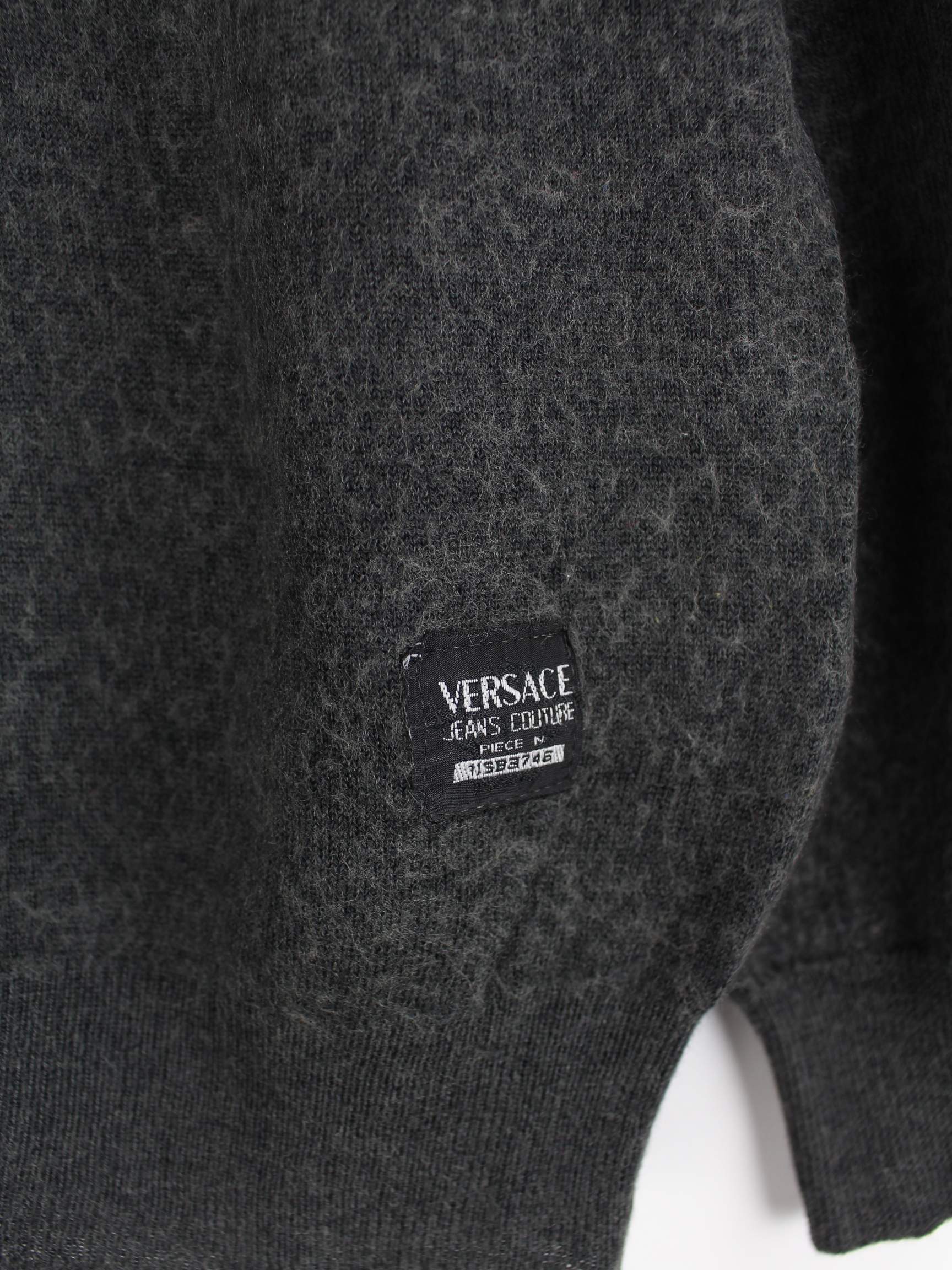 Grauer Pullover des Labels Versace aus den 90'ern in Größe M. Er ist aus Wolle hergestellt und in sehr gutem Zustand zu haben.