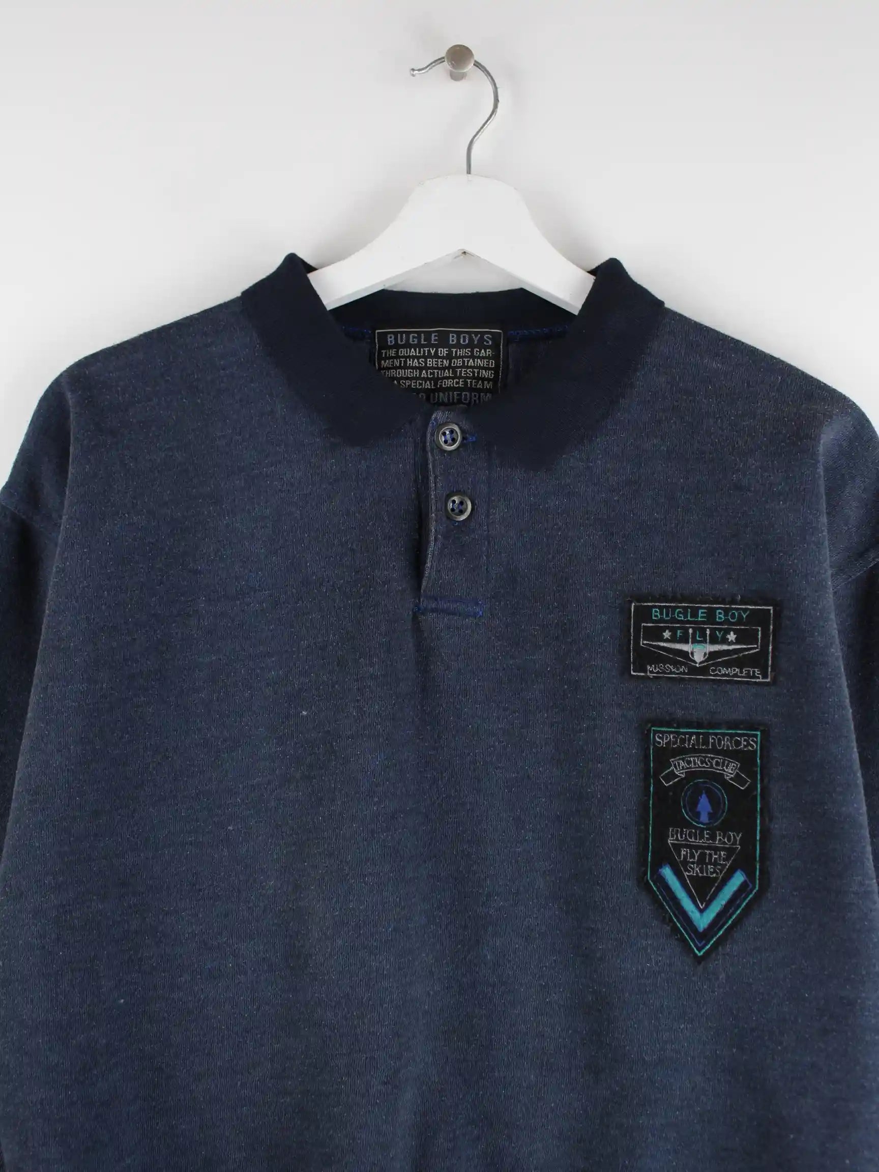 Blauer Sweater des Labels Bugle Boy aus den 90'ern in Größe XS. Er ist aus einer Baumwollmischung hergestellt. Den Zustand würden wir als 'In Ordnung' bezeichnen (vergl. Bilder).