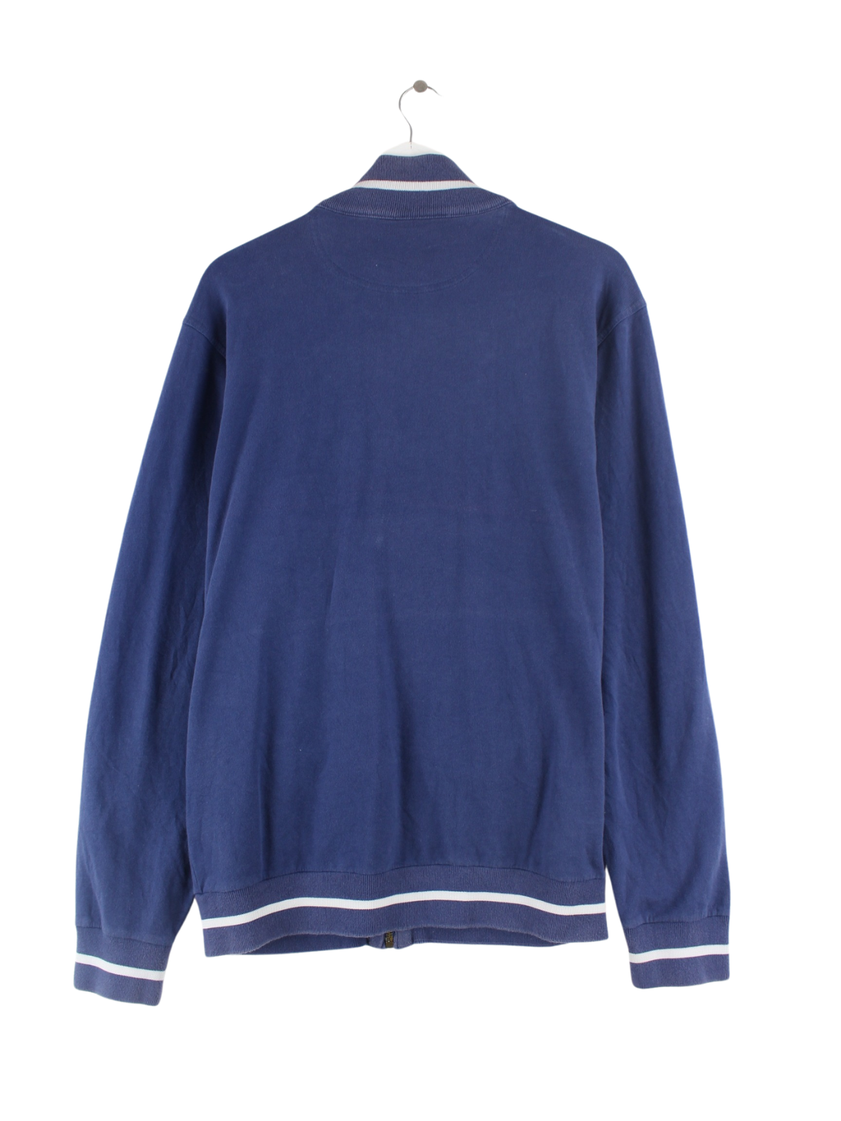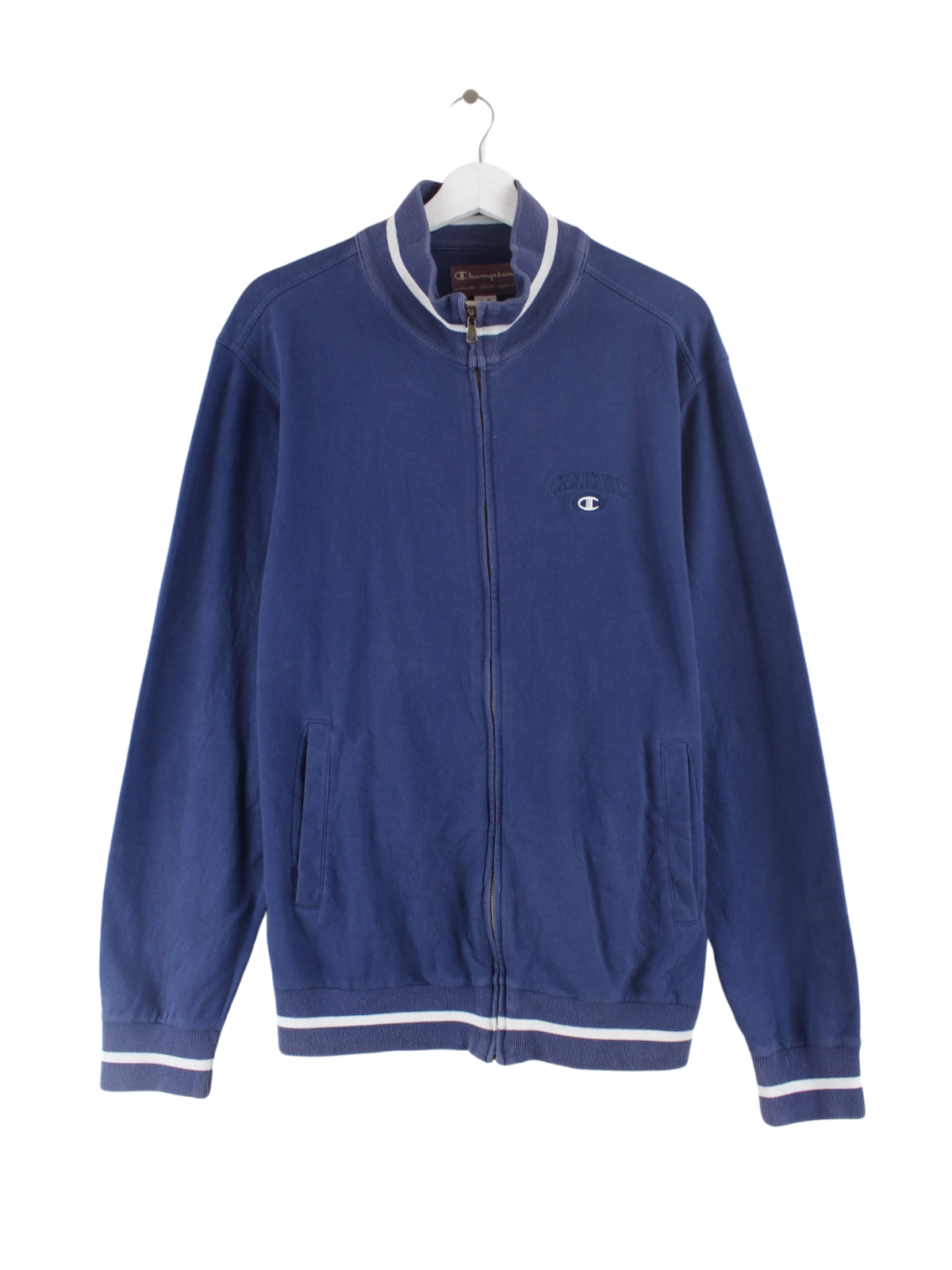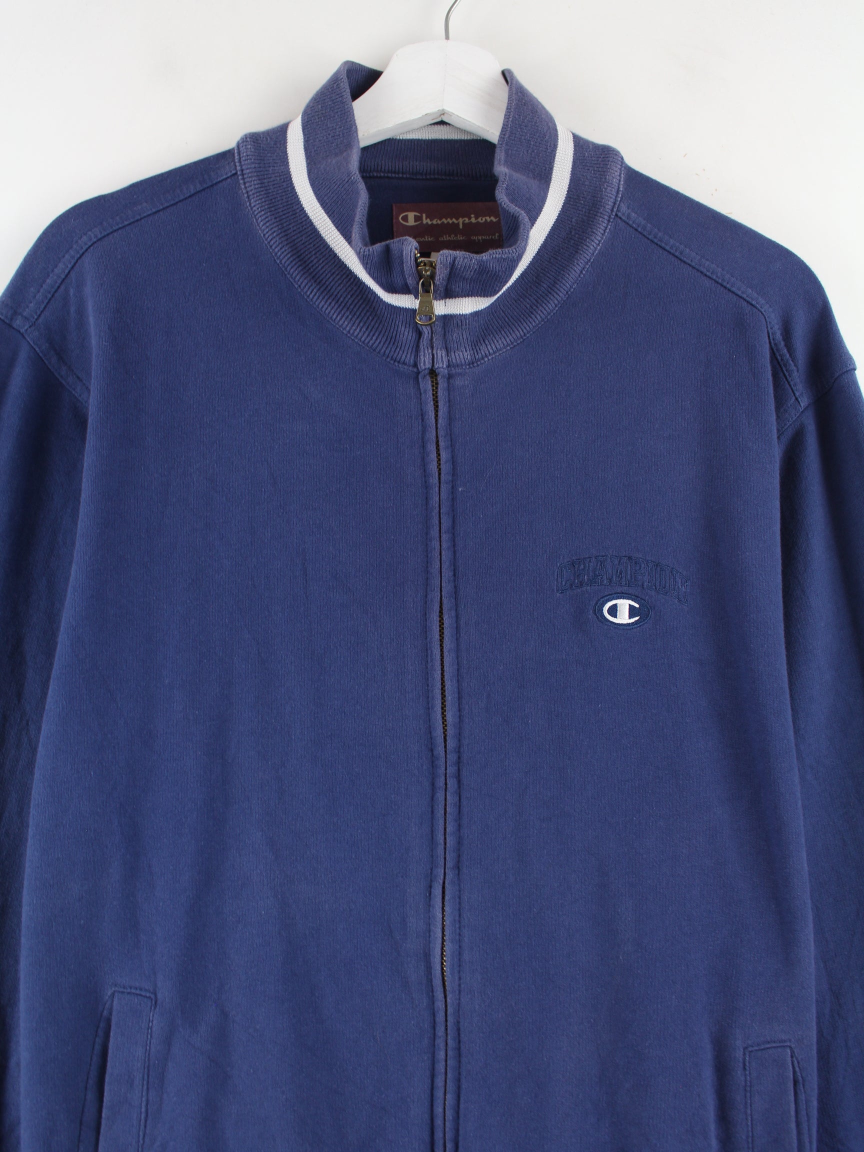 Sweatjacke der Marke Champion mit Stickereien in Größe M. Sie ist aus einer Baumwollmischung gefertigt und in Blau vorrätig.