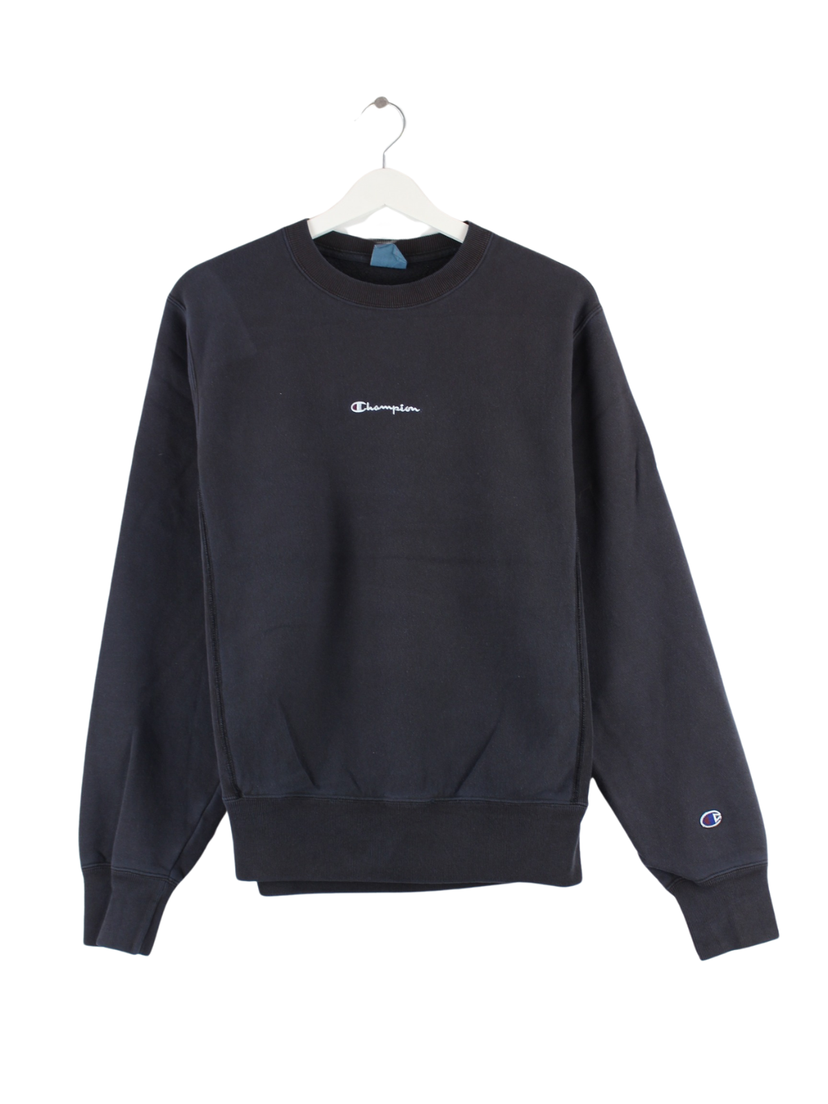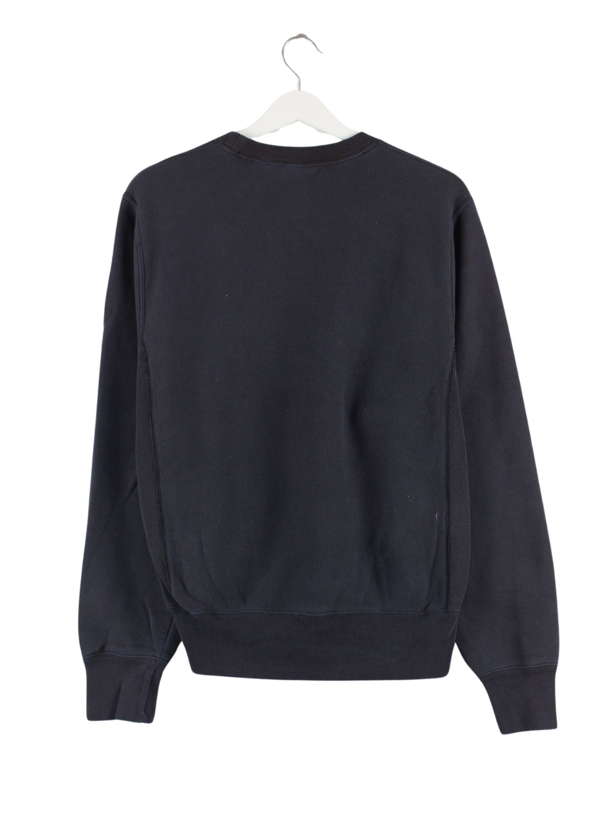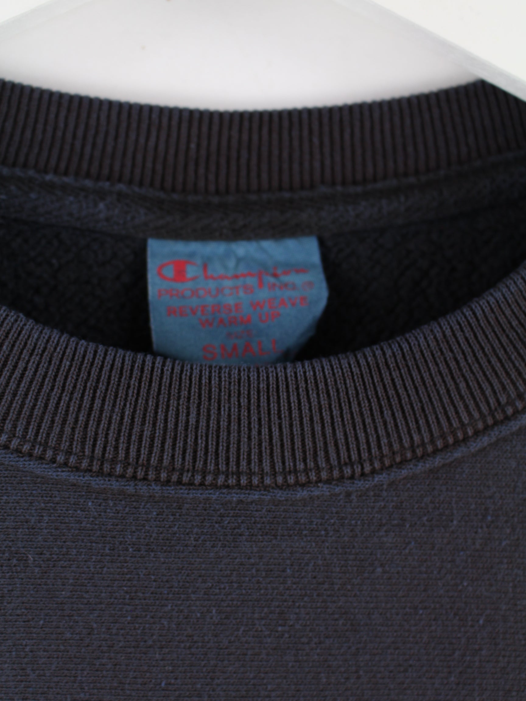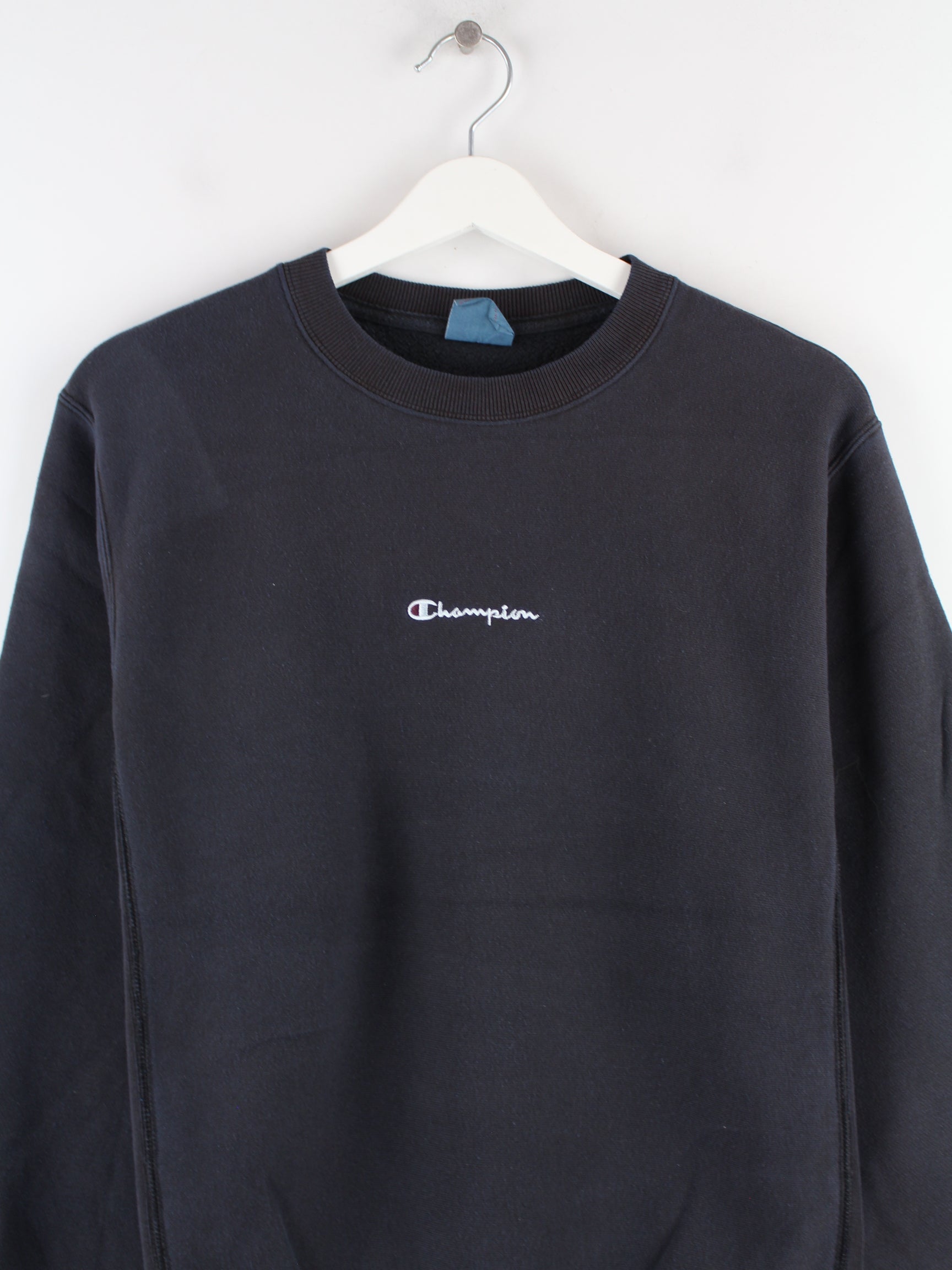 Sweater des Labels Champion mit Stickereien in Größe S. Er ist aus einer Baumwollmischung angefertigt und in Blau vorrätig.