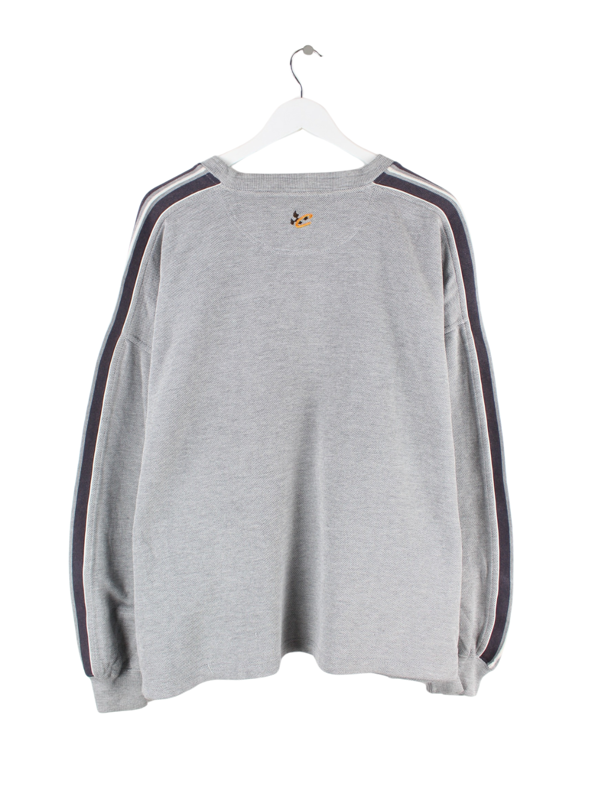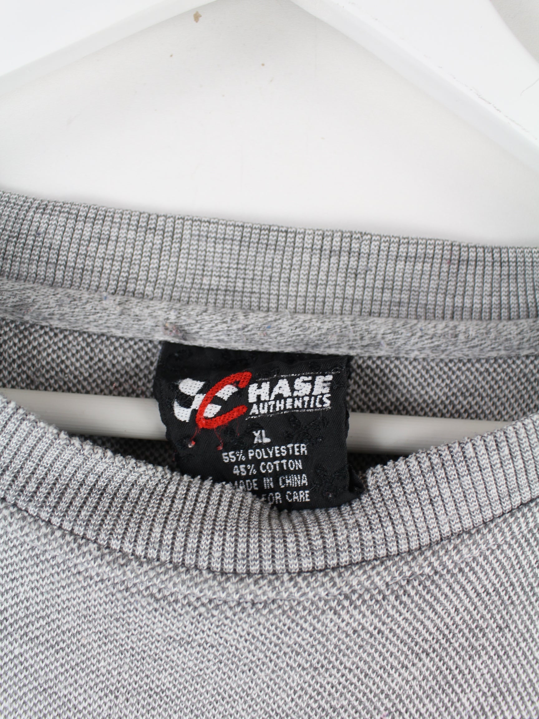 Grauer Sweater mit gesticktem Logo vom Label Chase aus den 90'ern in Größe XL. Er ist aus einer Baumwollmischung angefertigt und in gutem Zustand bei uns vorrätig.