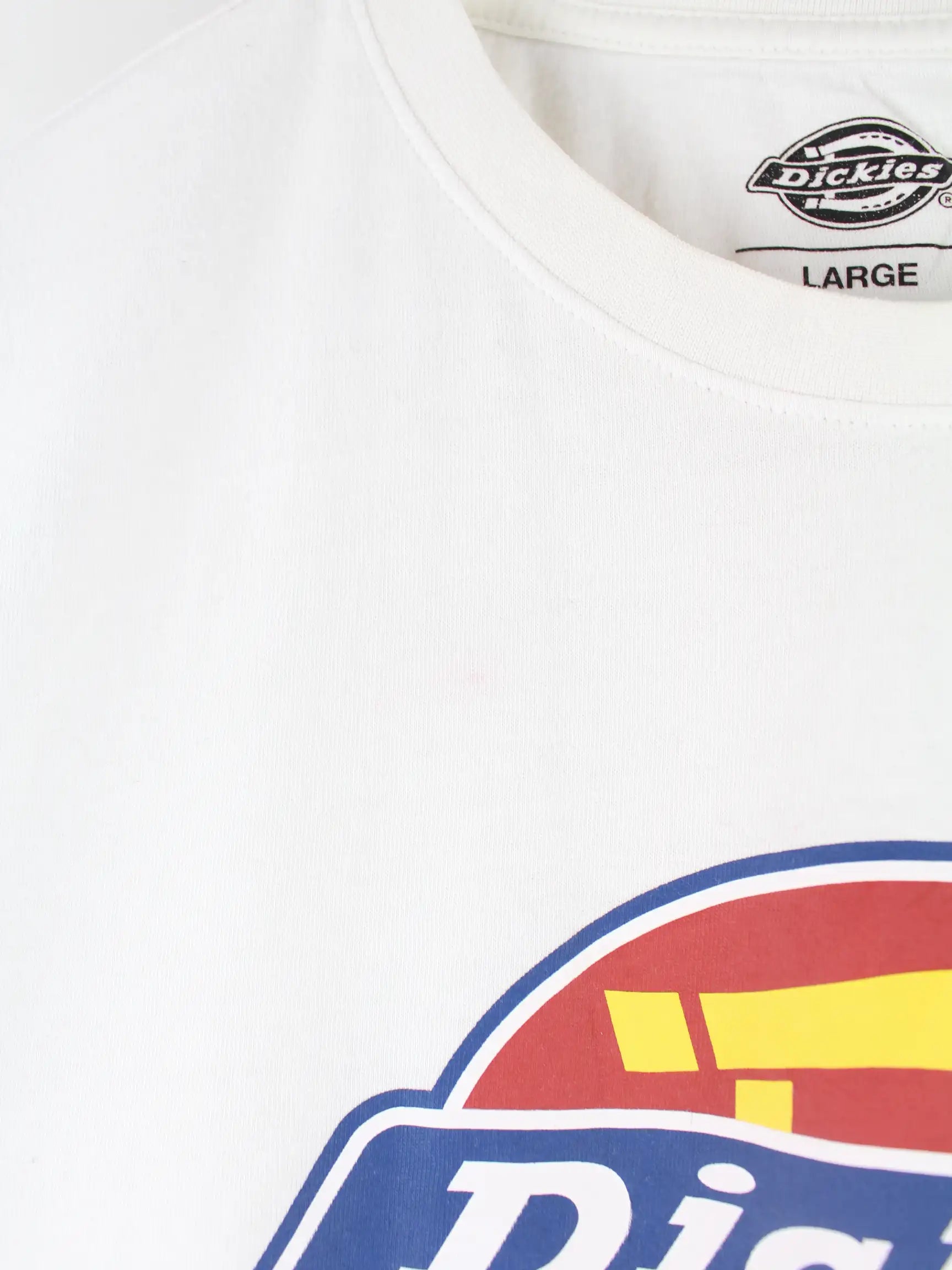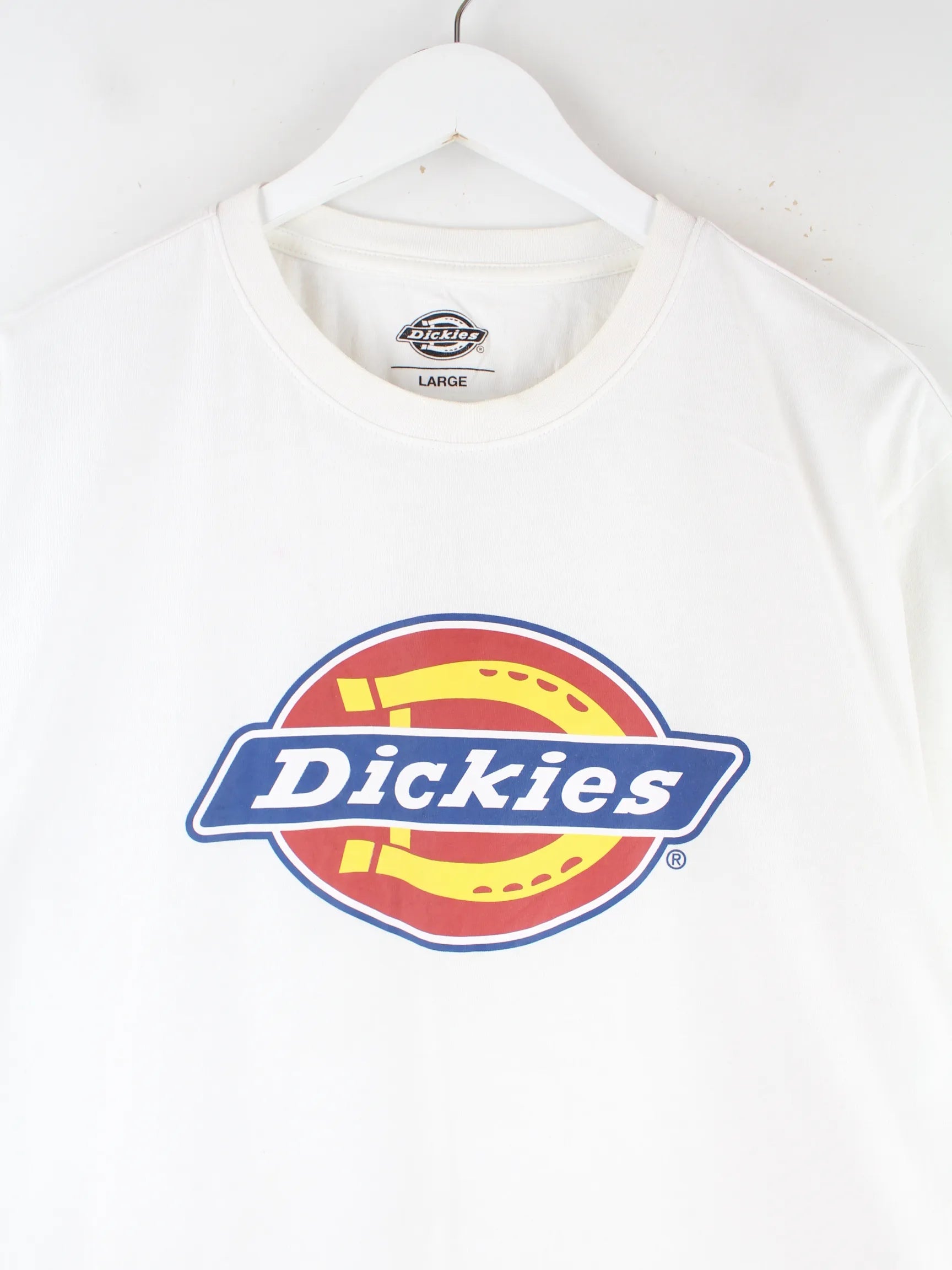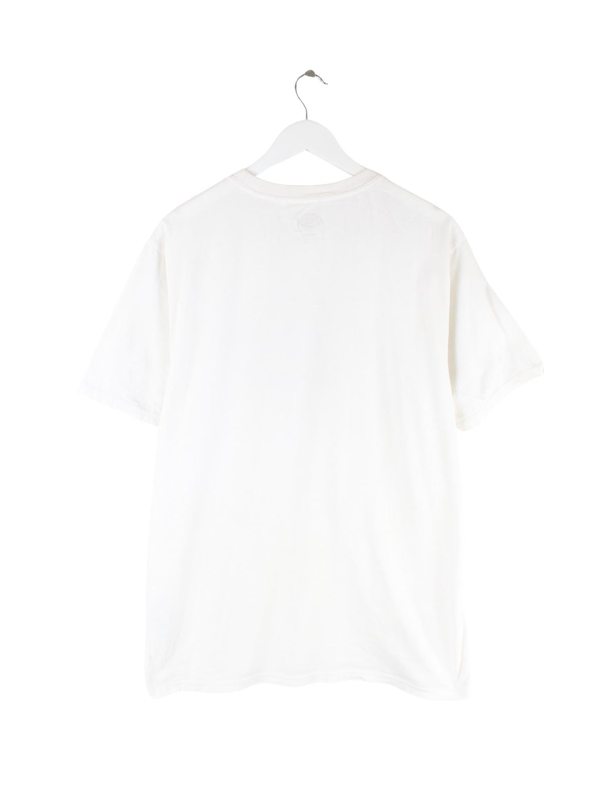 Weißes T-Shirt aus dem Hause Dickies in Größe L. Es ist aus Baumwolle gemacht und in gutem Zustand vorrätig. Mit schickem Logo Print.