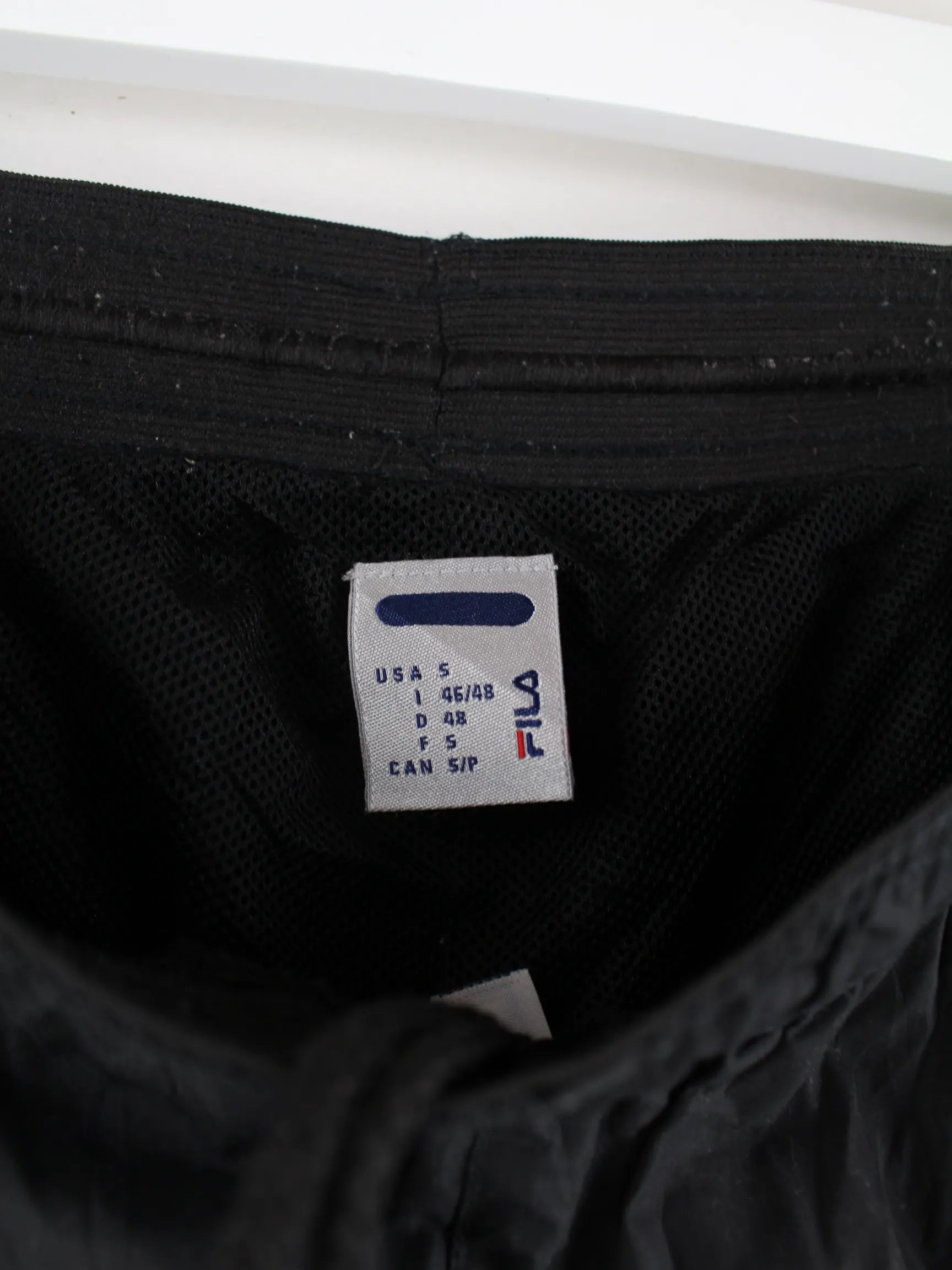 Schwarze Track Pants aus dem Hause Fila in Größe S. Sie sind aus Synthetik produziert und in sehr gutem Zustand bei uns vorrätig.