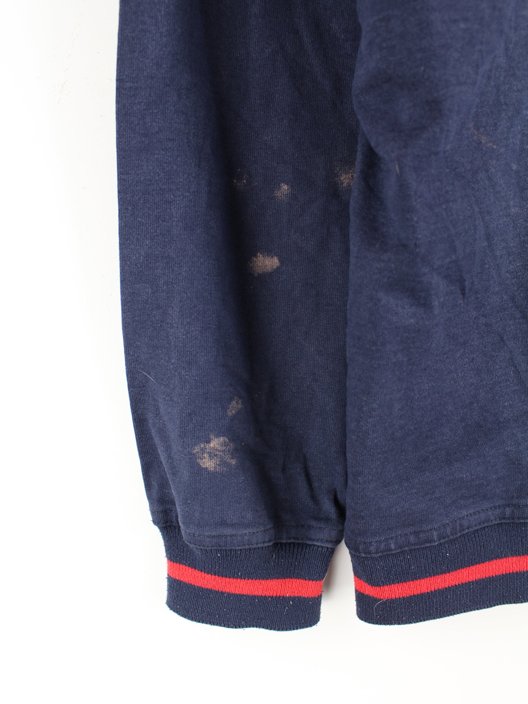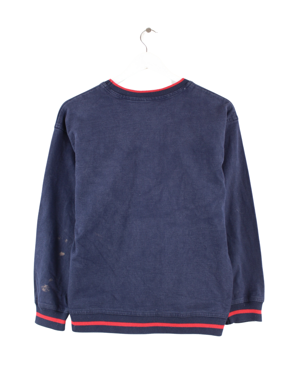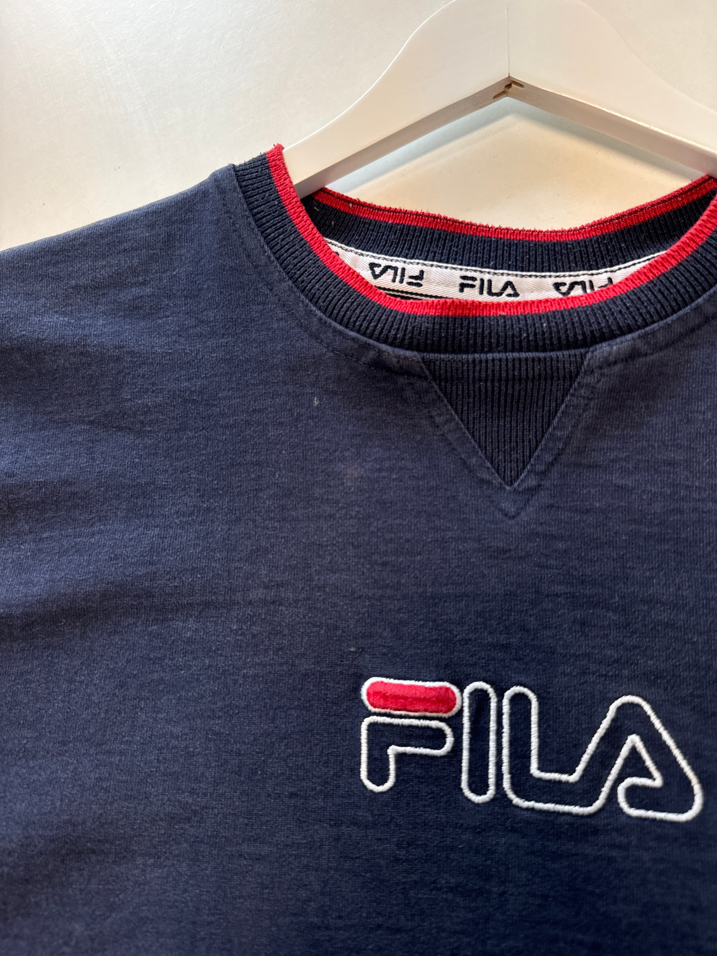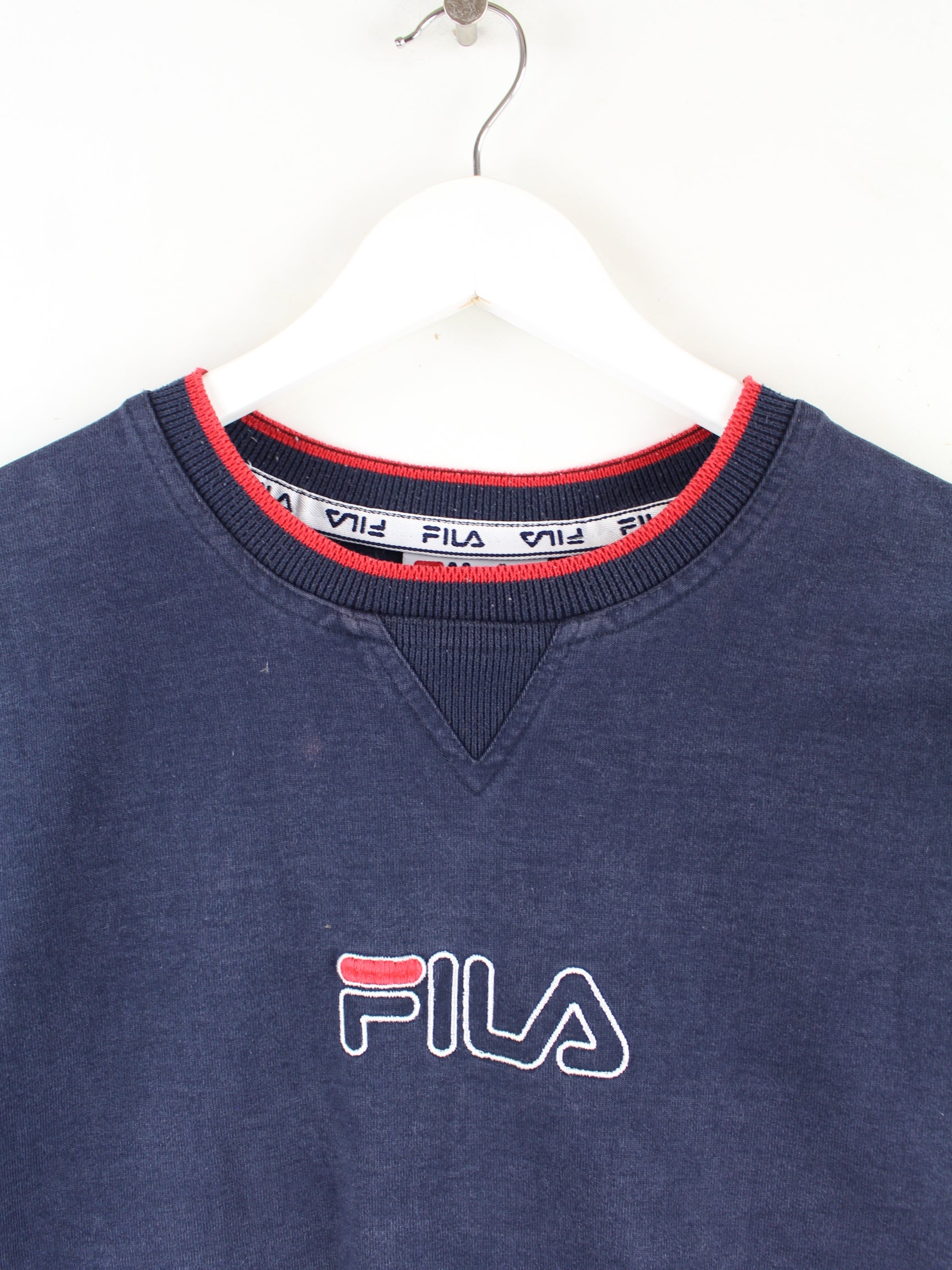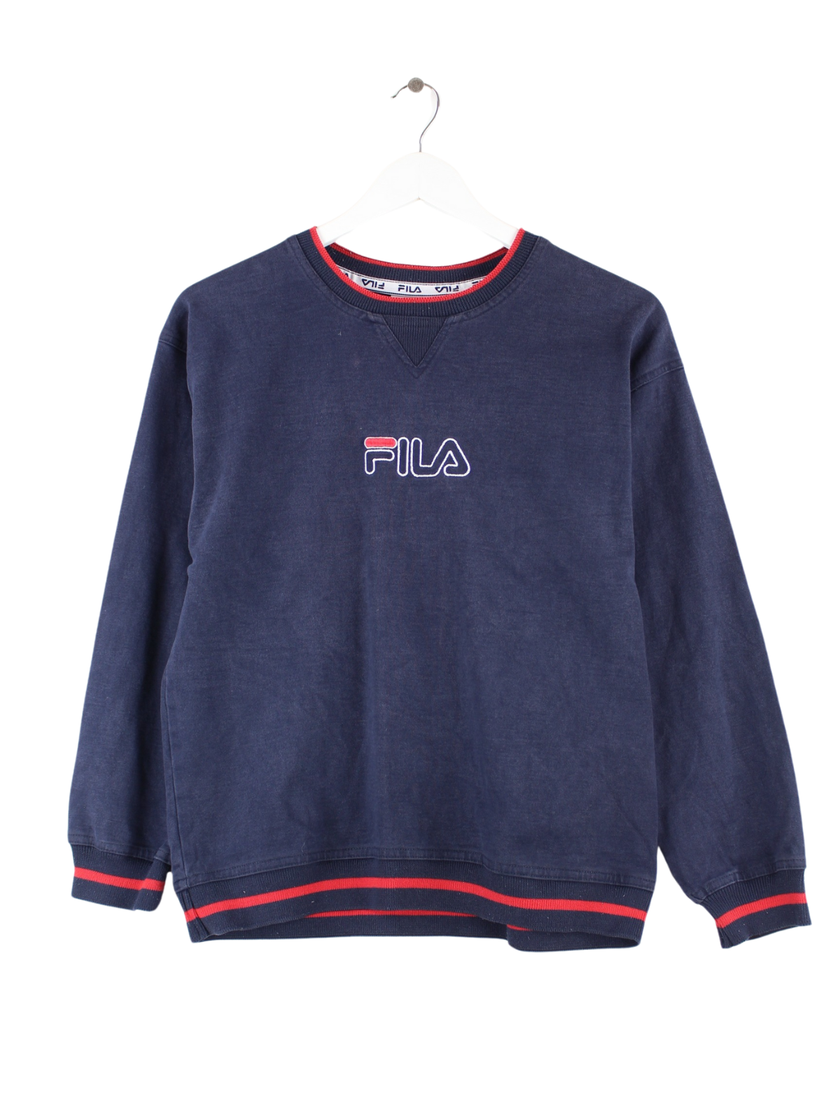 Blauer Sweater mit gestickten Motiven der Marke Fila in Größe S. Er ist aus einer Baumwollmischung gemacht und in gutem Zustand in Stock.