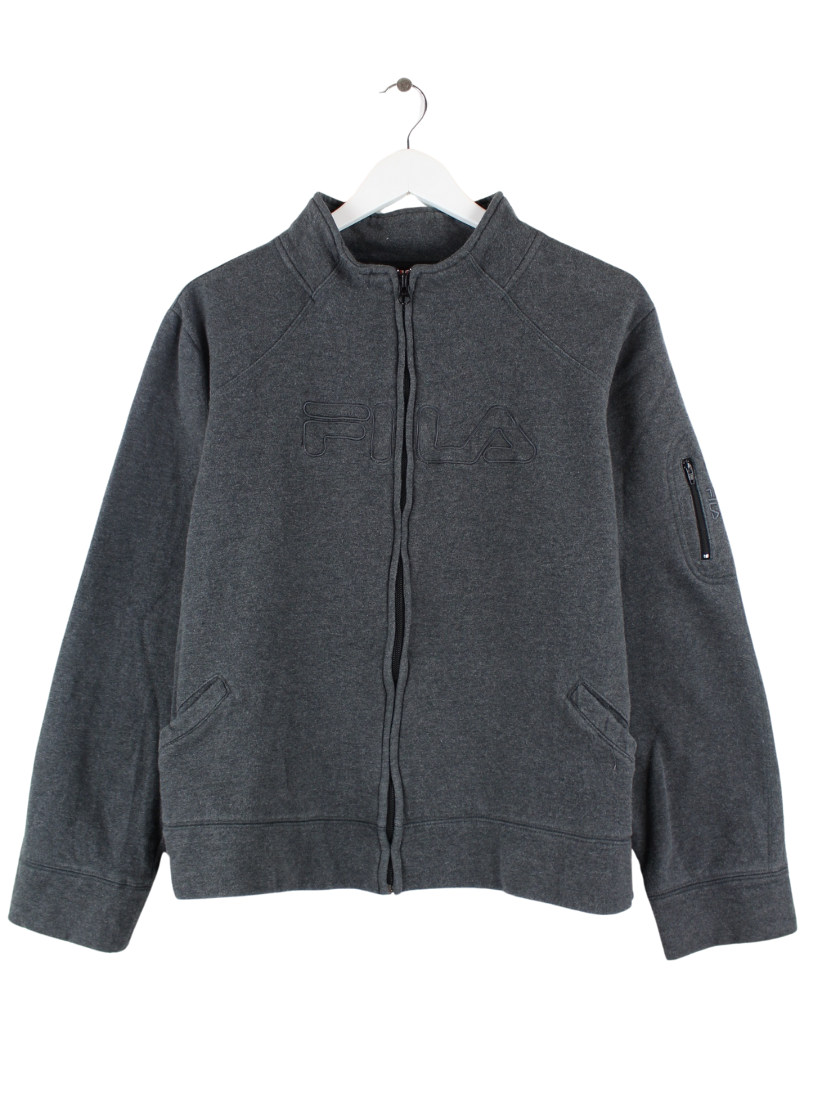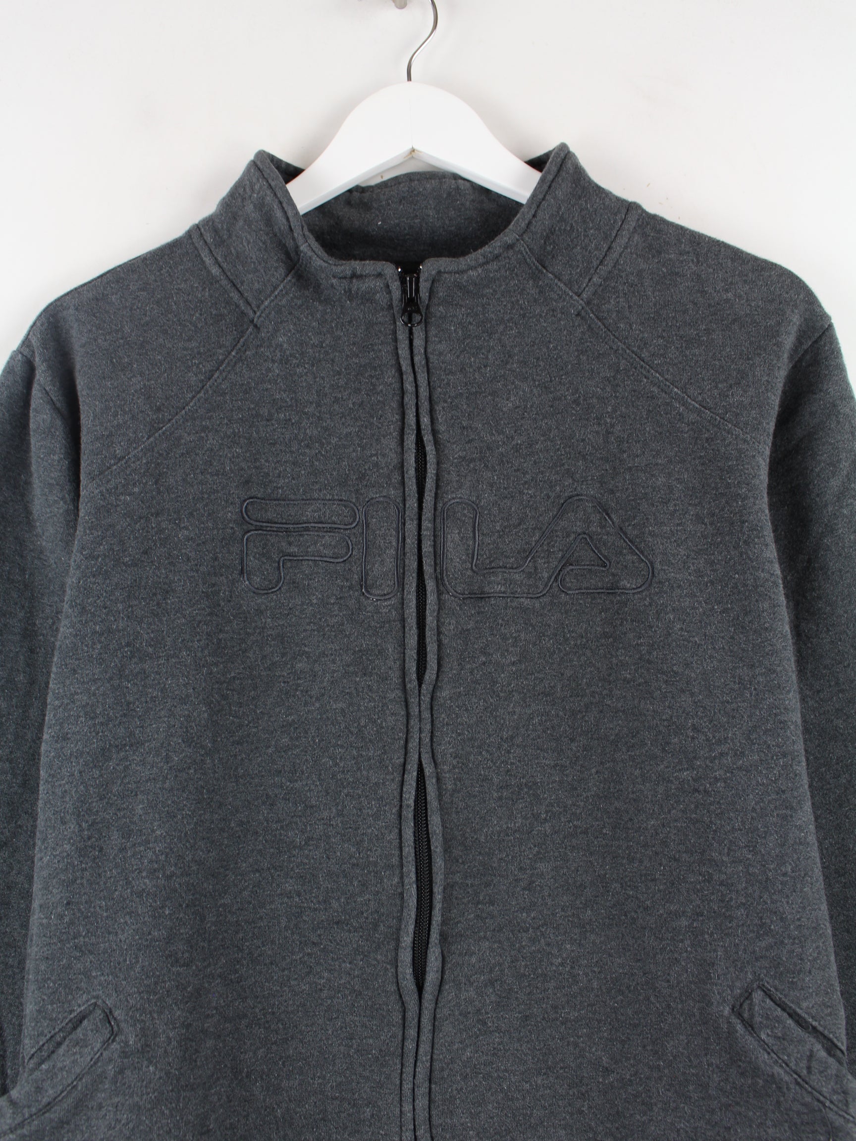 Sweatjacke vom Label Fila mit gesticktem Logo in Größe M. Sie ist aus einer Baumwollmischung und in Grau zu bekommen.