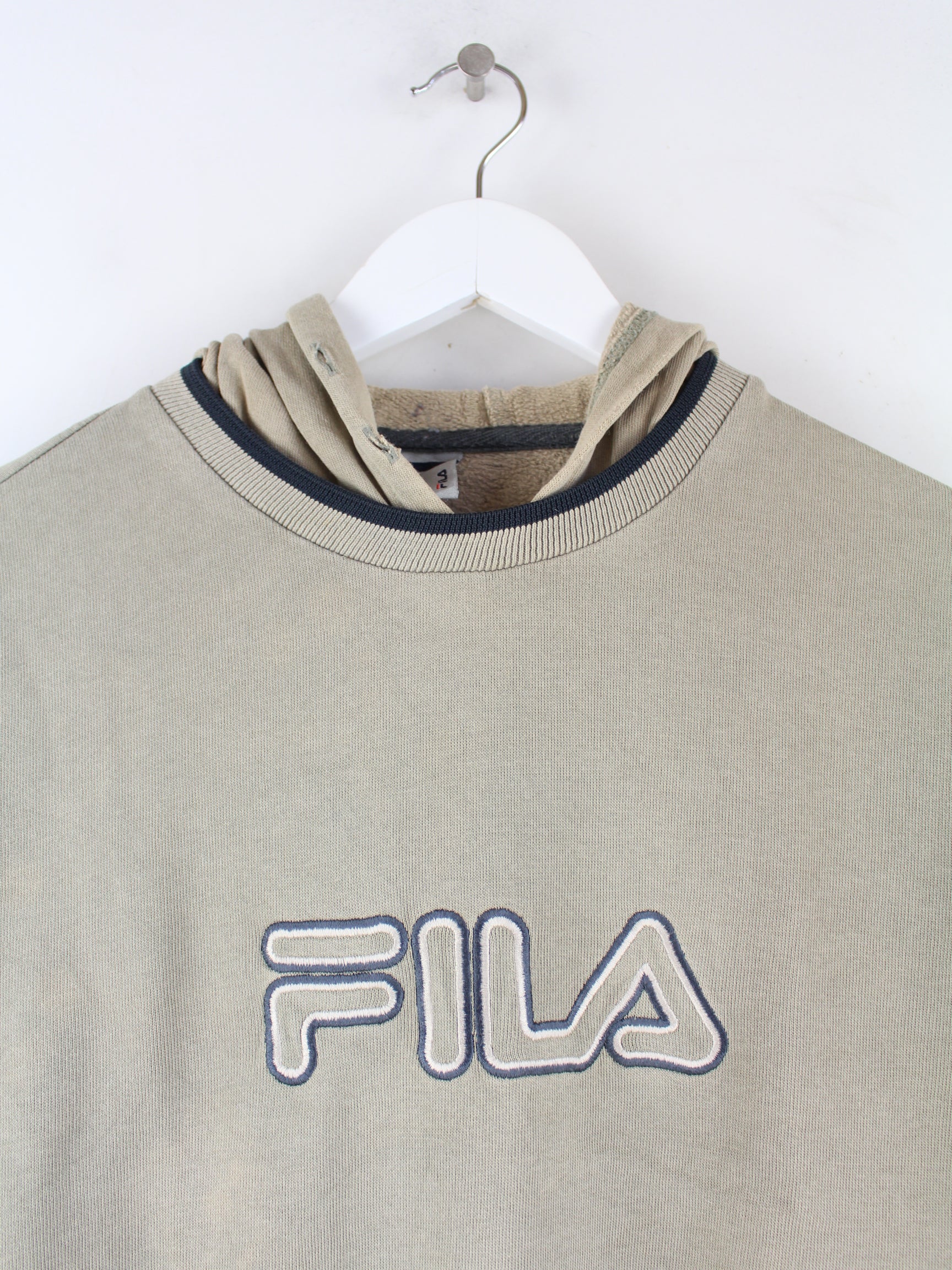 Beigefarbener Hoodie mit Stickereien vom Brand Fila in Größe M. Er ist aus einer Baumwollmischung gemacht und in sehr gutem Zustand im Angebot.