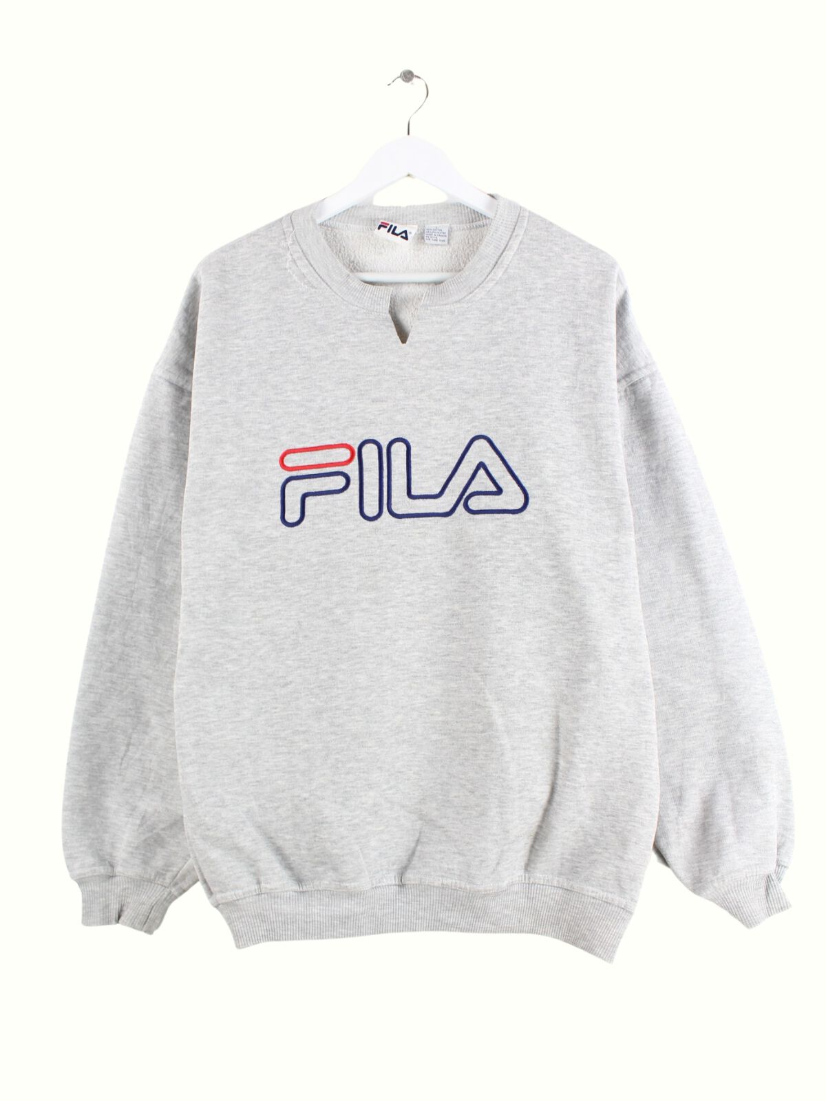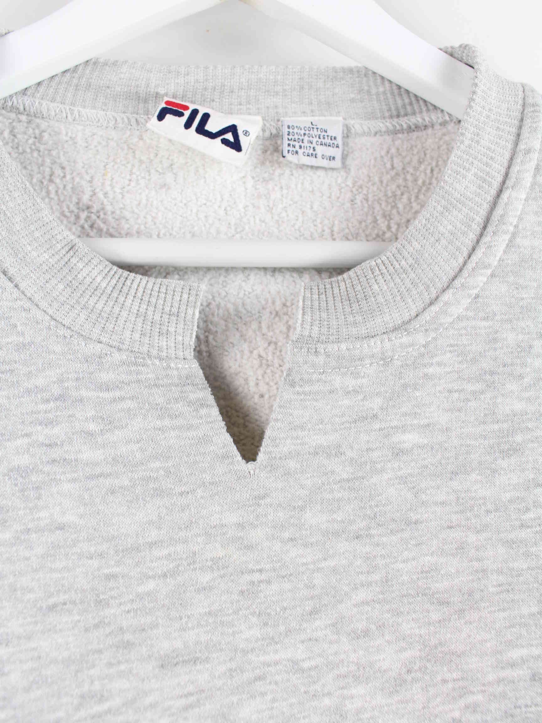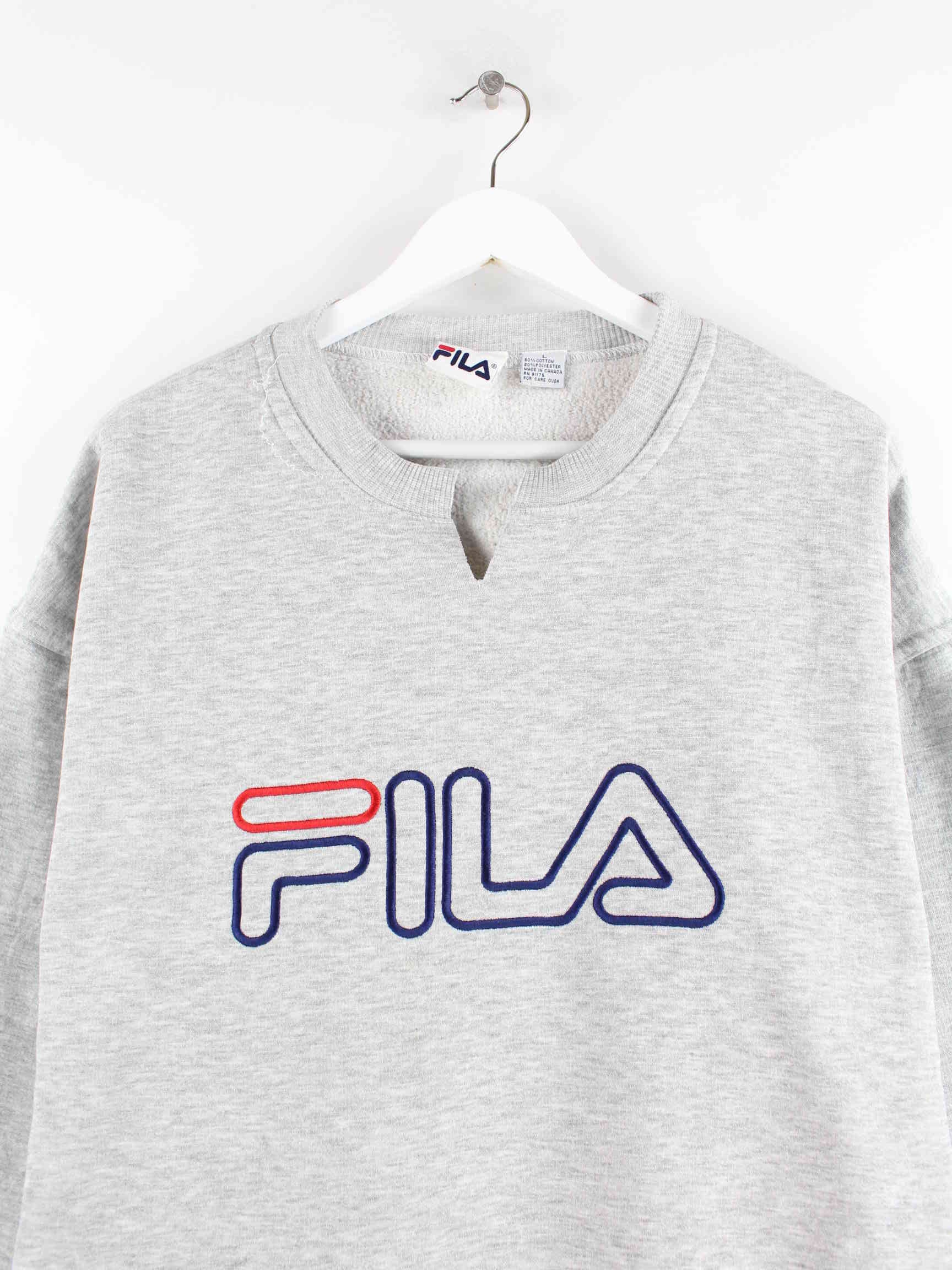Grauer Sweater mit gesticktem Logo vom Label Fila in Größe L. Er ist aus einer Baumwollmischung produziert. Den Zustand würden wir als 'In Ordnung' bezeichnen (vergl. Bilder).