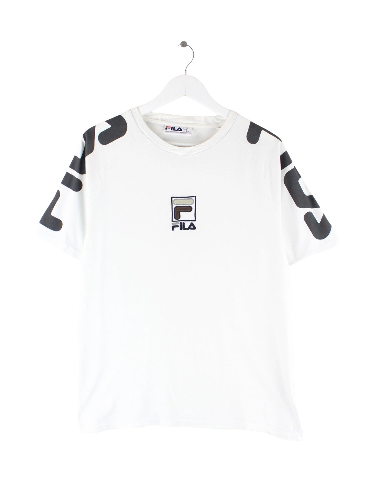 Weißes T-Shirt mit Stick der Brand Fila in Größe M. Es ist aus Baumwolle und in gutem Zustand zu bekommen.