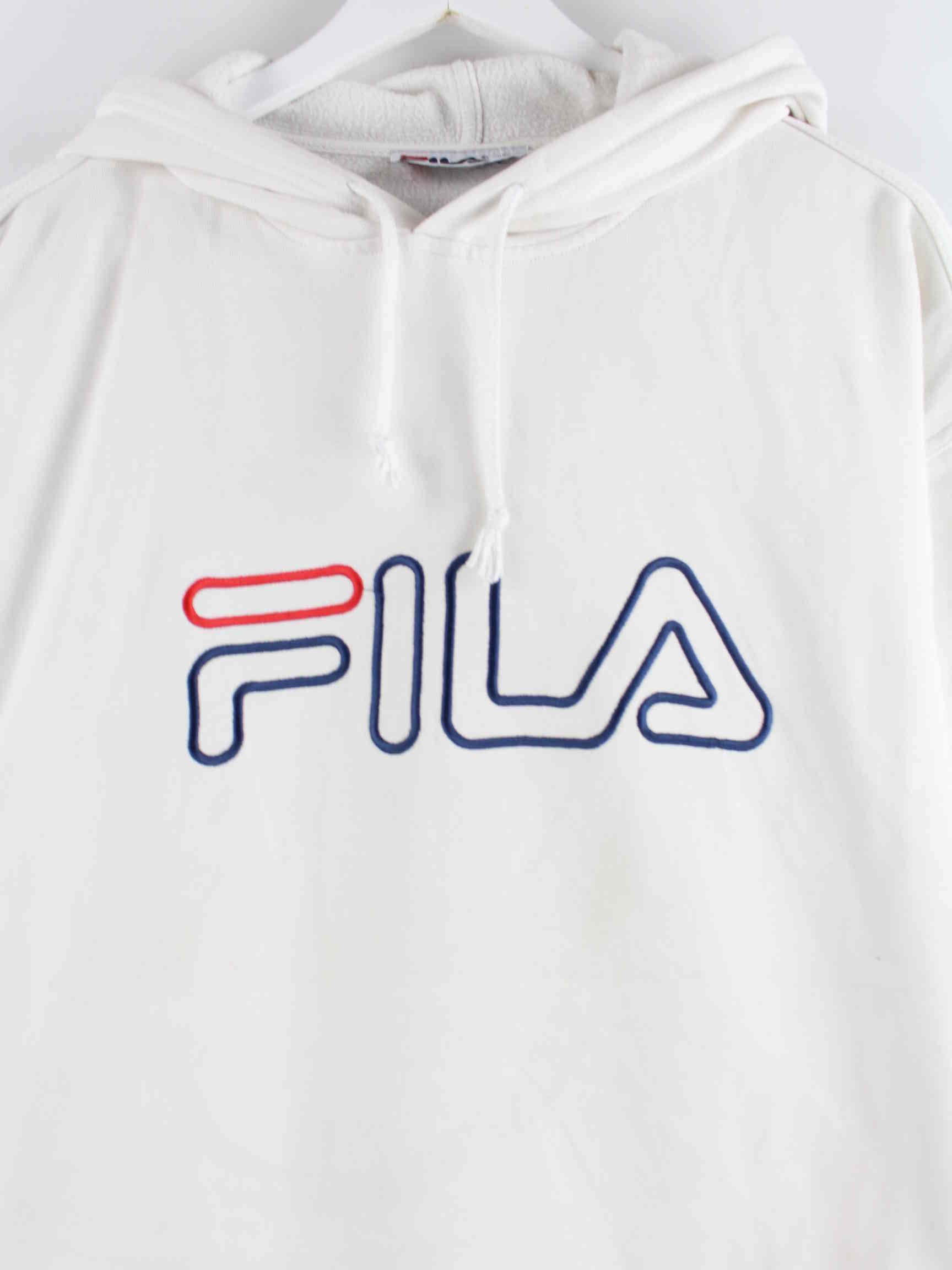 Hoodie des Labels Fila mit Stickereien in Größe XL aus Anfang der 2000'er. Er ist aus einer Baumwollmischung gemacht und in Weiß vorrätig.