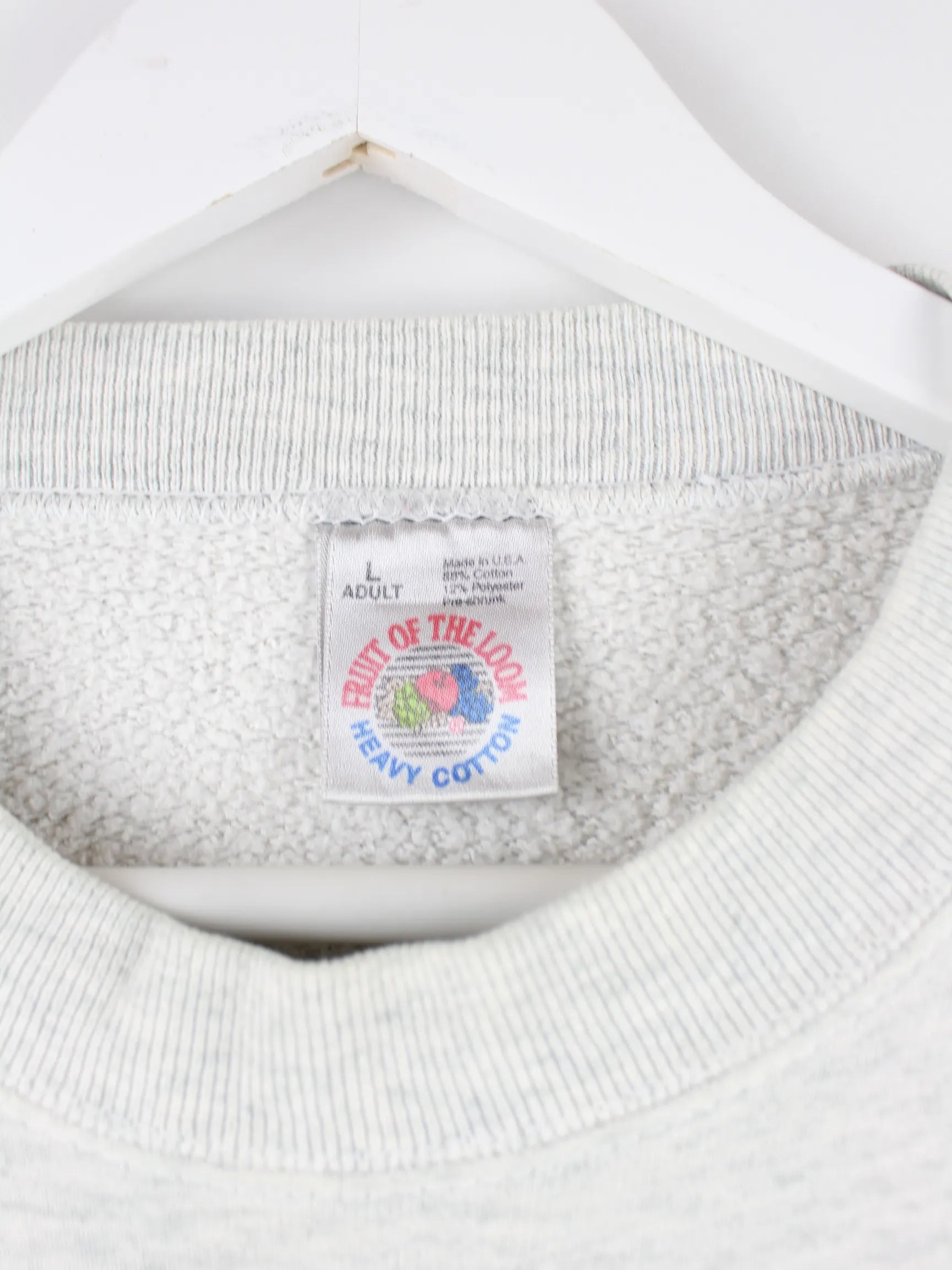 Grauer Sweater von Fruit of the Loom aus den 90'ern in Größe L. Er ist aus einer Baumwollmischung gefertigt und in sehr gutem Zustand lieferbar.