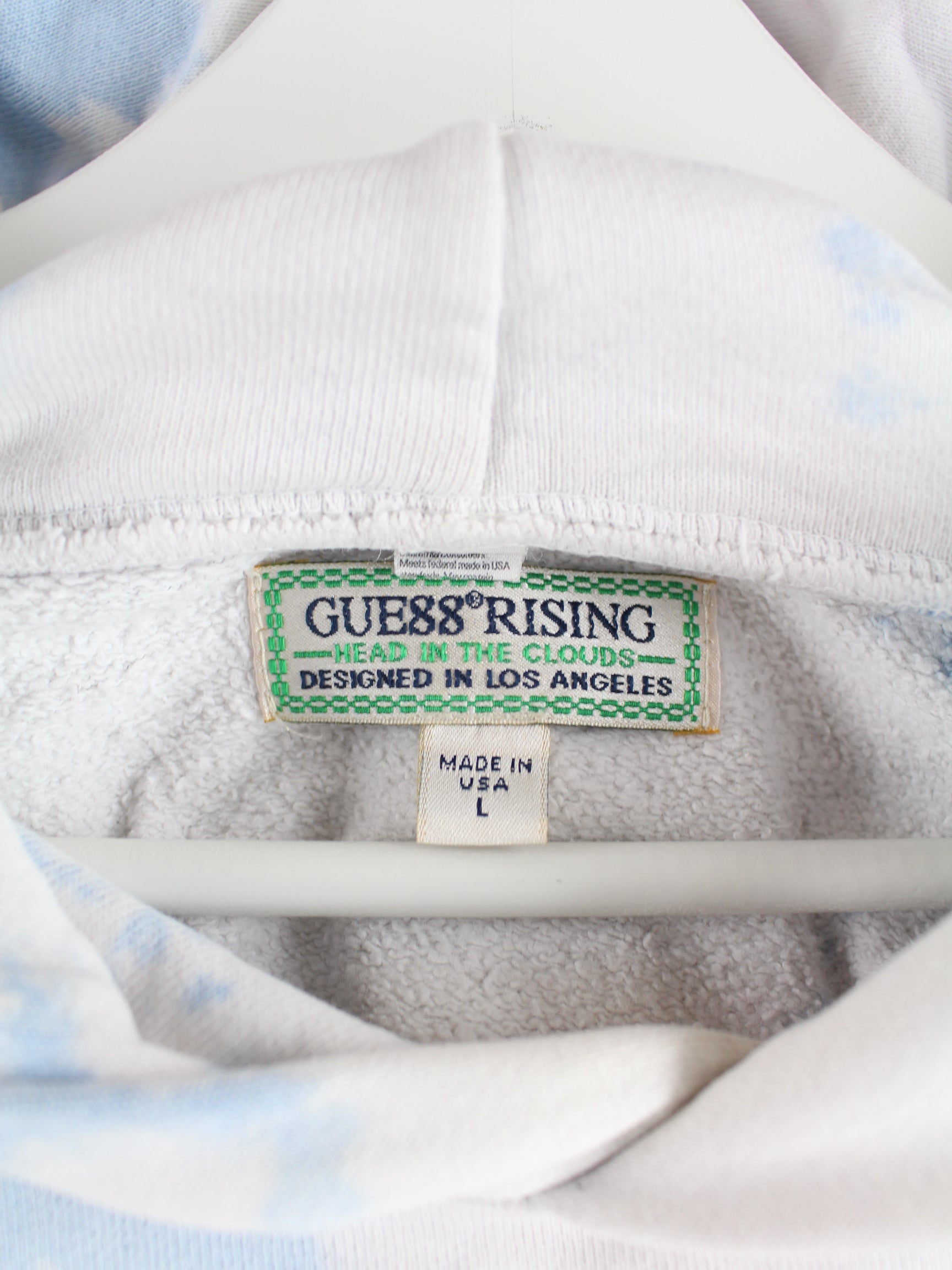 Hoodie des Labels Guess in Größe L aus den 90'ern. Er ist aus einer Baumwollmischung produziert und in Weiß zu bekommen. Mit chiquem Vintage Print.
