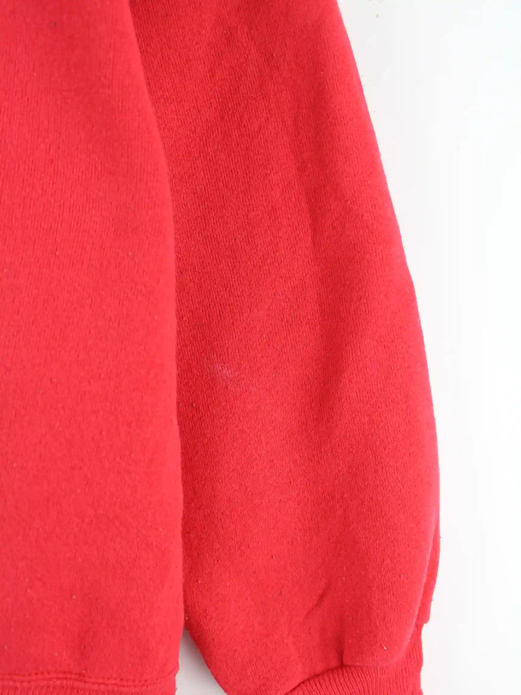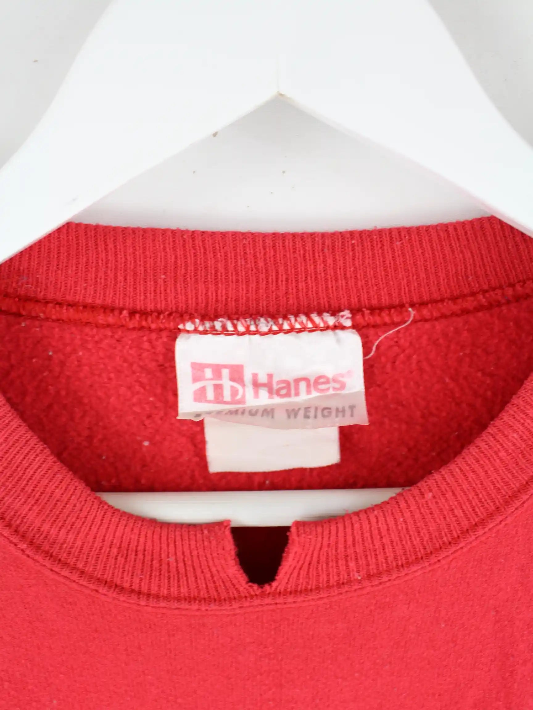 Roter Sweater mit gestickten Motiven von Hanes aus den 90'ern in Größe M. Er ist aus einer Baumwollmischung . Den Zustand würden wir als 'In Ordnung' bezeichnen (vergl. Bilder).