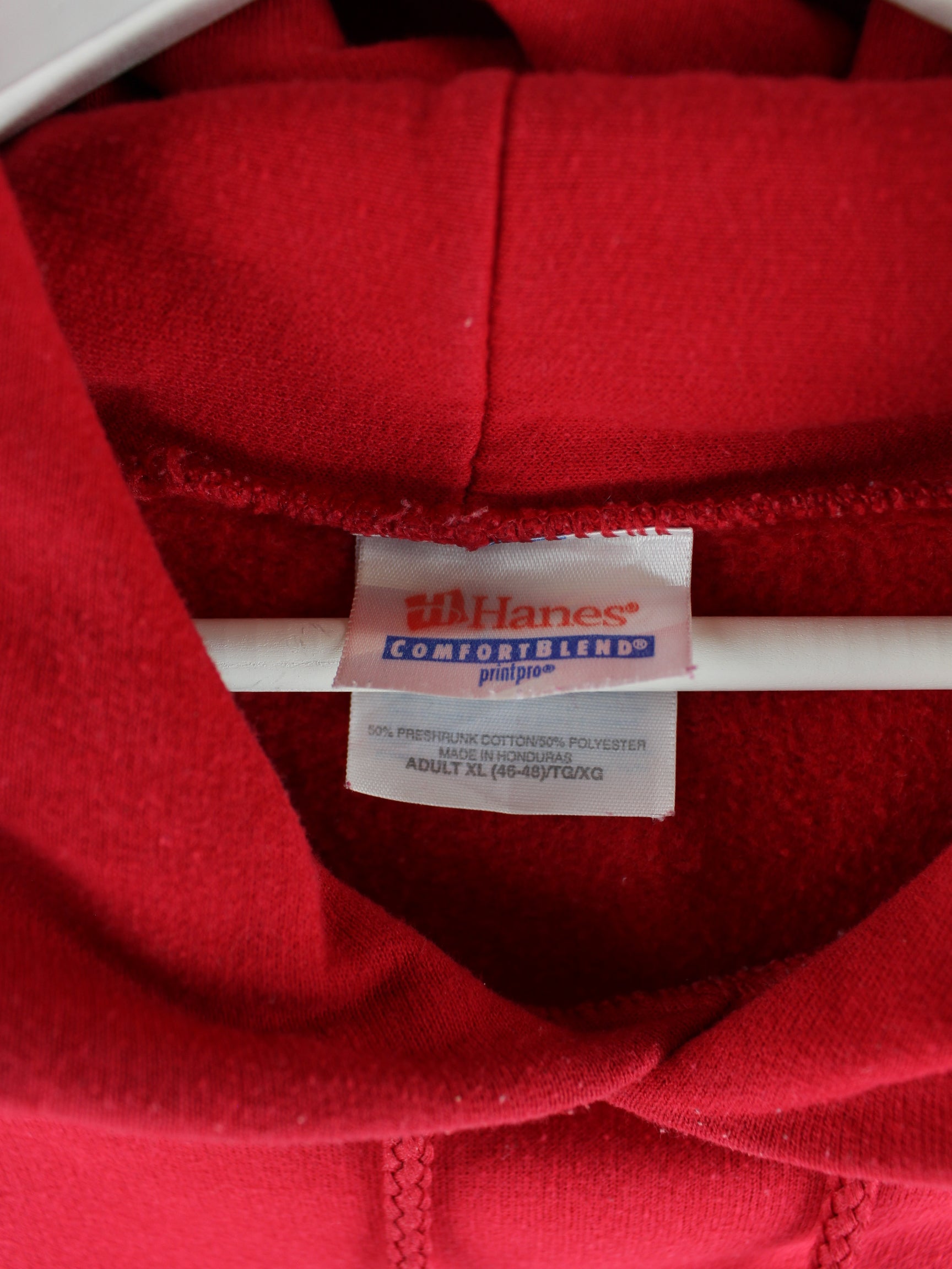 Roter Hoodie aus dem Hause Hanes in Größe XL. Er ist aus einer Baumwollmischung gefertigt. Den Zustand würden wir als 'In Ordnung' bezeichnen (vergl. Bilder).Mit schönem Tigers Print.