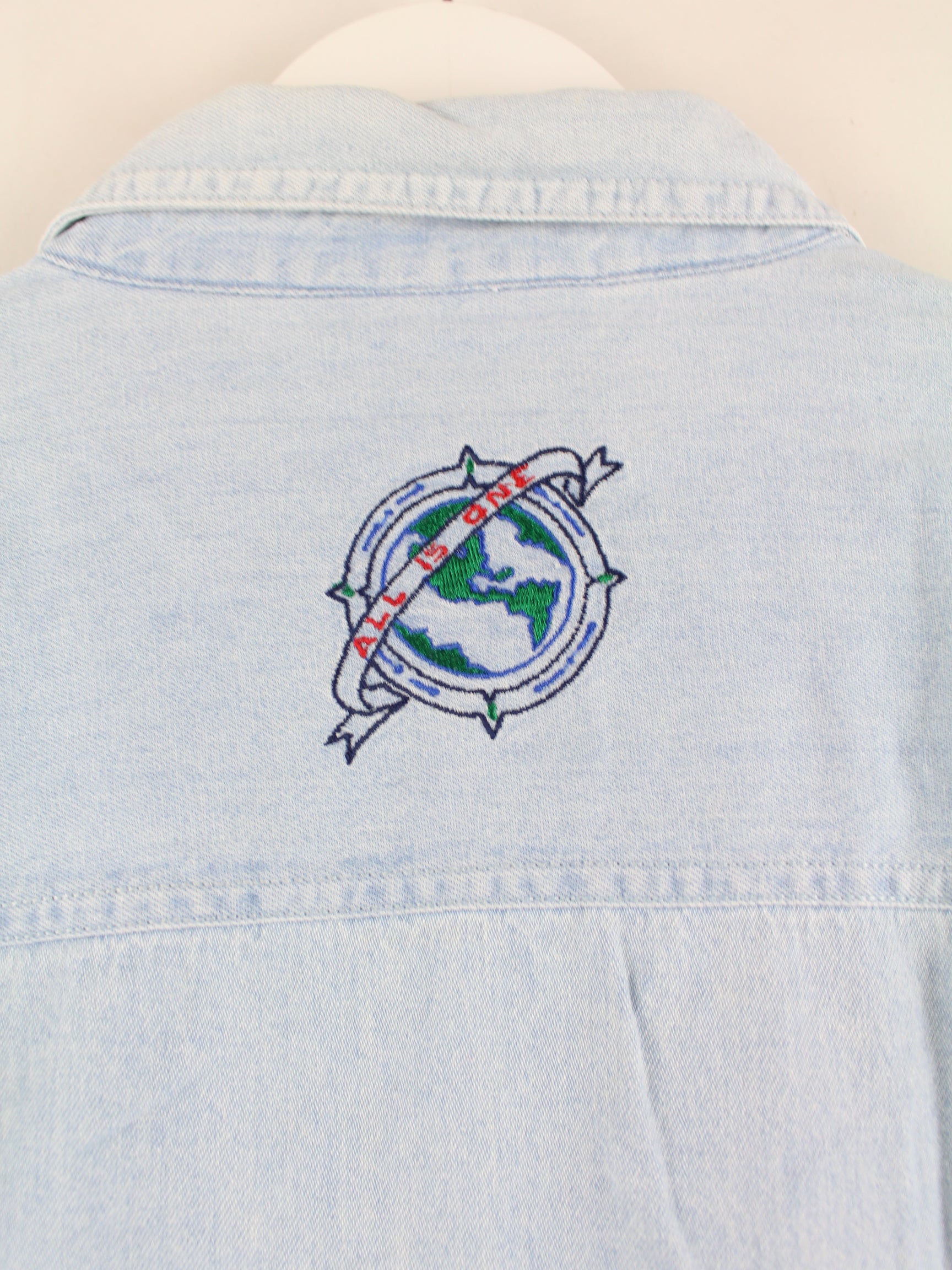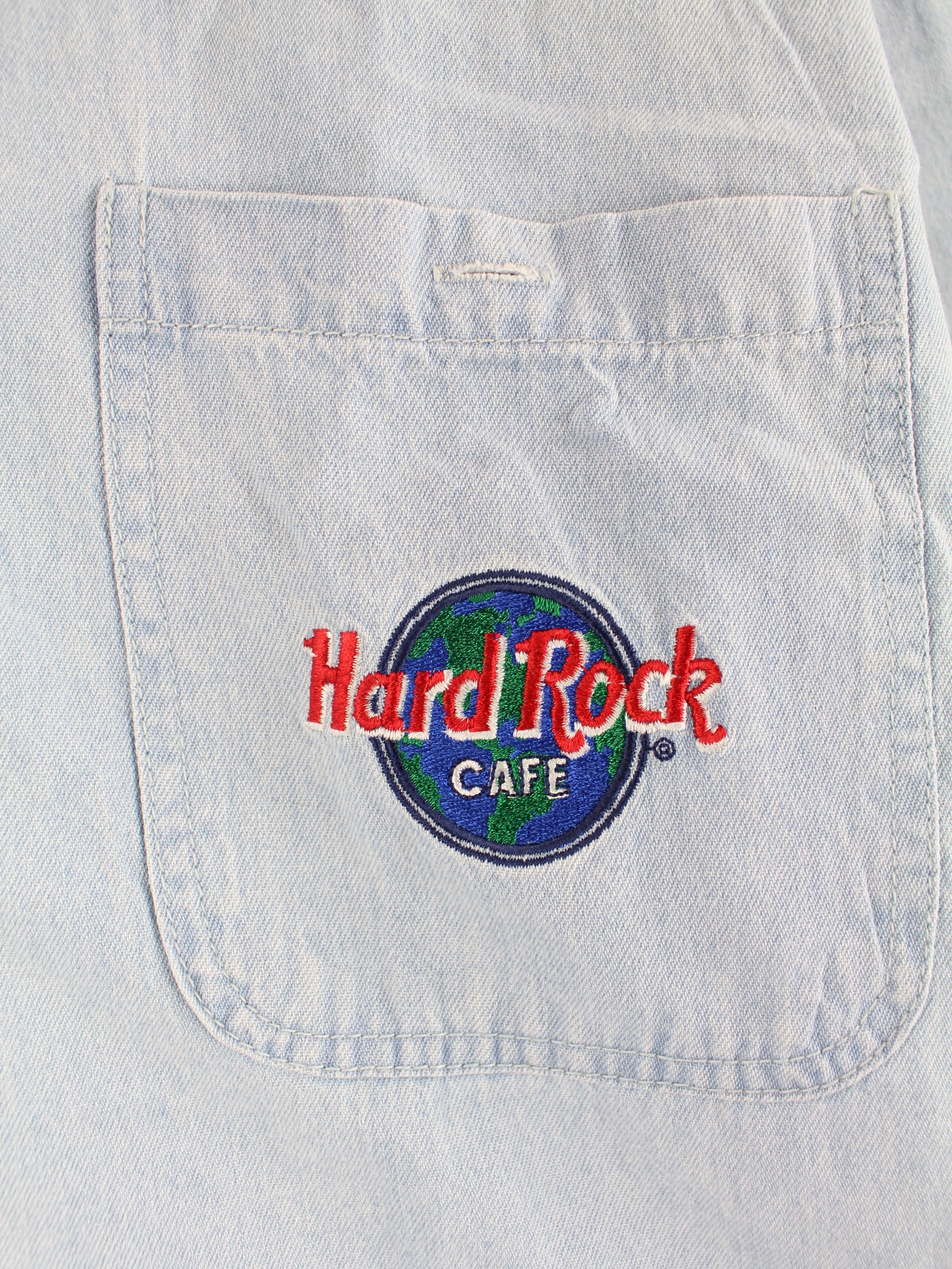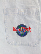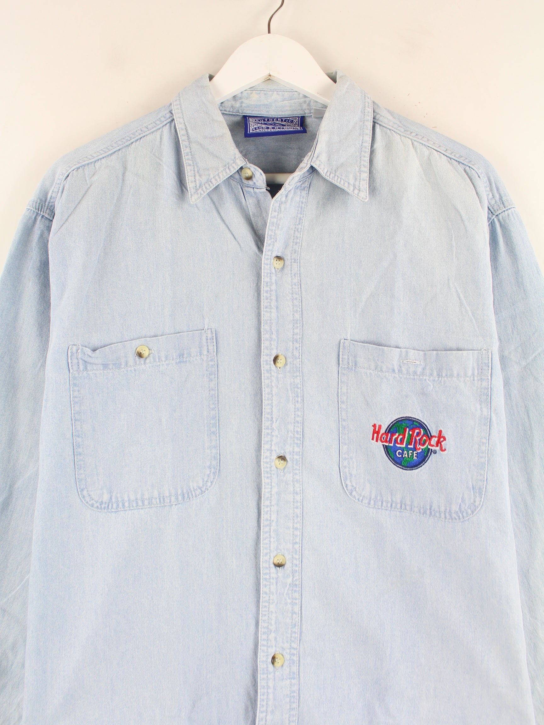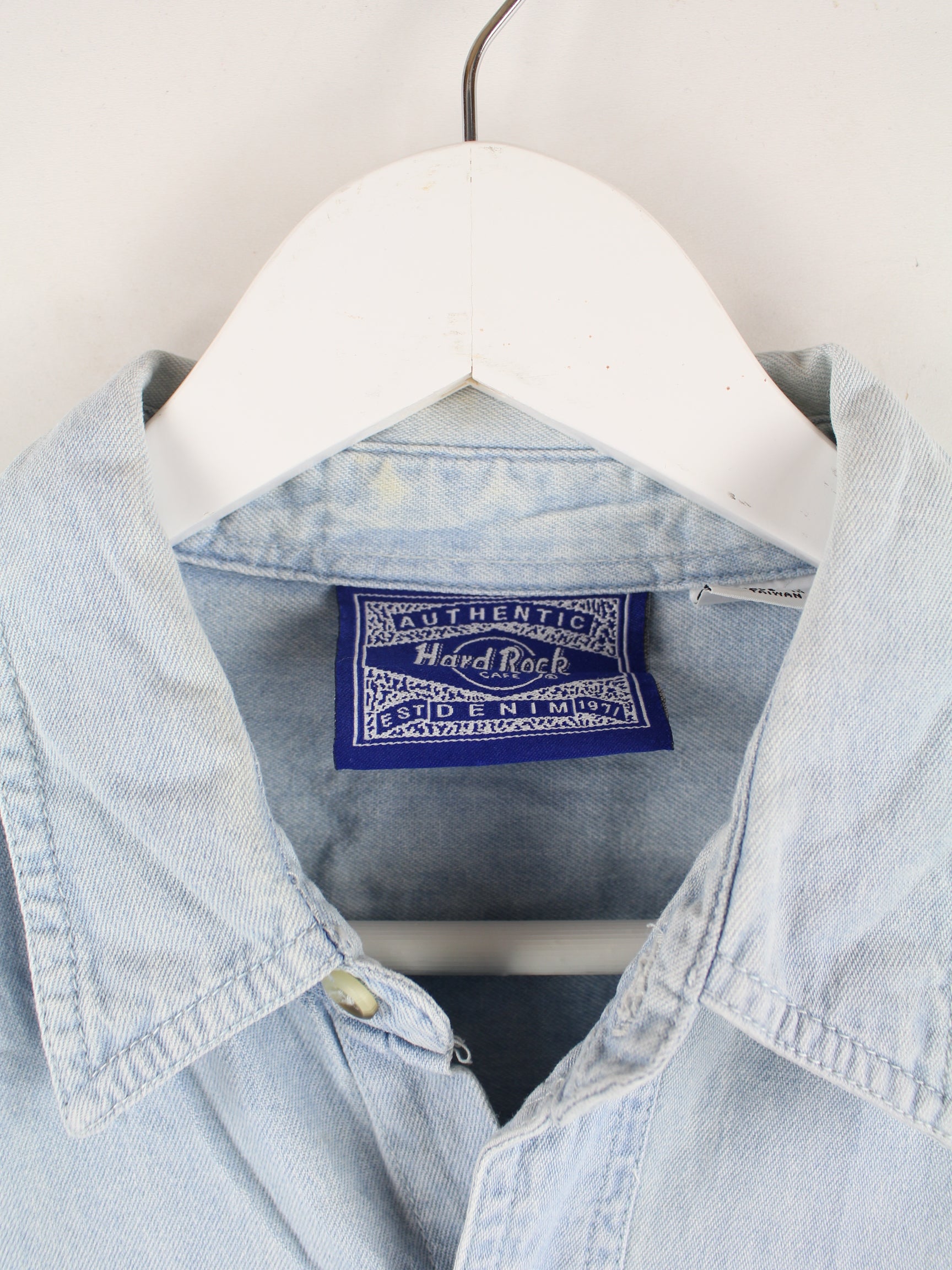 Freizeit Hemd vom Label Hard Rock Cafe mit gestickten Motiven in Größe S aus den 90'ern. Es ist aus Baumwolle angefertigt und in Blau im Angebot.