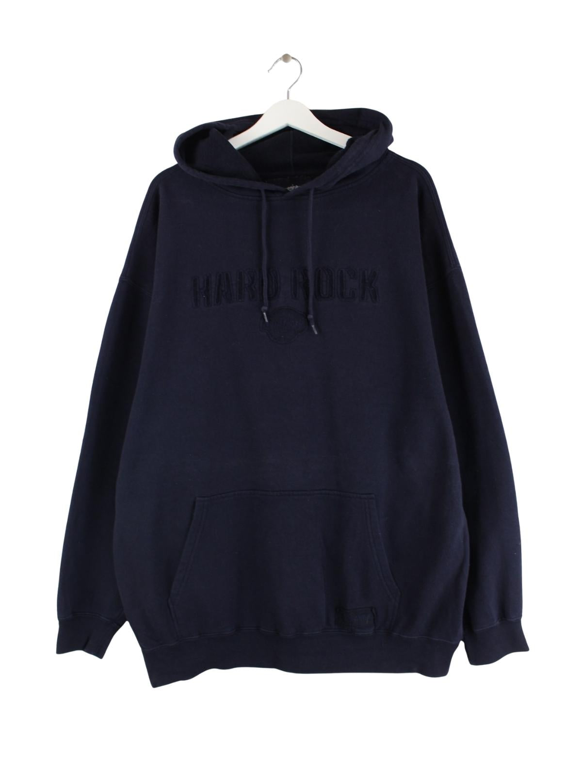 Hoodie der Brand Hard Rock Cafe in Größe 3XL mit großem Logo auf der Brust. Er ist aus einer Baumwollmischung produziert und in Blau auf Lager.
