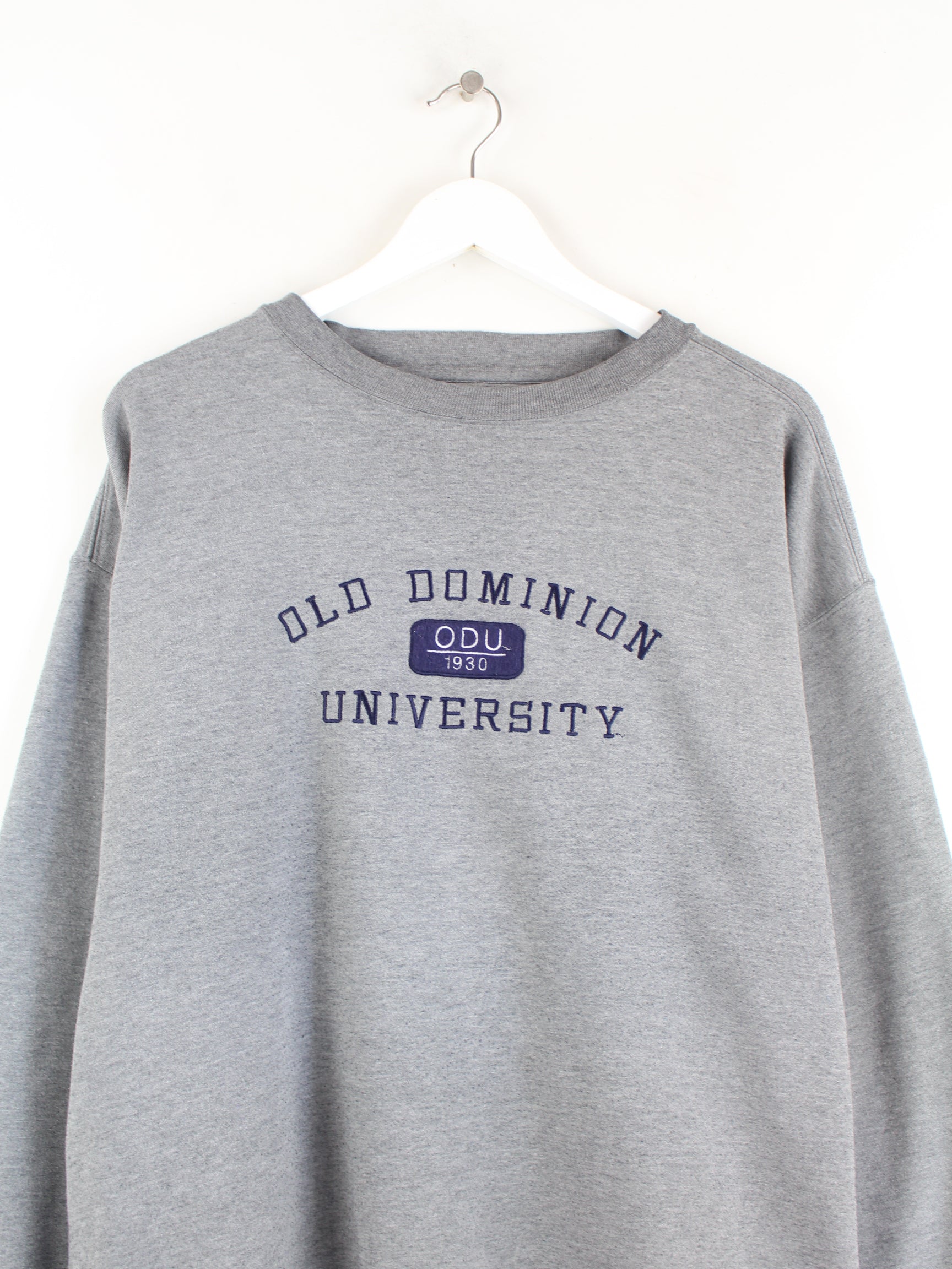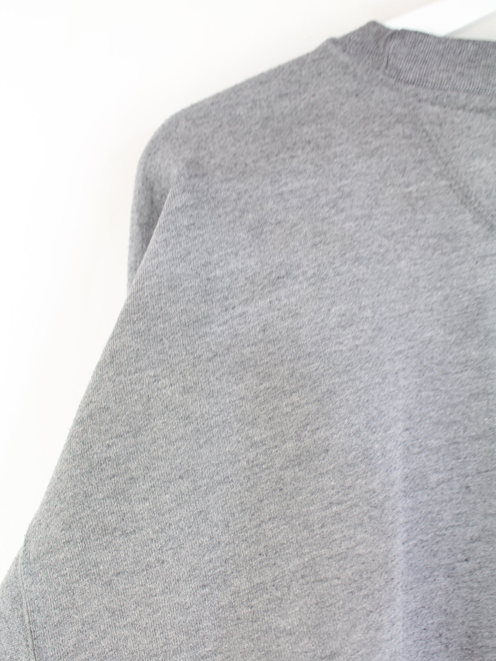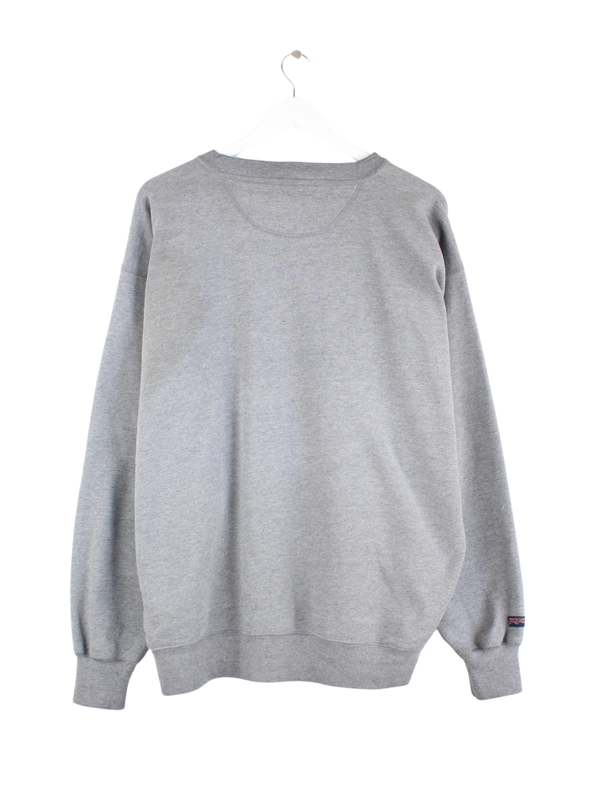 Grauer Sweater mit gestickten Motiven der Marke Jansport in Größe L. Er ist aus einer Baumwollmischung gefertigt und in gutem Zustand auf Lager.
