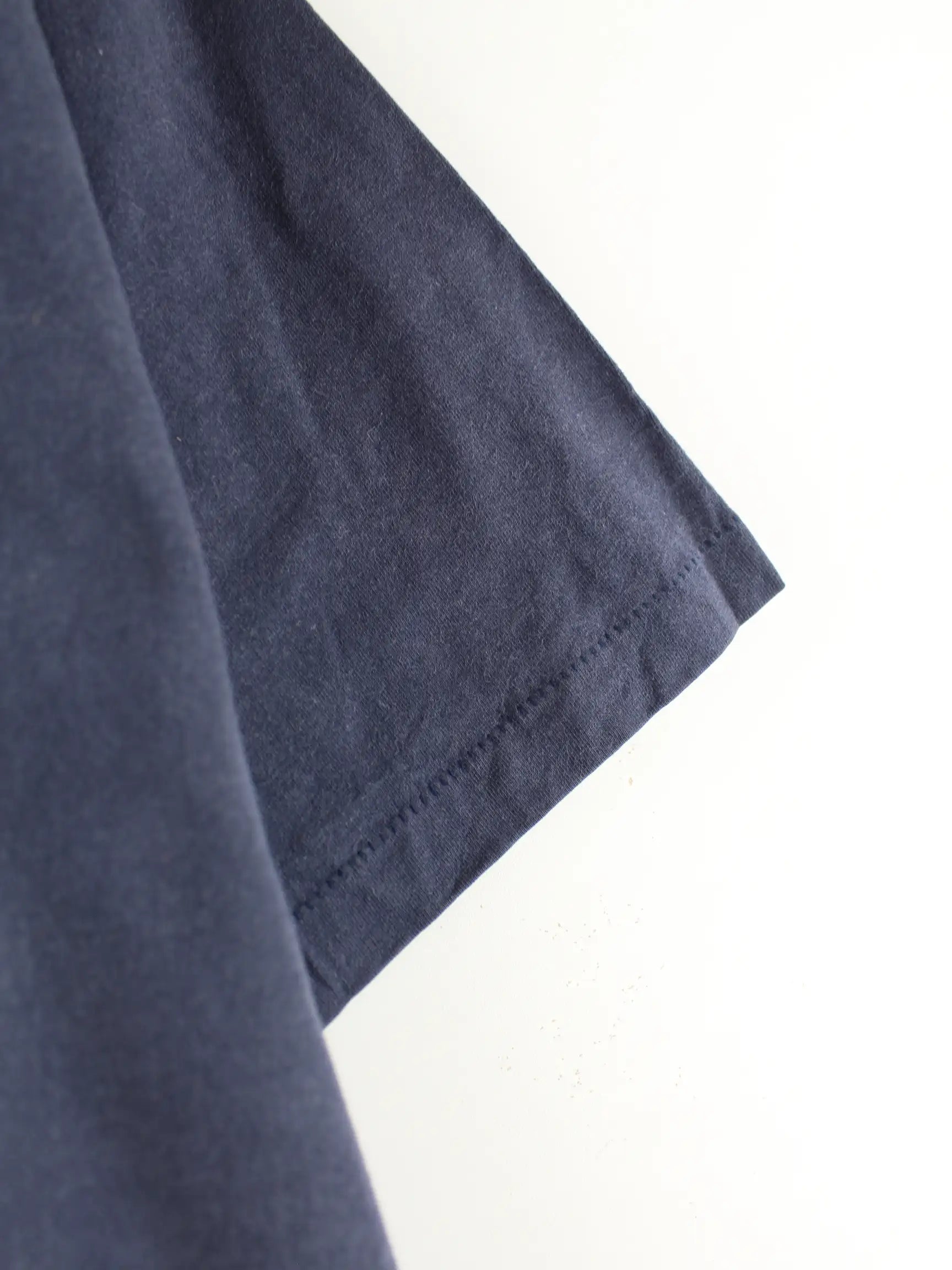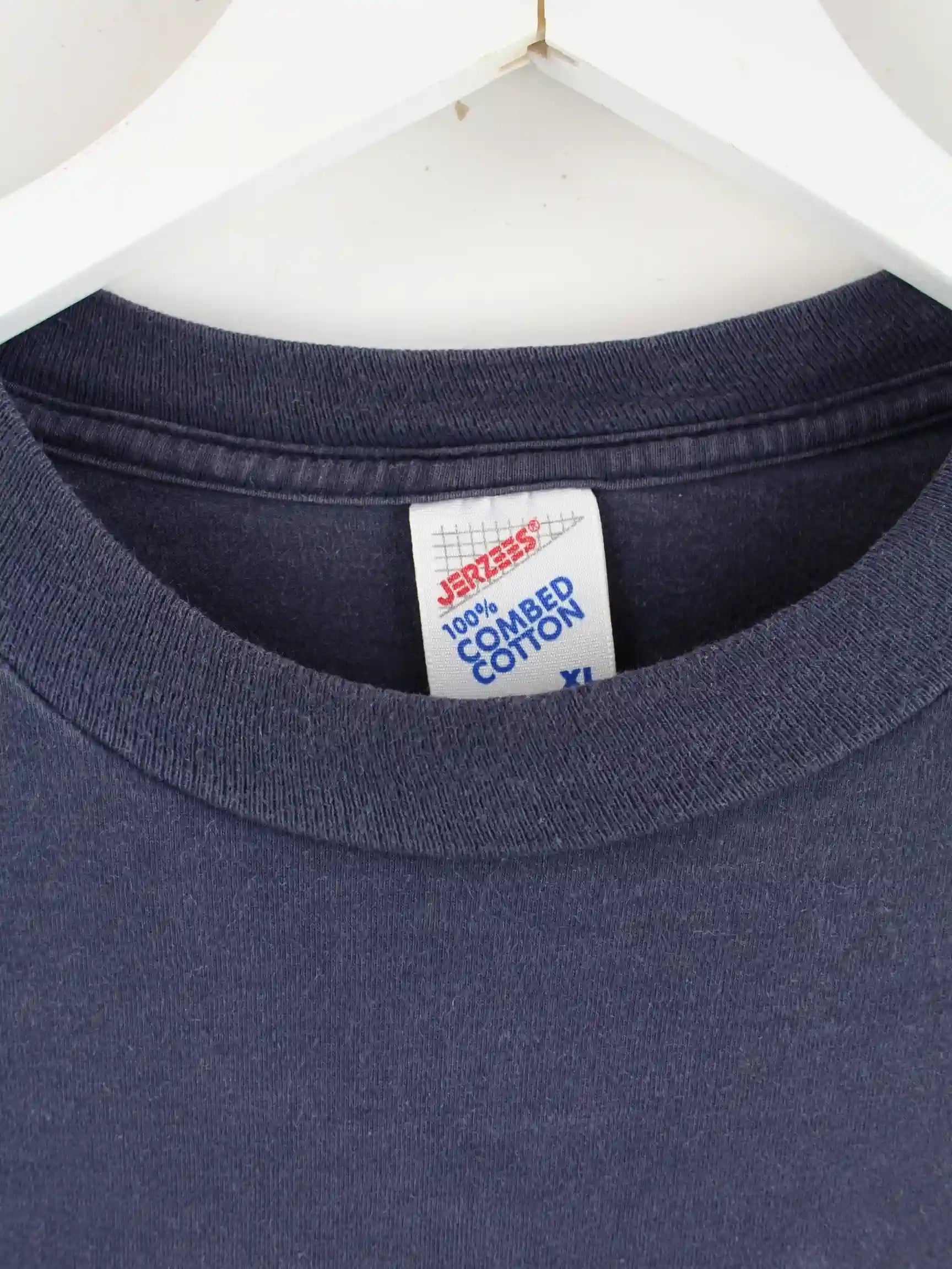 T-Shirt vom Brand Jerzees in Größe XL aus den 90'ern. Es ist aus einer Baumwollmischung produziert und in Blau auf Lager. Mit seltenem USA Print.