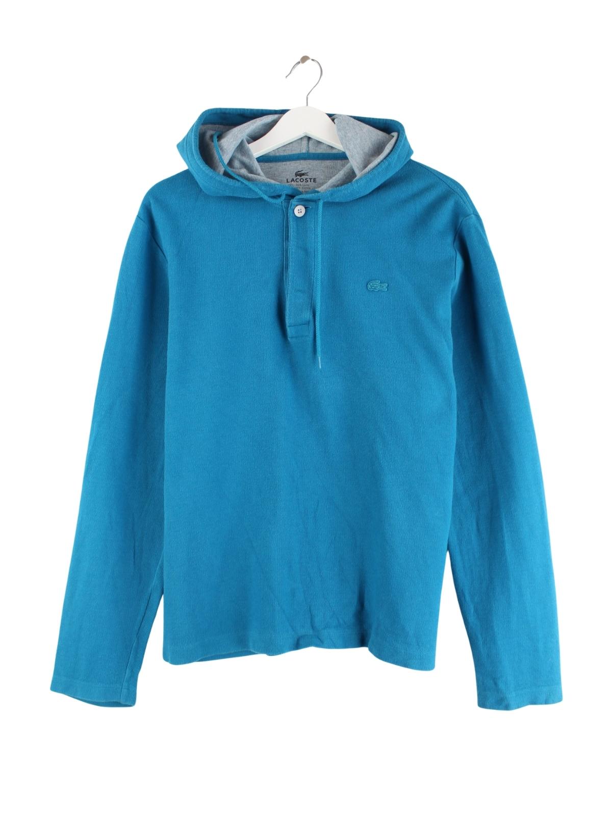 Kapuzenpullover der Marke Lacoste in Größe 5 / M, mit kleinem Logo. Er ist aus einer Baumwollmischung gemacht und in Blau in Stock.
