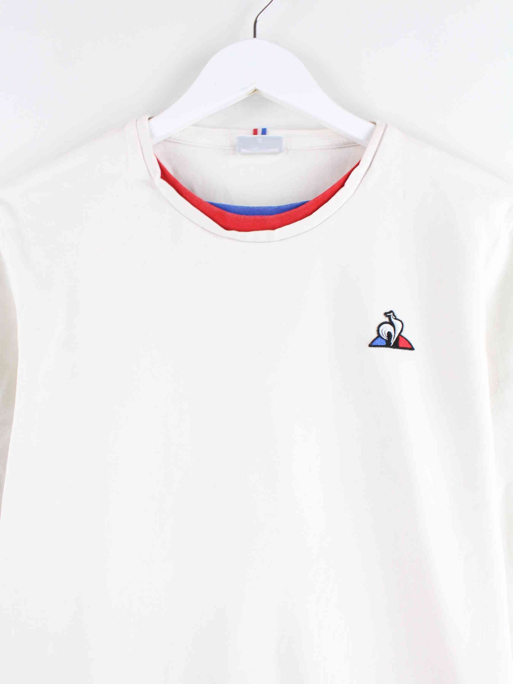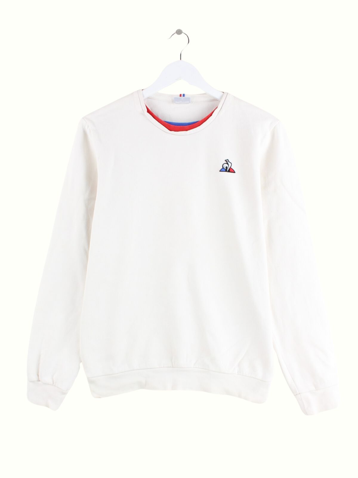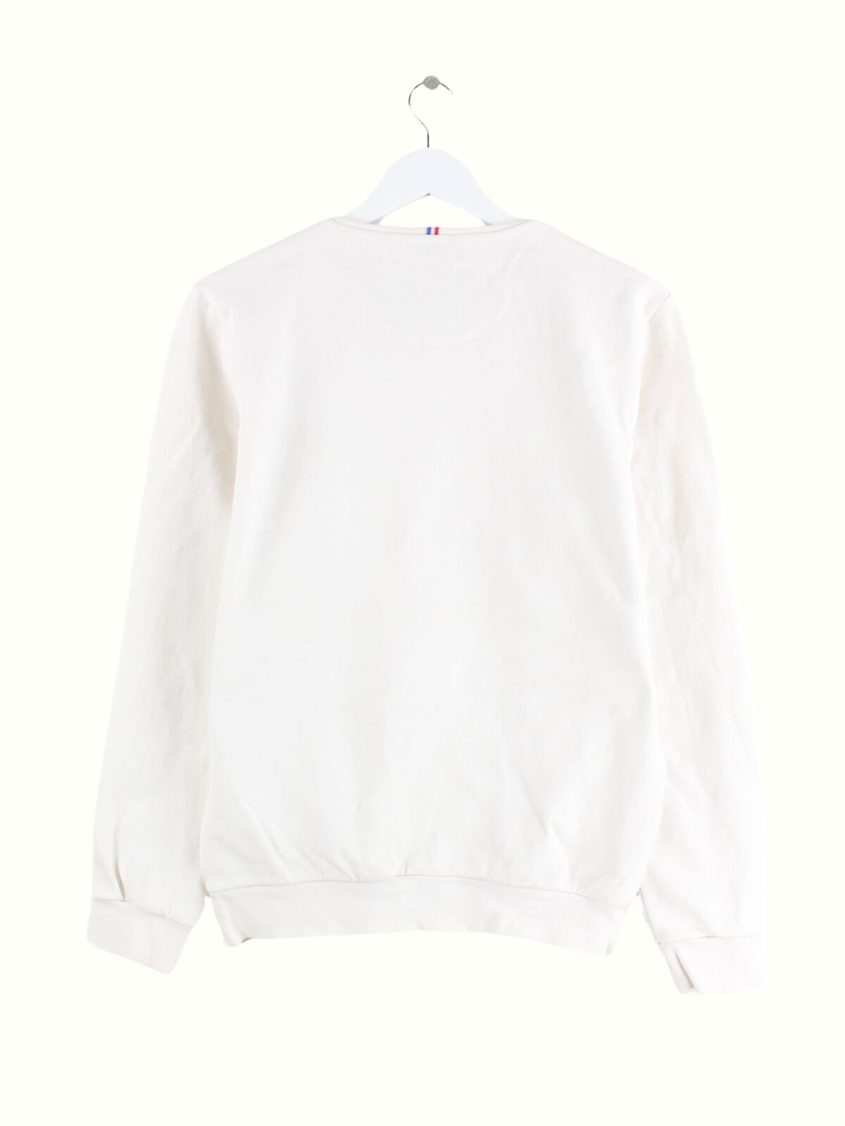 Weißer Sweater mit gesticktem Logo vom Label Le Coq Sportif in Größe S. Er ist aus einer Baumwollmischung und in gutem Zustand in Stock.