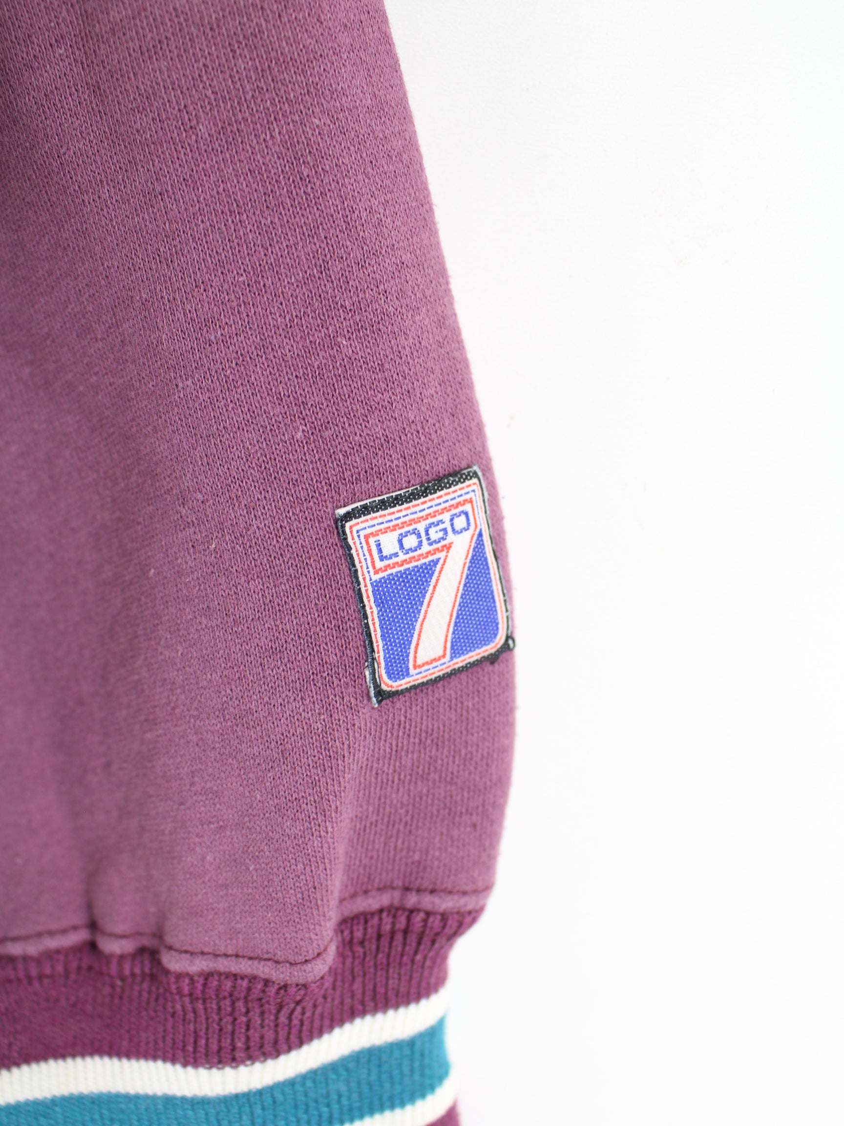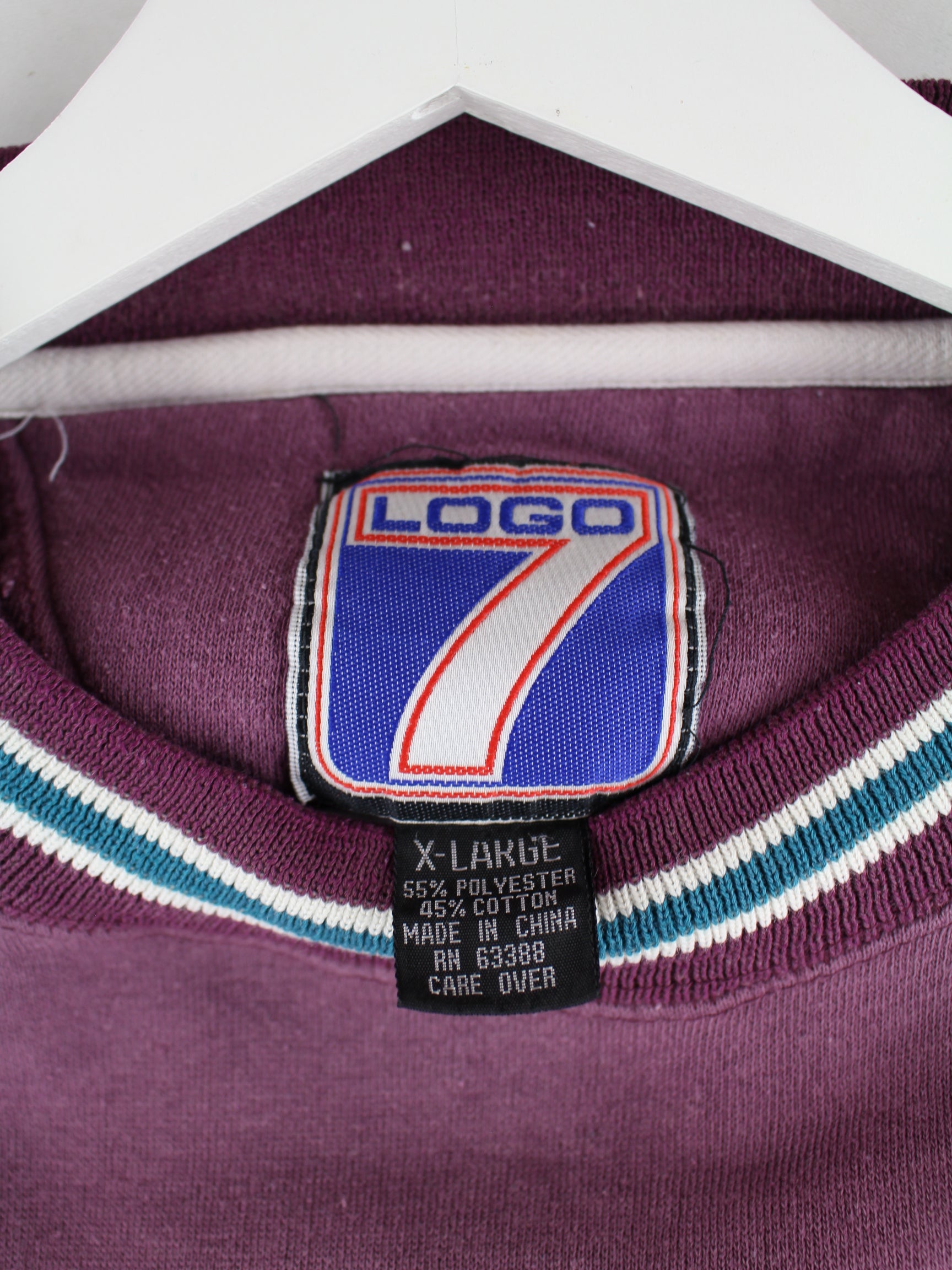 Sweater des Labels Logo 7 mit gestickten Motiven in Größe XL aus den 90'ern. Er ist aus einer Baumwollmischung produziert und in Lila vorrätig.