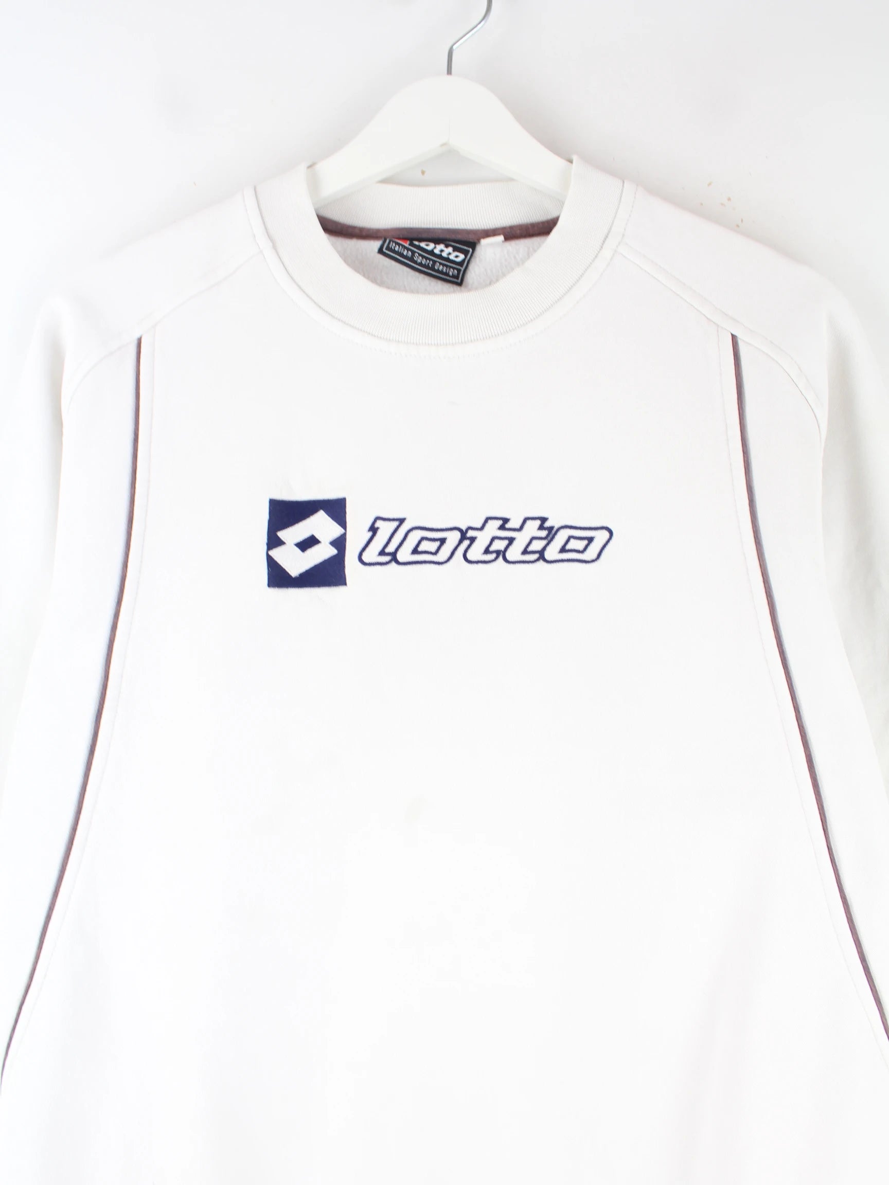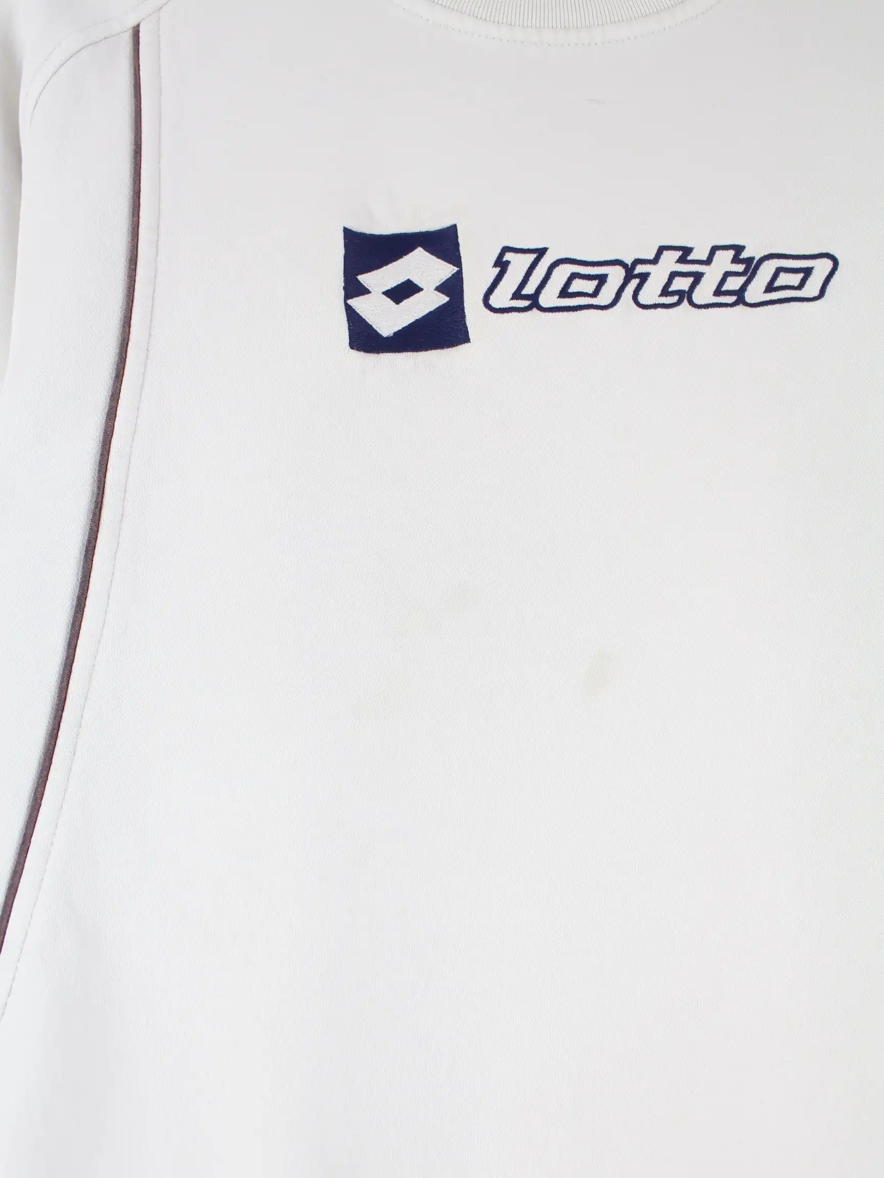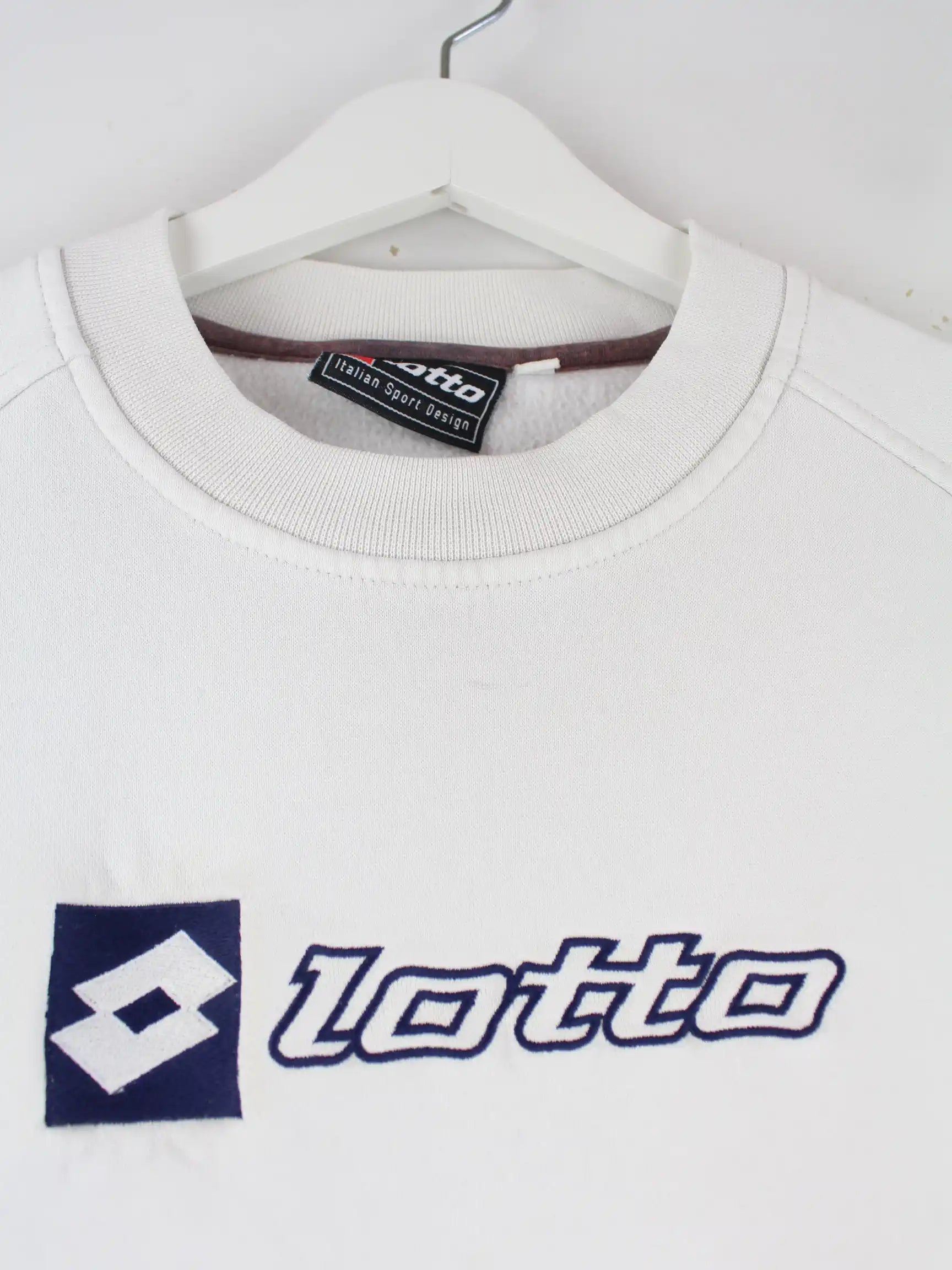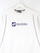 Sweater der Brand Lotto mit gestickten Motiven in Größe S. Er ist aus einer Baumwollmischung produziert und in Weiß im Bestand.