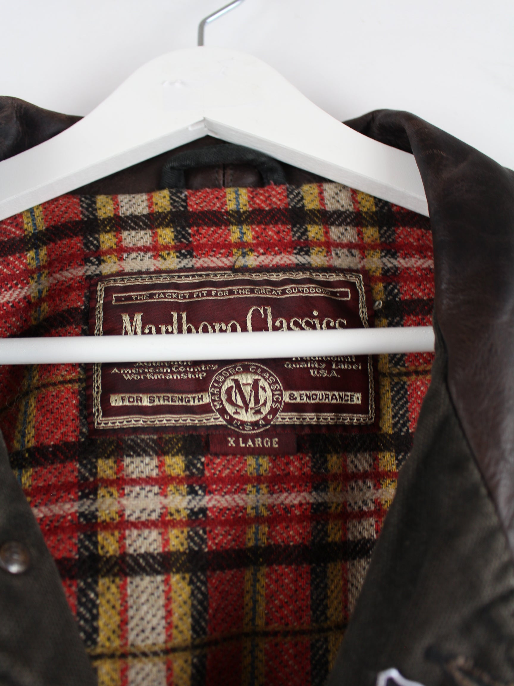 Jacke vom Brand Marlboro in Größe XL aus den 90'ern. Sie ist aus Leder gemacht und in Braun zu bekommen.