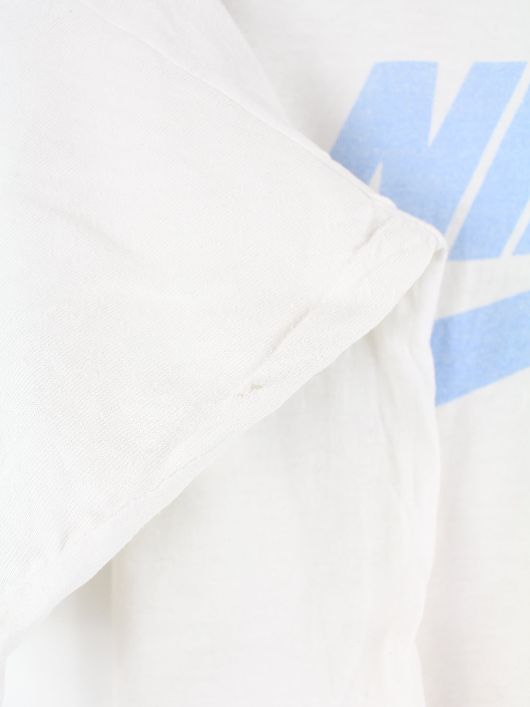 Weißes T-Shirt der Marke Nike aus den 70'ern in Größe S. Es ist aus einer Baumwollmischung und in gutem Zustand lieferbar. Mit schickem Vintage Print.