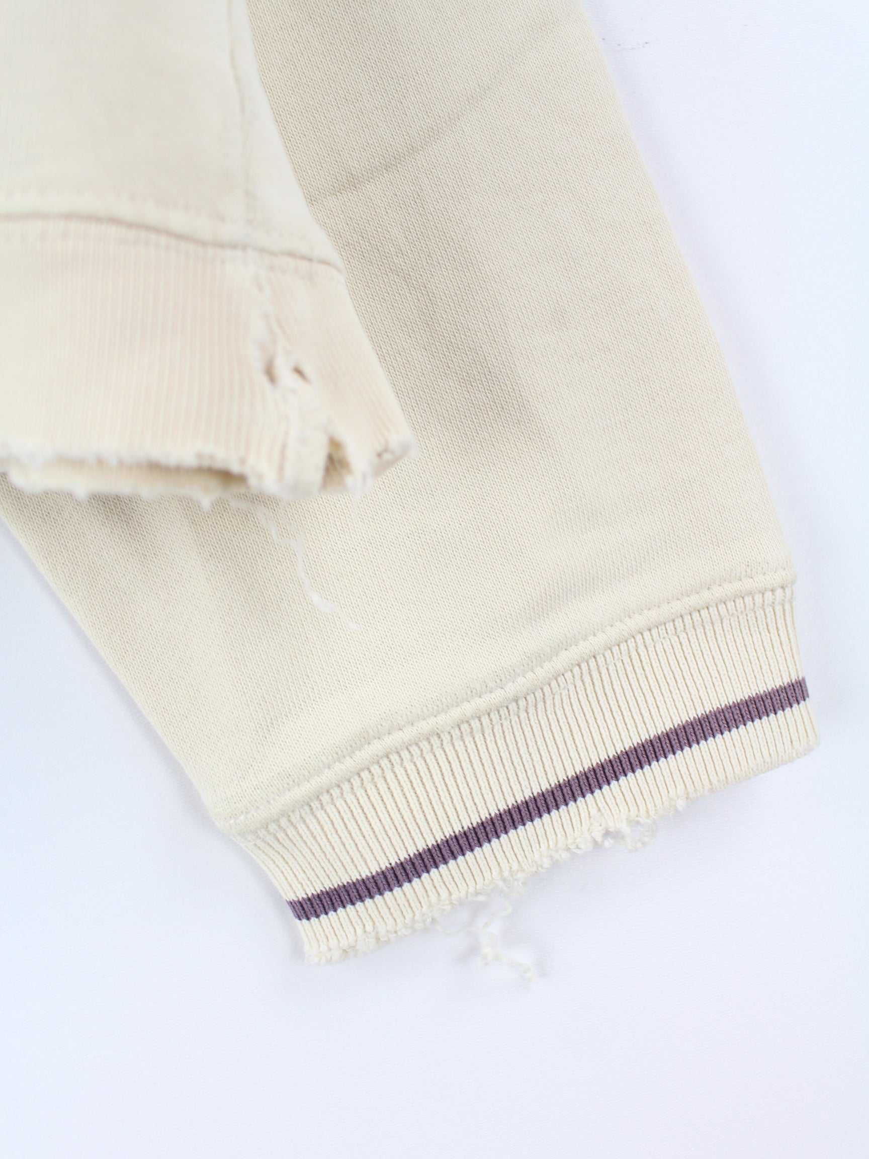 Mängel: Ausgefranzter Kragen und Ärmelbunde sowie seitlich eingerissen. Ausserdem an Ellbogen Flecken/Abrieb (siehe Bilder)