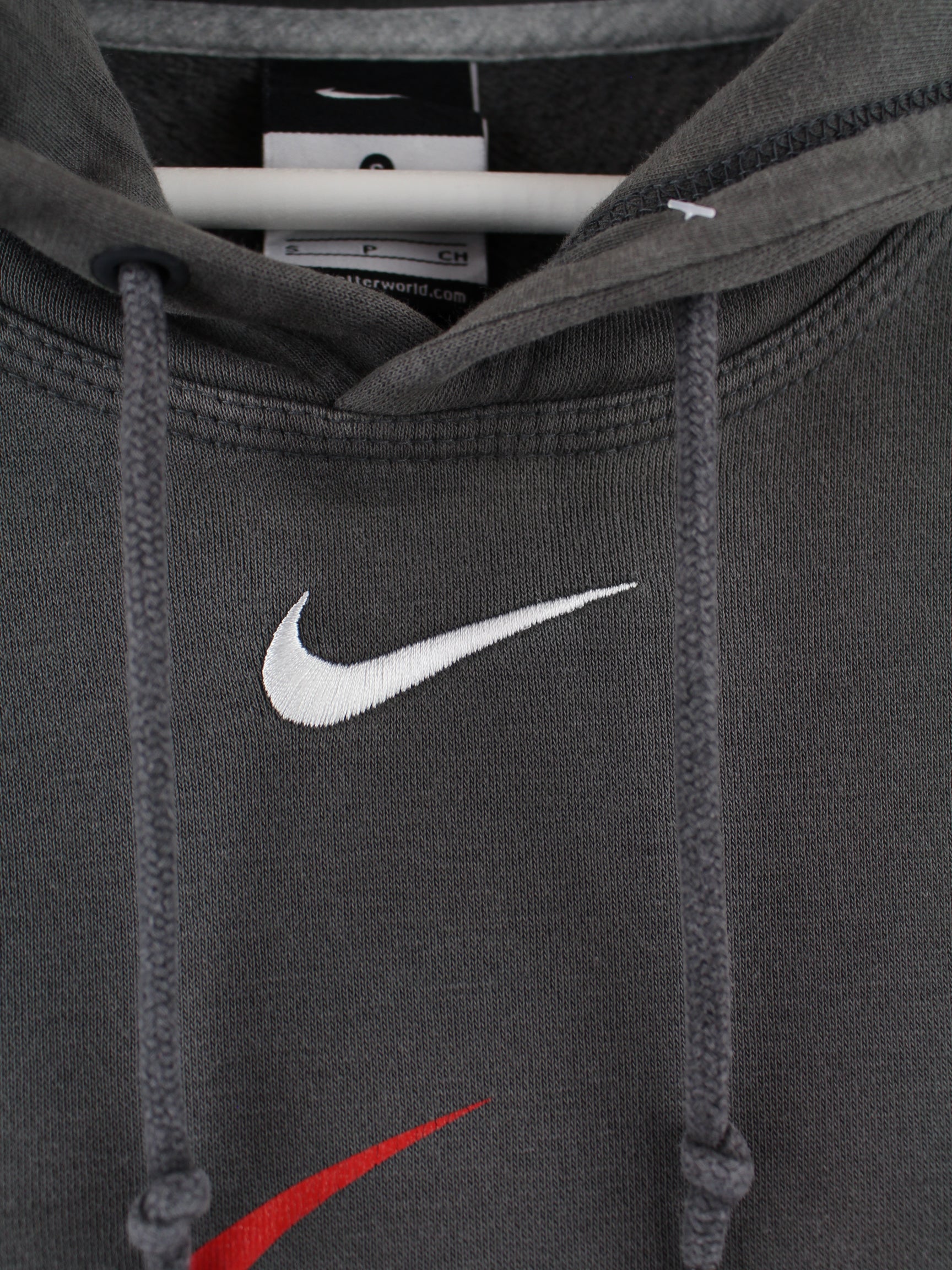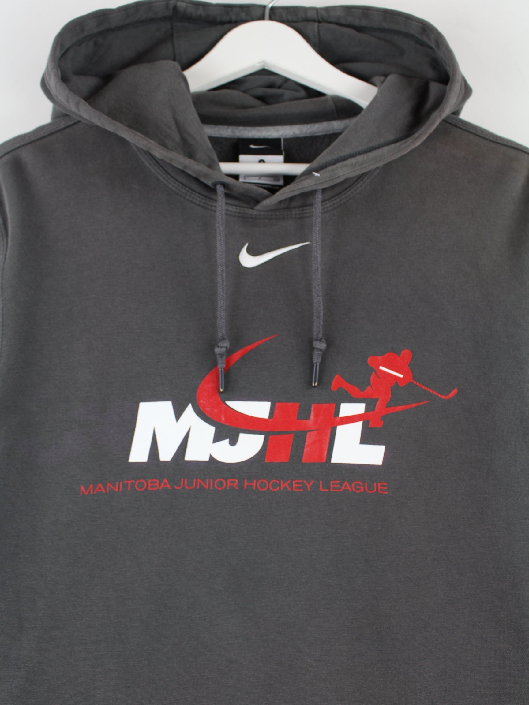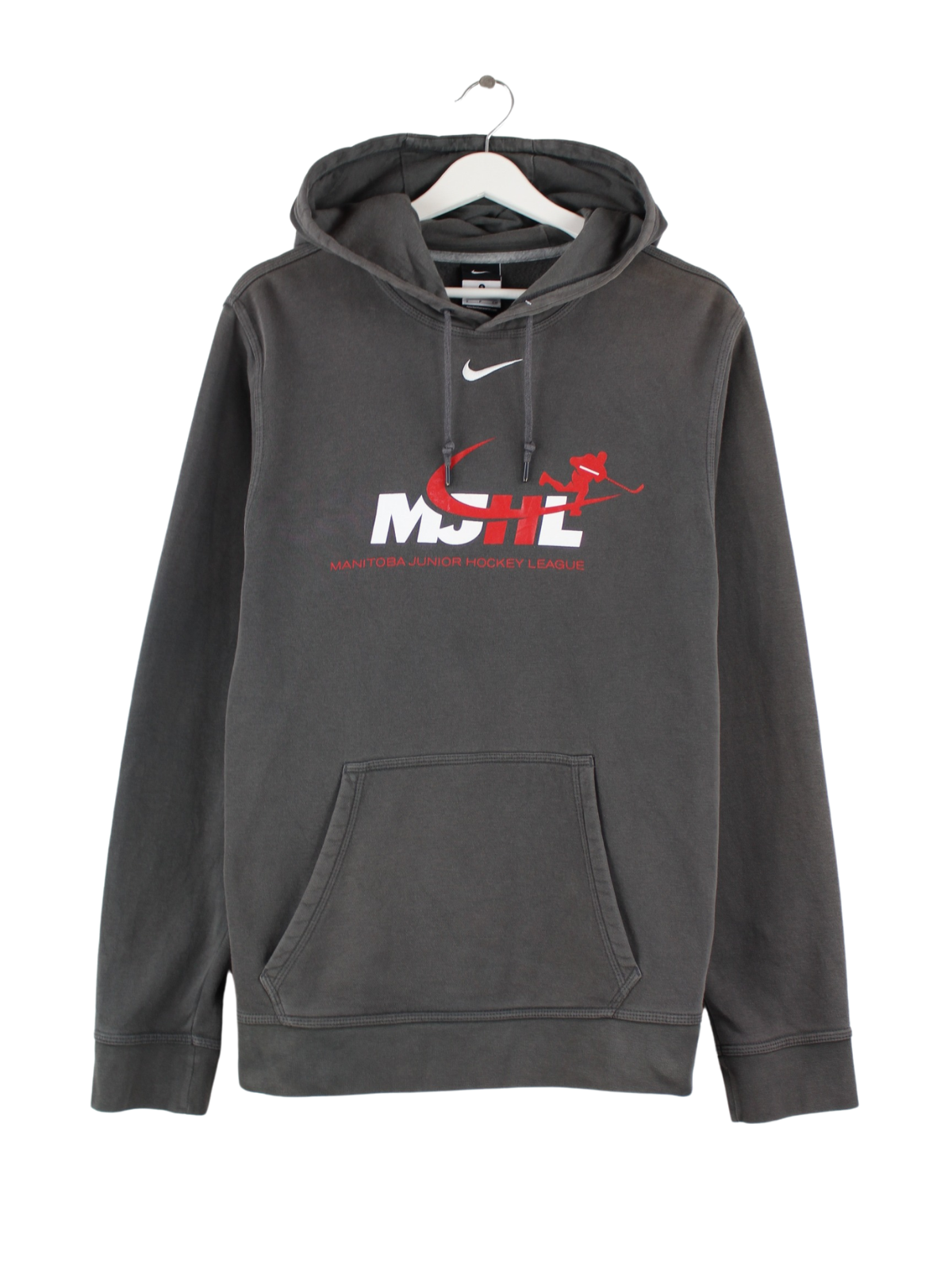Hoodie der Marke Nike in Größe M. Er ist aus einer Baumwollmischung angefertigt und in Grau im Bestand. Mit chiquem Hockey Print.