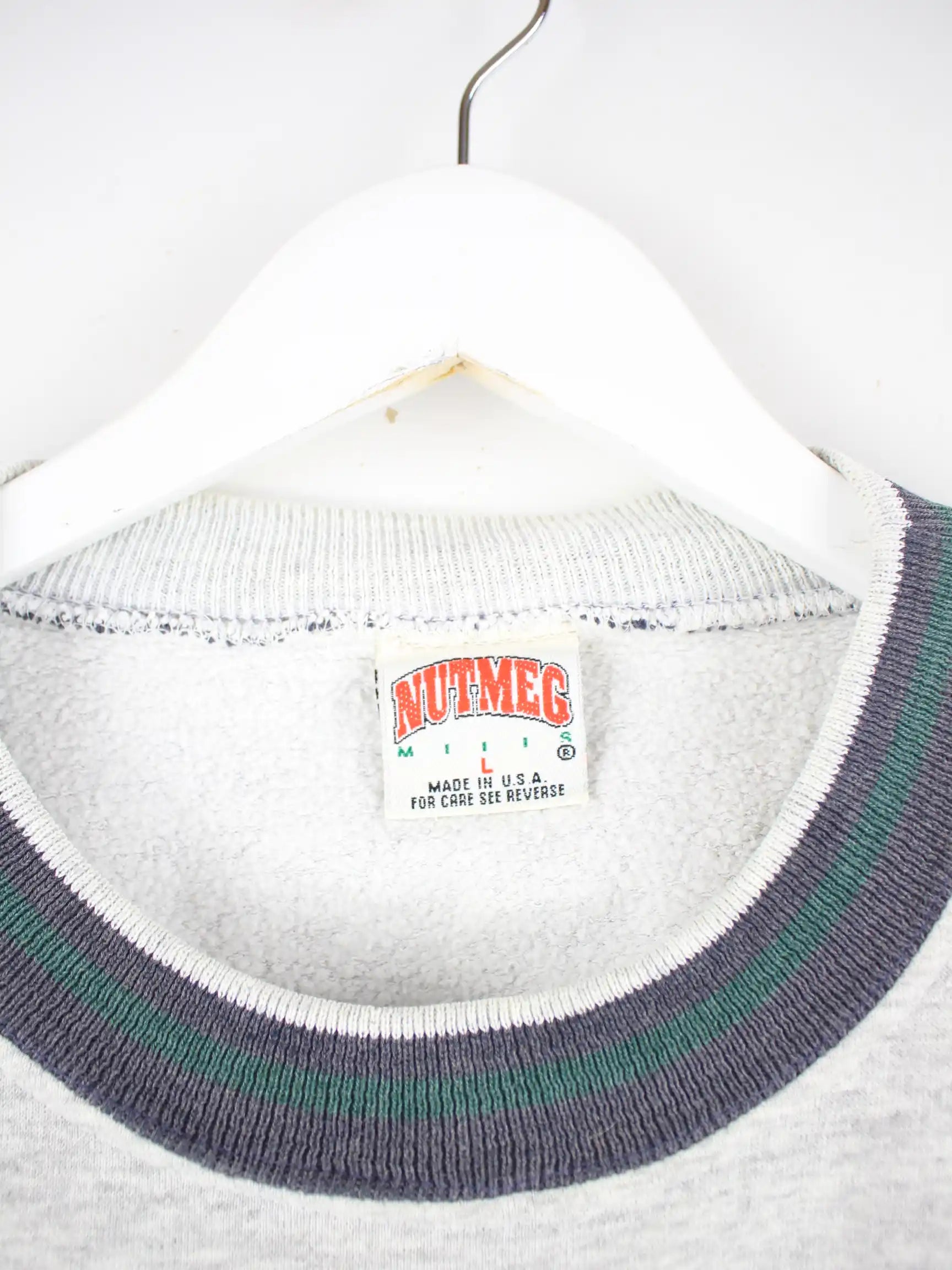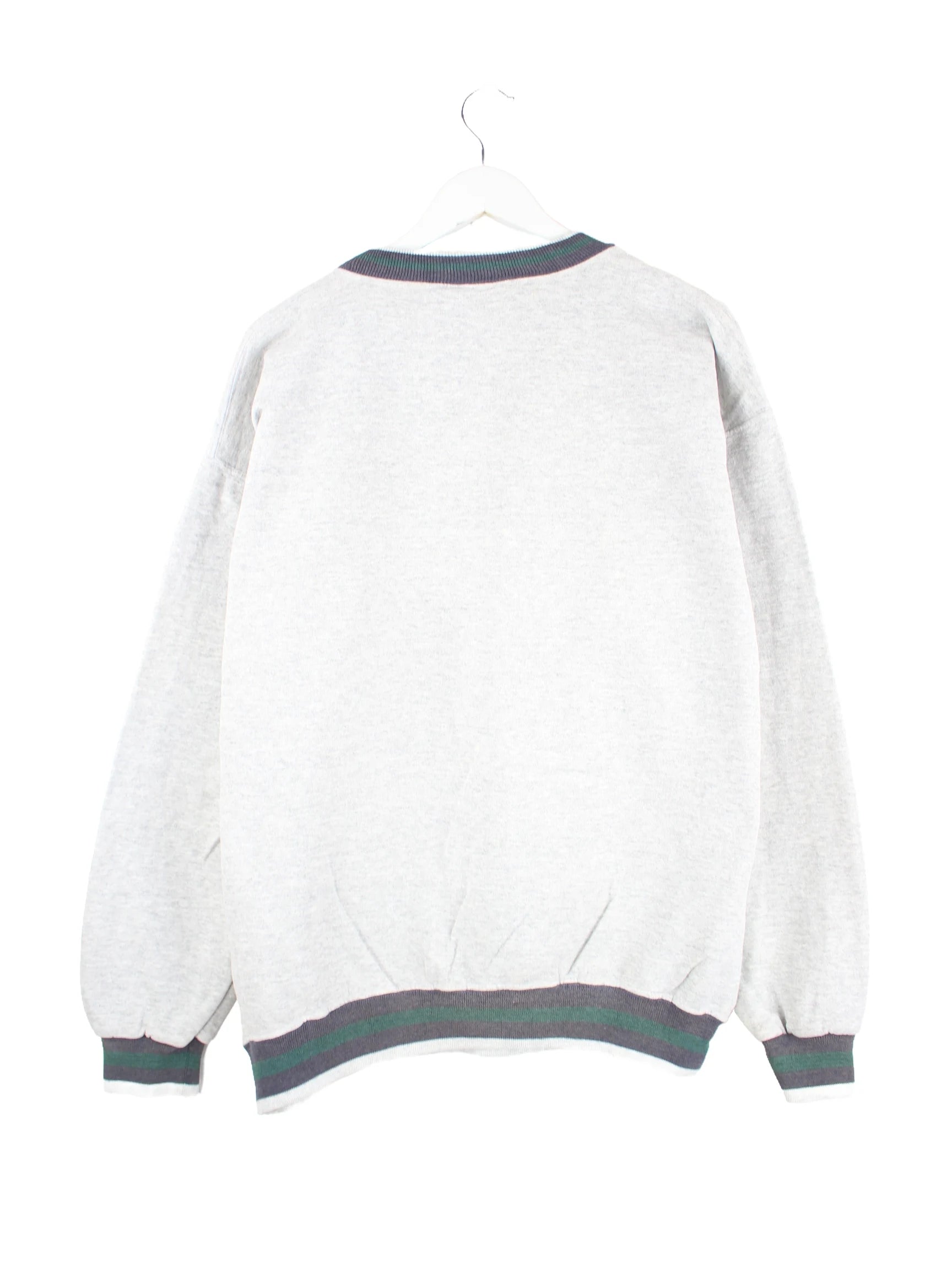 Grauer Sweater vom Label Nutmeg aus den 90'ern in Größe L. Er ist aus einer Baumwollmischung produziert und in gutem Zustand vorrätig. Mit tollem Dame Print.