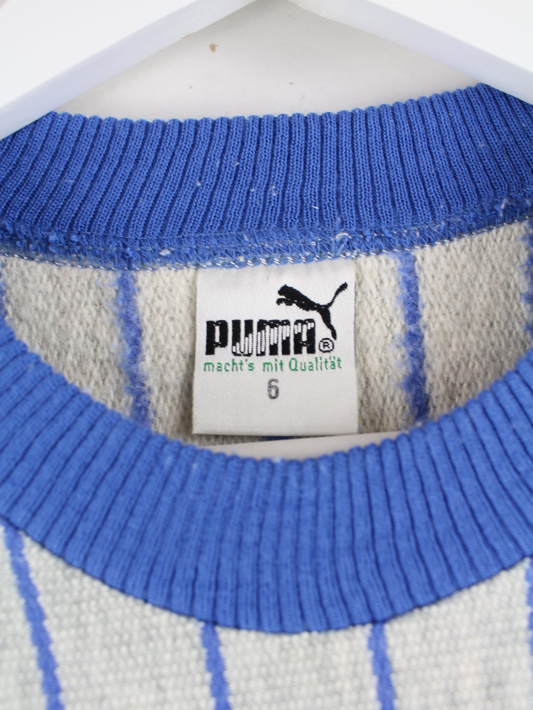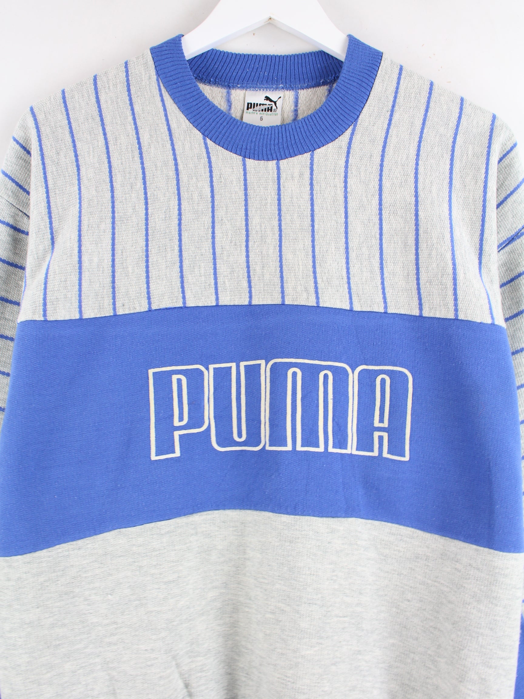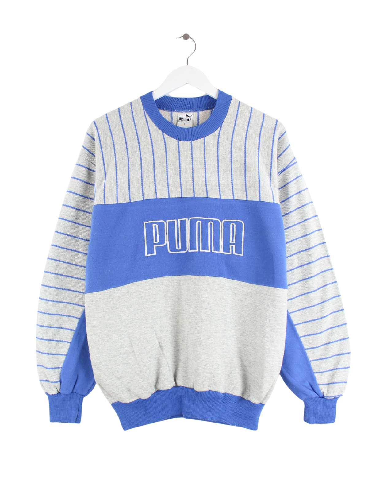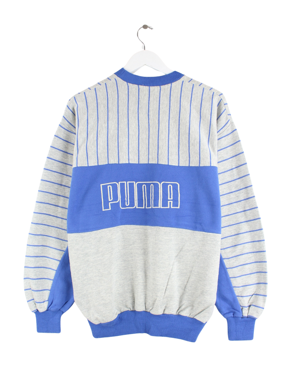 Grauer Sweater vom Brand Puma aus den 80'ern in Größe L. Er ist aus einer Baumwollmischung produziert und in sehr gutem Zustand im Bestand. Mit schickem Vintage Print.