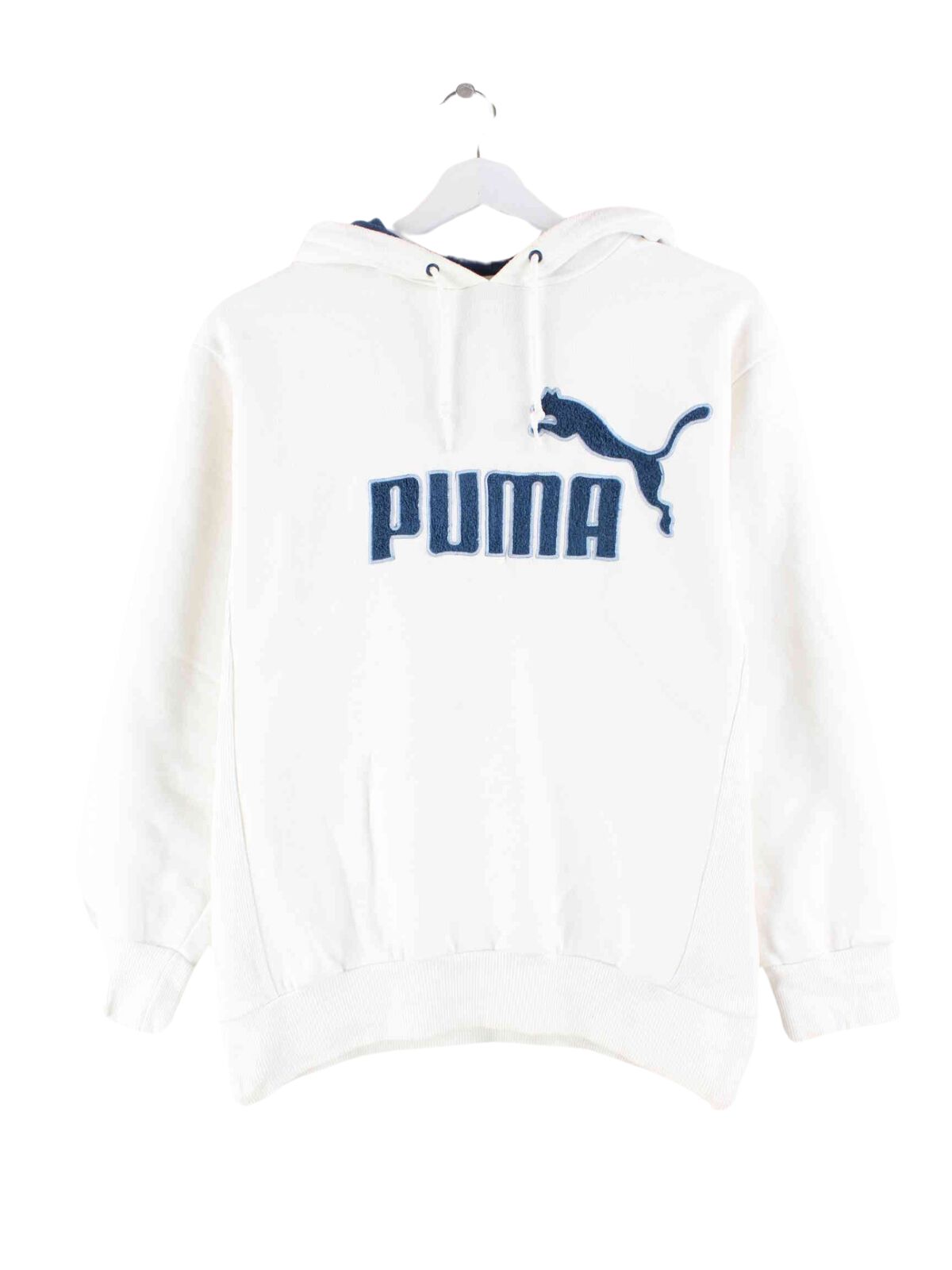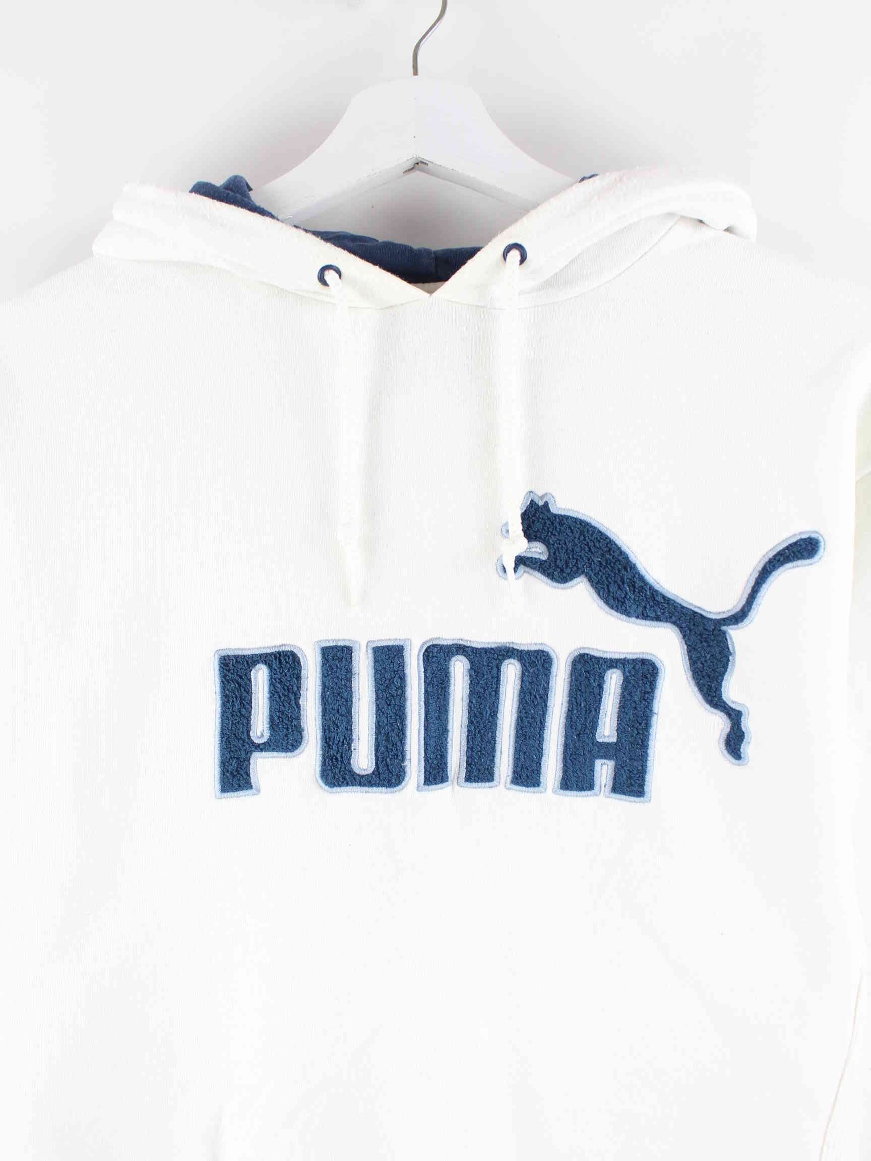 Weißer Hoodie mit Stickereien der Brand Puma in Größe S. Er ist aus einer Baumwollmischung und in sehr gutem Zustand in Stock.
