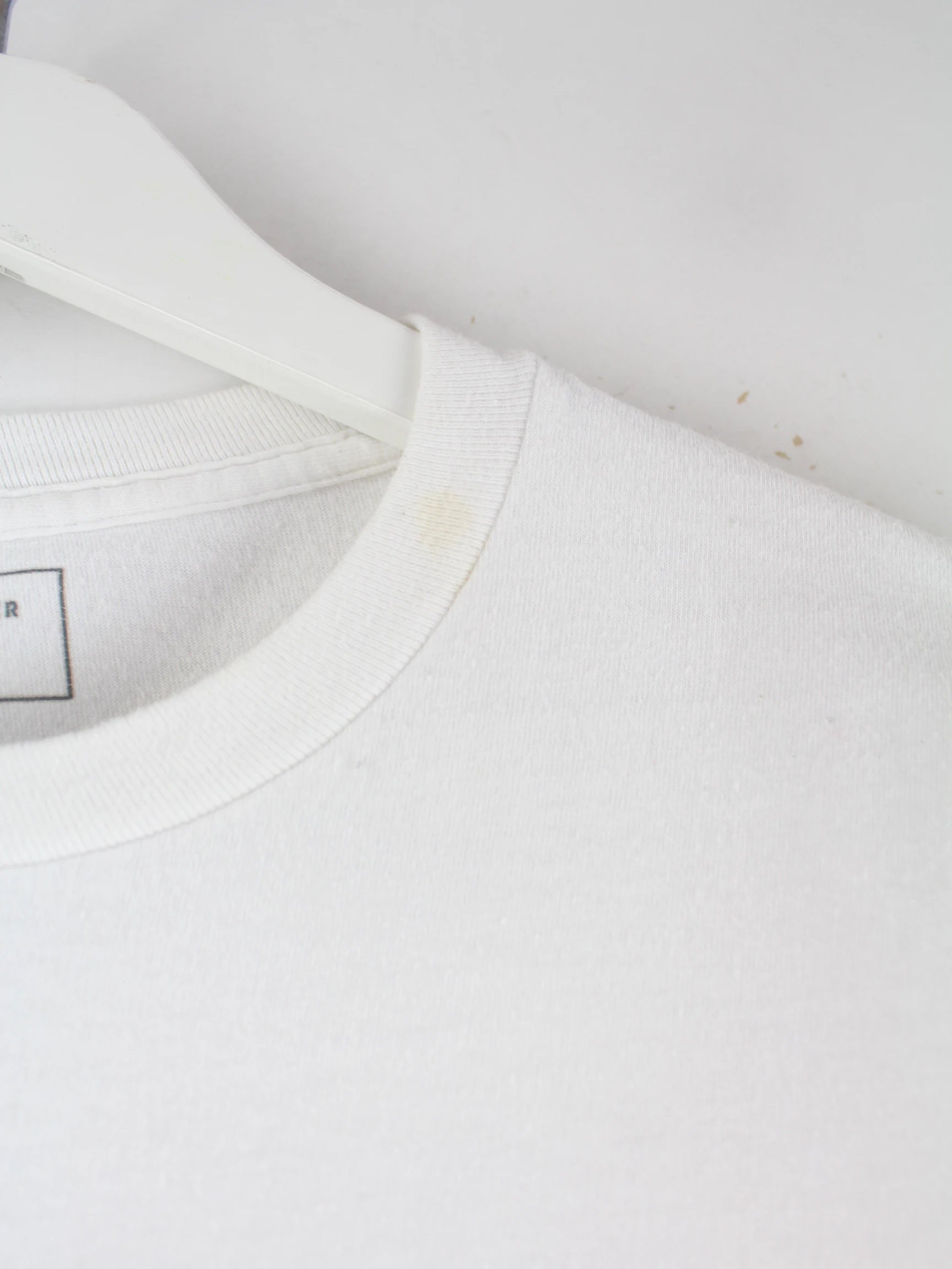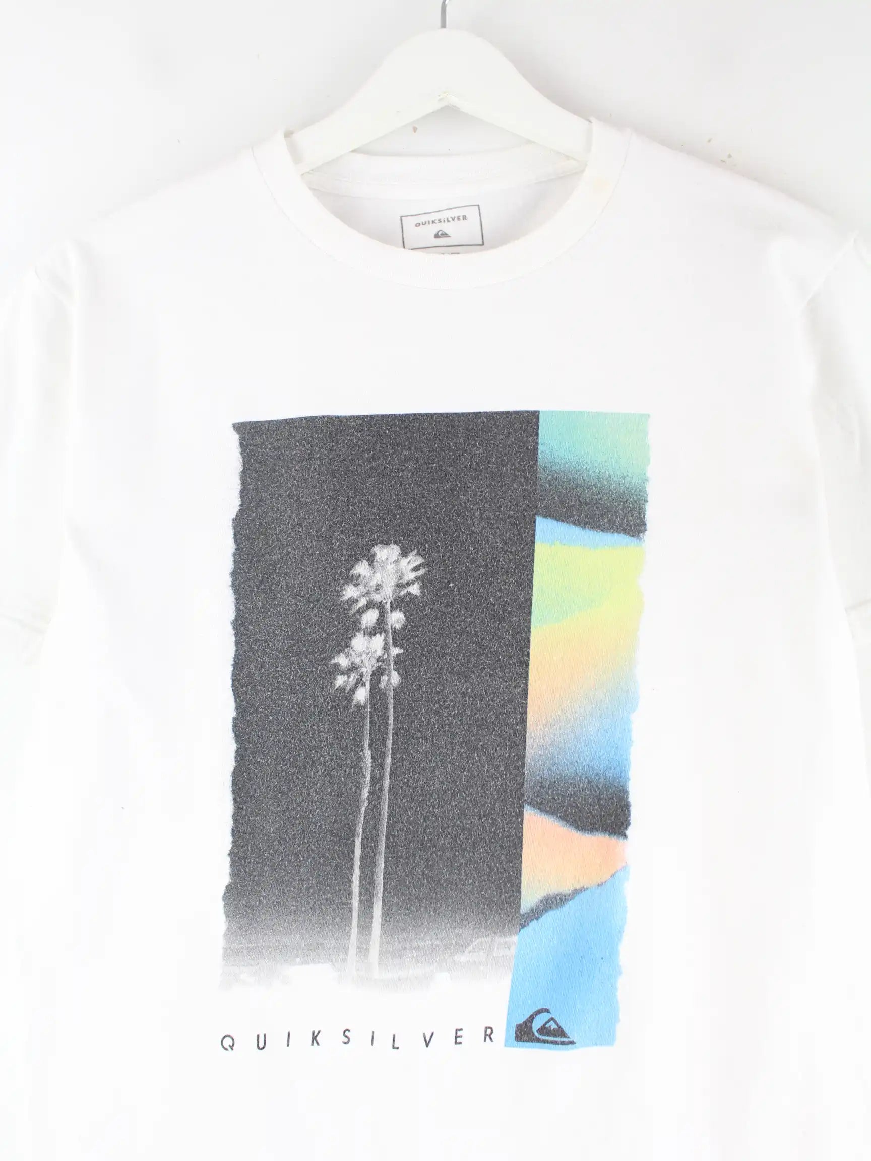 Weißes T-Shirt von Quiksilver in Größe S. Es ist aus Baumwolle hergestellt und in gutem Zustand vorrätig. Mit tollem Print.