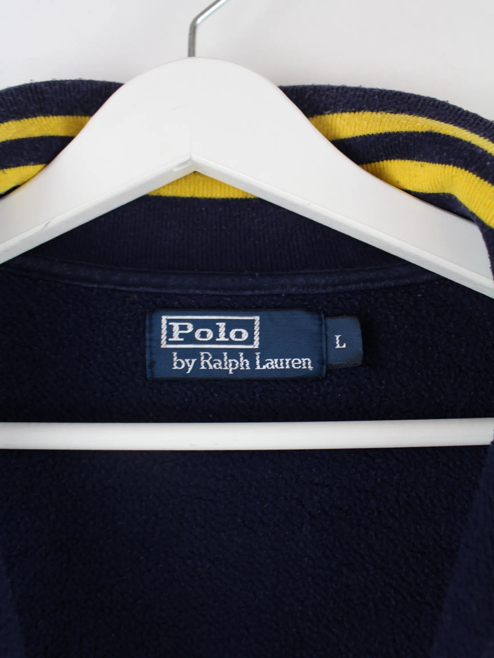 Blaue Sweatjacke mit Stickereien der Brand Ralph Lauren in Größe L. Sie ist aus einer Baumwollmischung angefertigt und in gutem Zustand auf Lager.