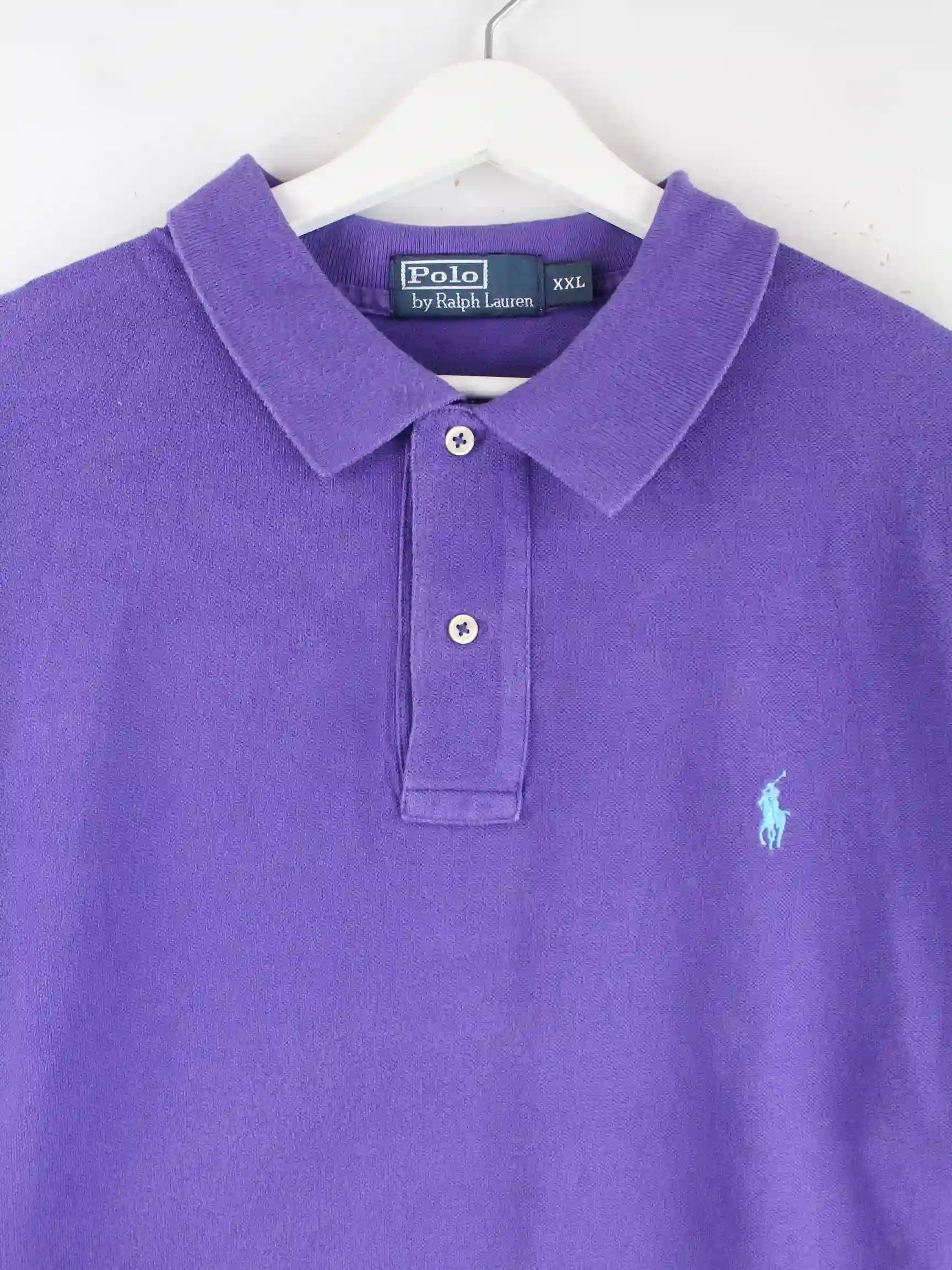 Poloshirt der Marke Ralph Lauren in Größe XXL aus den 90'ern. Es ist aus Baumwolle hergestellt und in Lila lieferbar.
