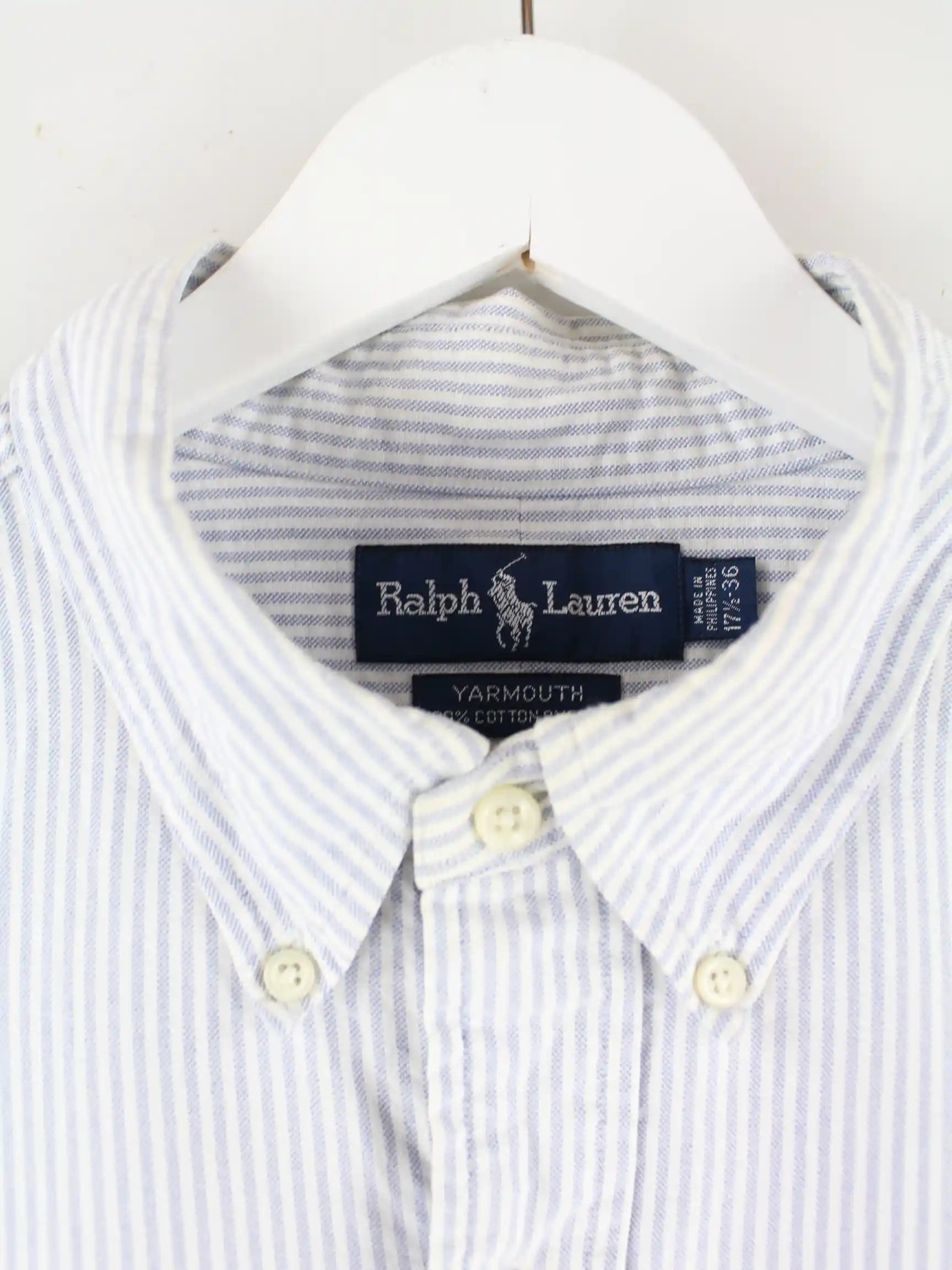 Dieses blaue Ralph Lauren 90er Vintage Yarmouth gestreifte Hemd in Größe XL ist ein zeitloser Klassiker. Hergestellt aus hochwertiger Baumwolle bietet es hohen Tragekomfort und ein stilvolles Design. Perfekt für einen lässigen oder doch eleganten Look.