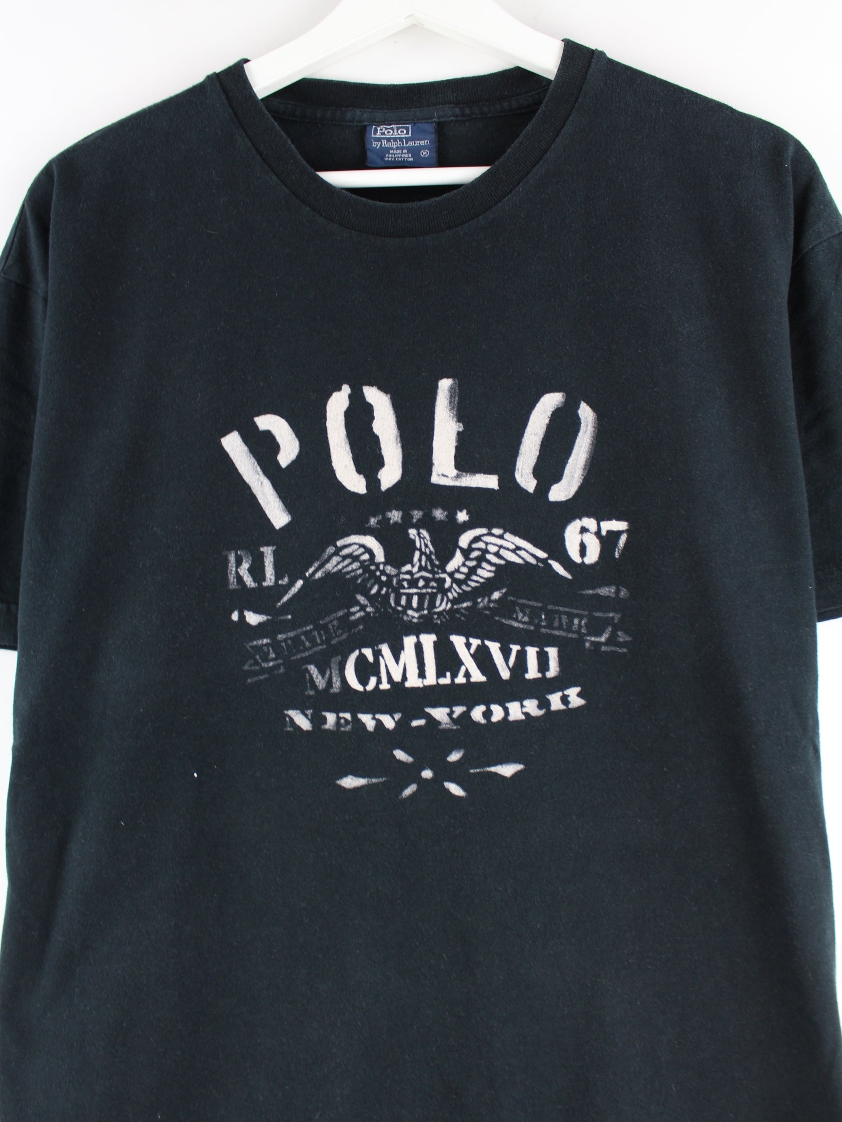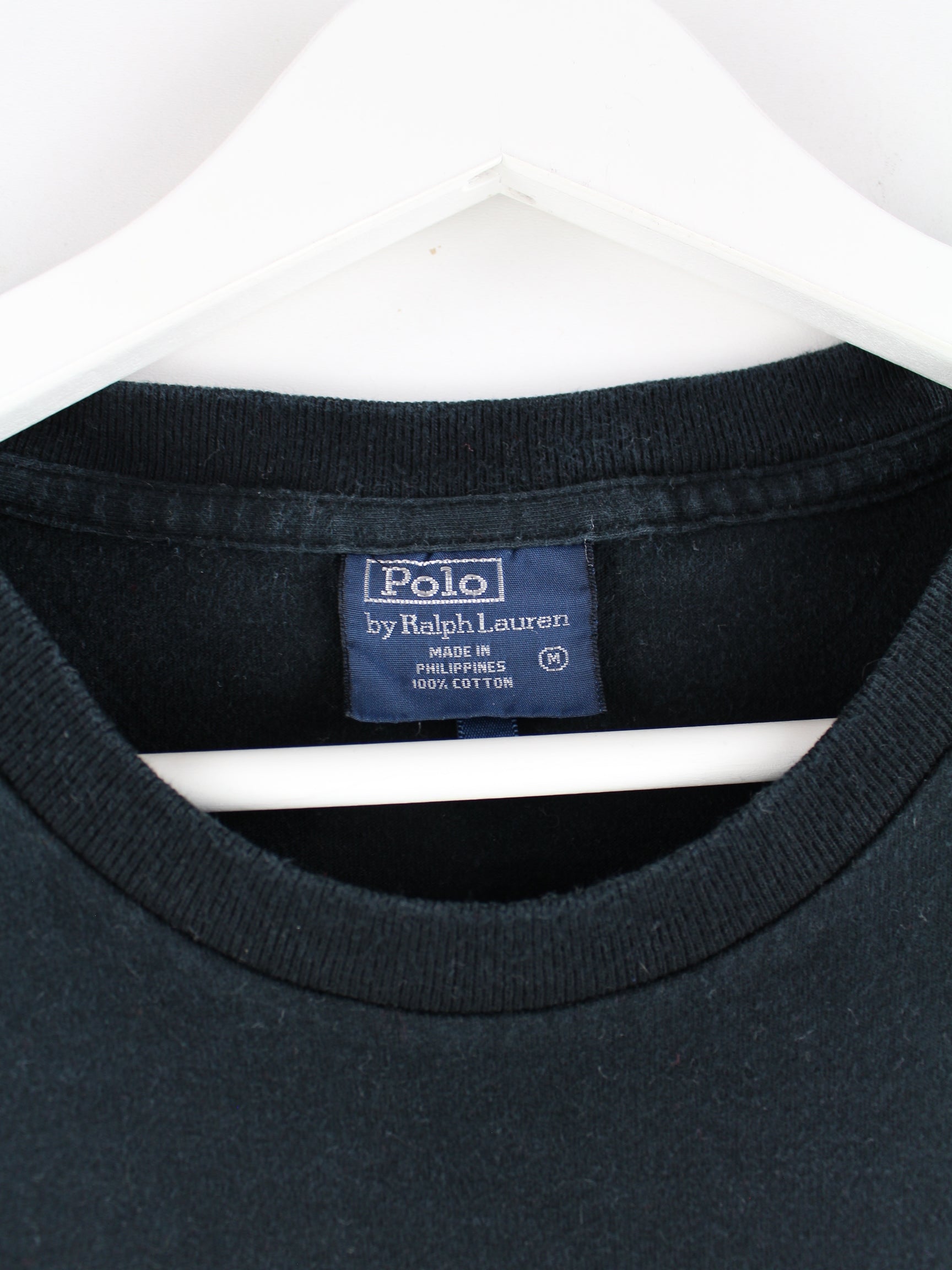 Schwarzes T-Shirt vom Brand Ralph Lauren in Größe M. Es ist aus einer Baumwollmischung hergestellt und in sehr gutem Zustand auf Lager. Mit schickem Print.