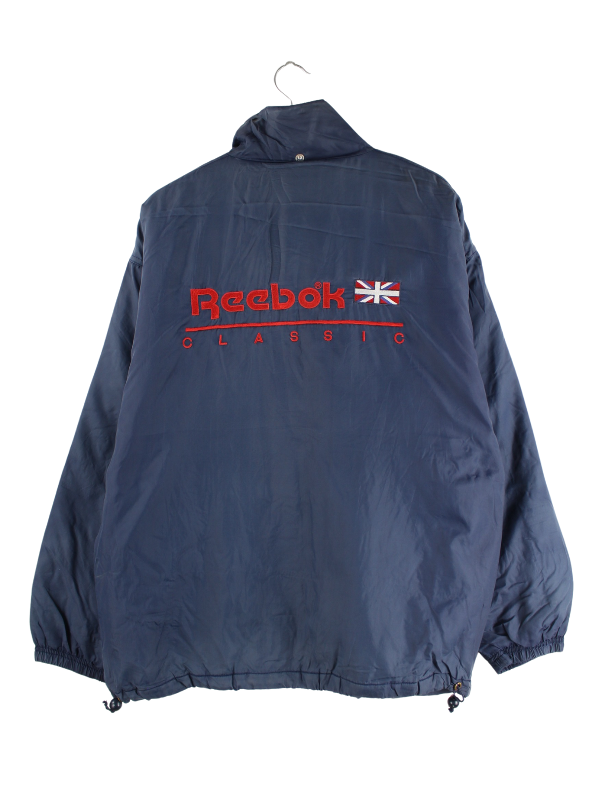 Blaue Jacke mit Stickereien der Brand Reebok in Größe L. Sie ist aus Synthetik und in sehr gutem Zustand in Stock.