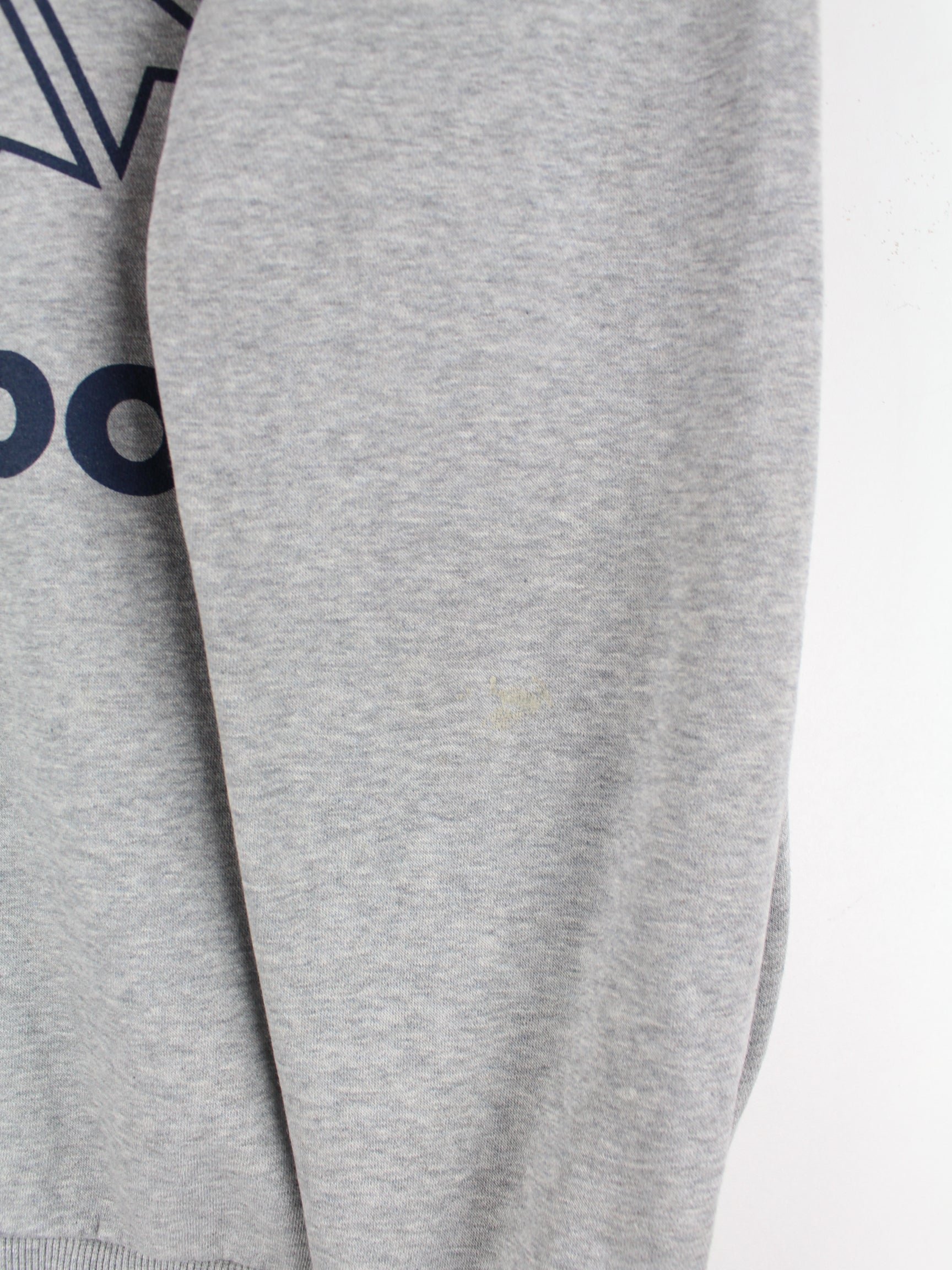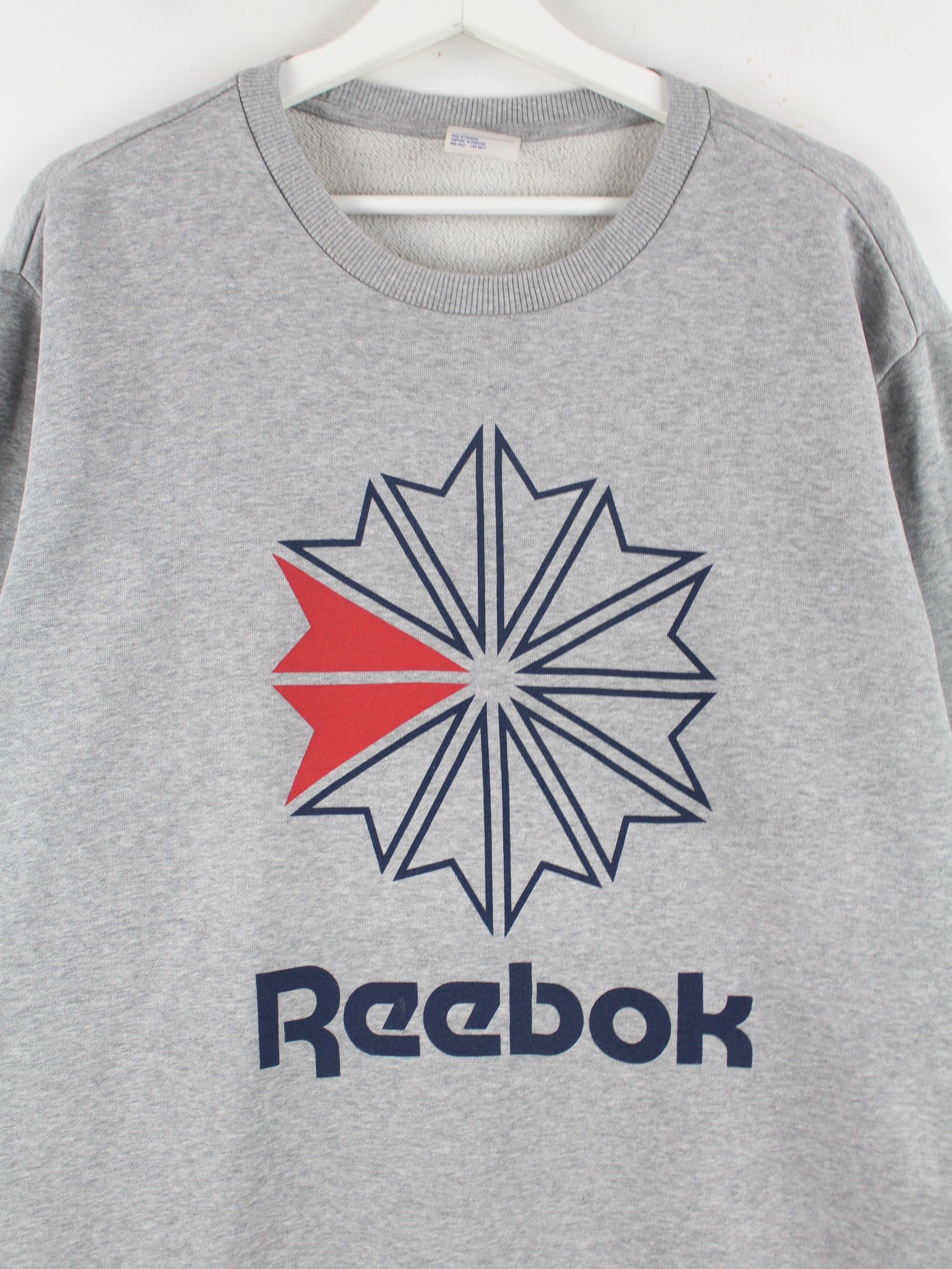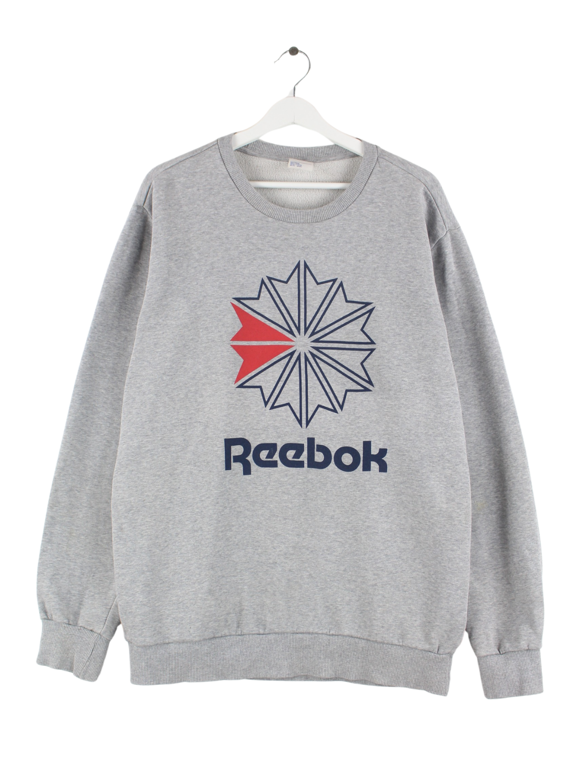 Sweater aus dem Hause Reebok in Größe L. Er ist aus einer Baumwollmischung angefertigt und in Grau lieferbar. Mit seltenem Print.