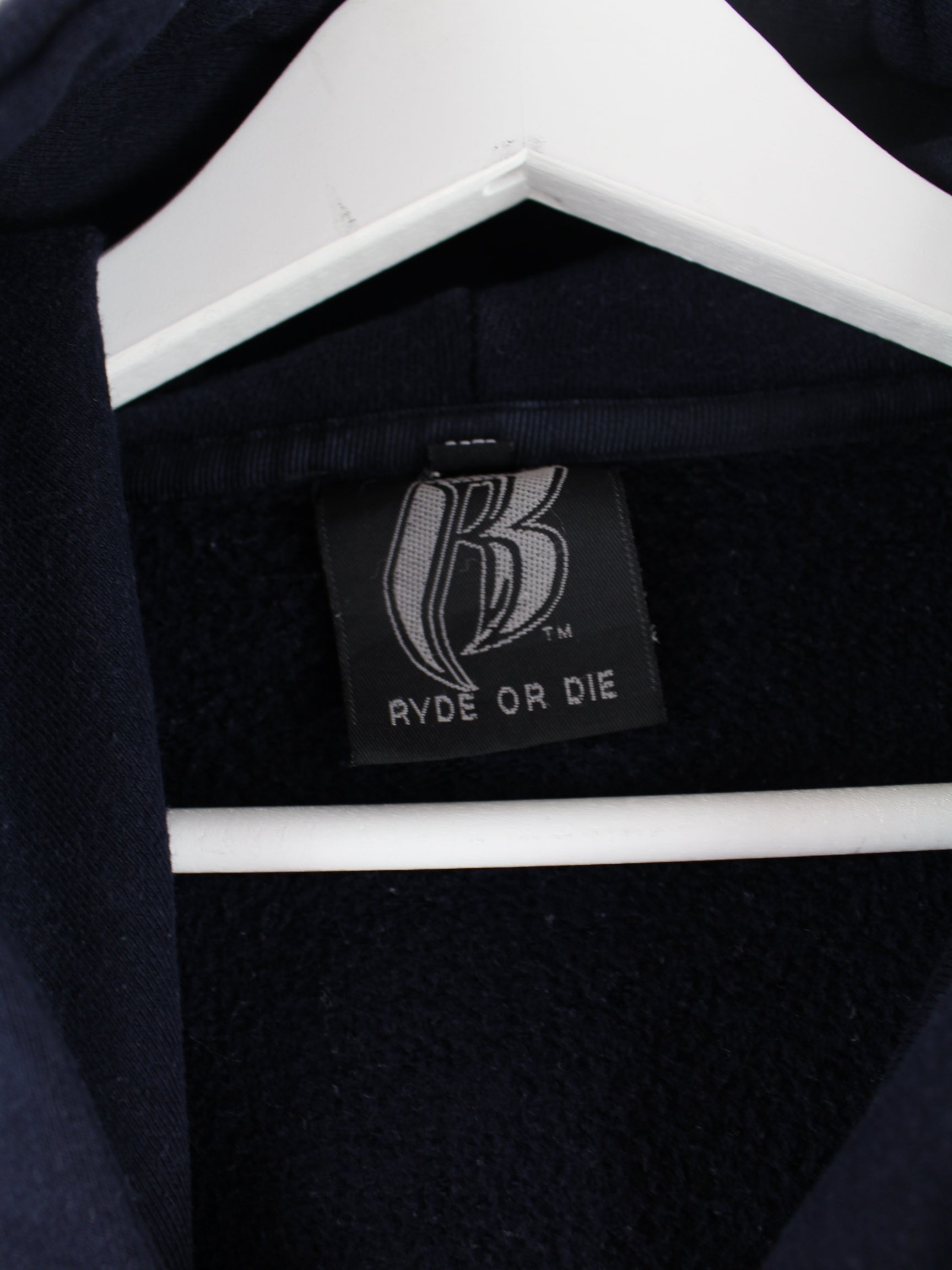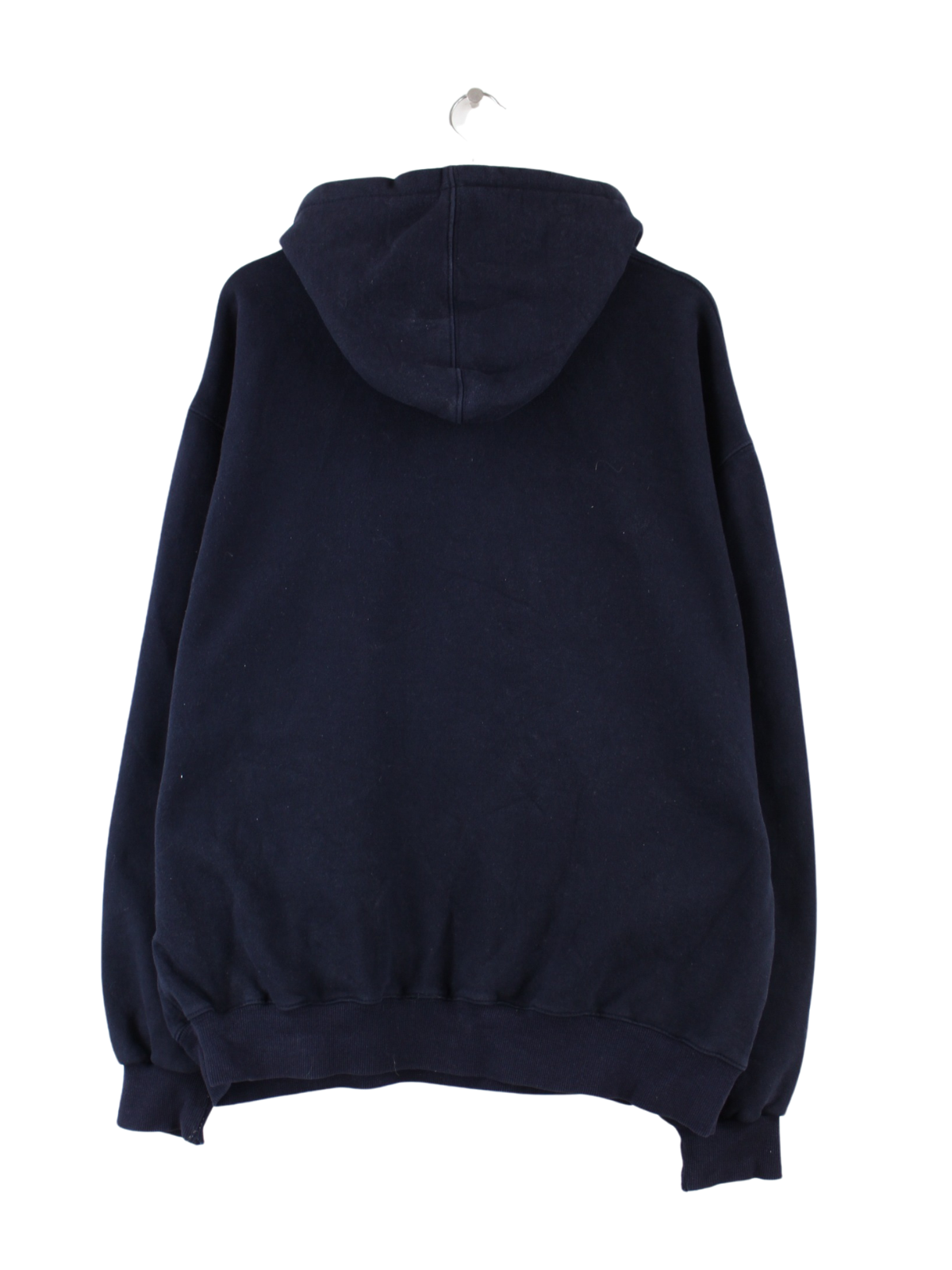 Hoodie der Brand Ruff Ryders mit Stick in Größe XL aus den 90'ern. Er ist aus einer Baumwollmischung und in Blau bei uns vorrätig.