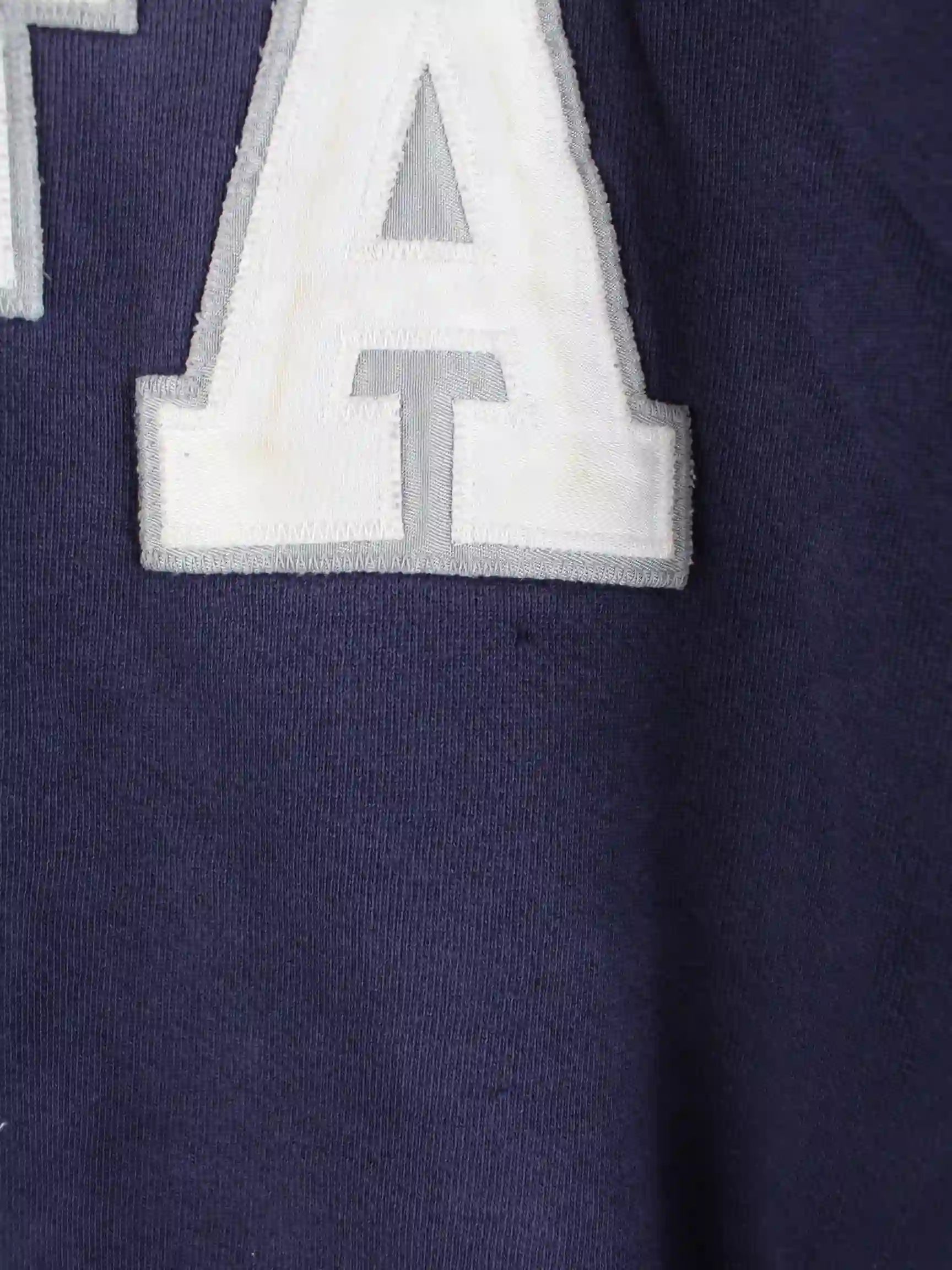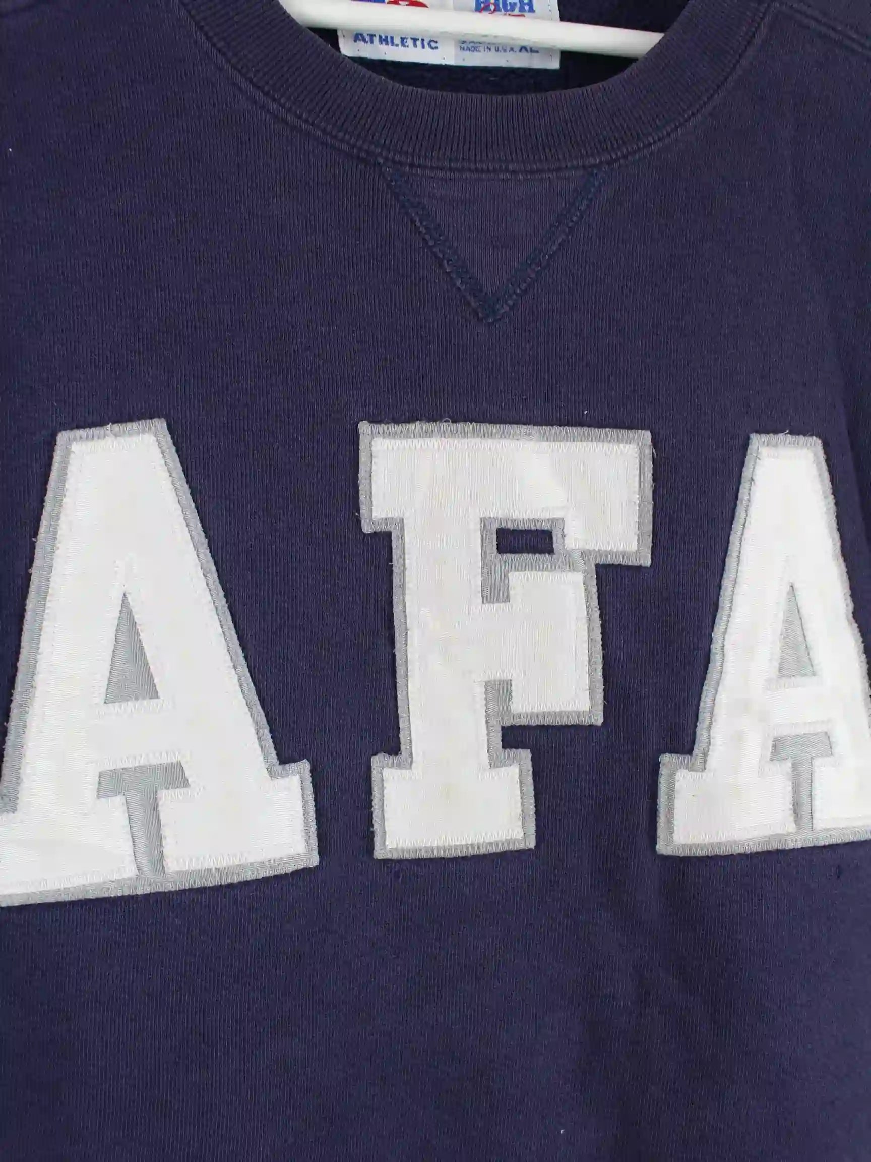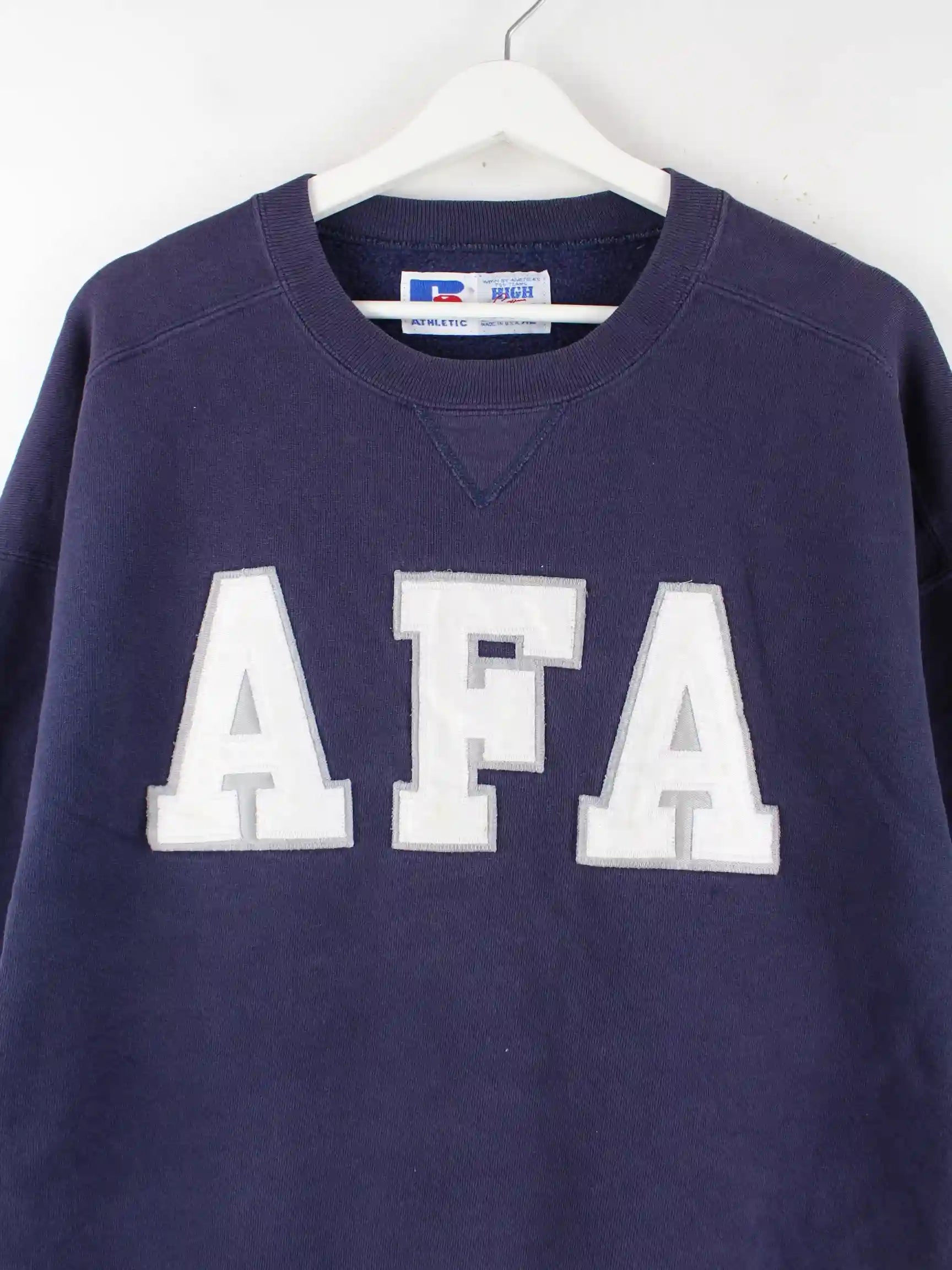 Sweater aus dem Hause Russell Athletic mit gestickten Motiven in Größe XL aus den 90'ern. Er ist aus einer Baumwollmischung hergestellt und in Blau im Angebot.