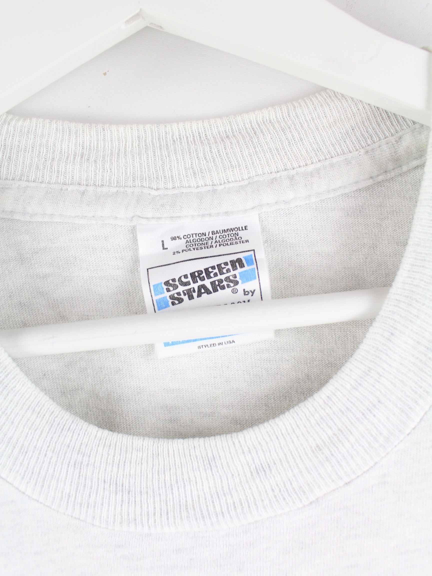 Graues T-Shirt vom Brand Screen Stars aus den 90'ern in Größe L. Es ist aus Baumwolle gefertigt und in sehr gutem Zustand in Stock. Mit tollem Vintage Print.