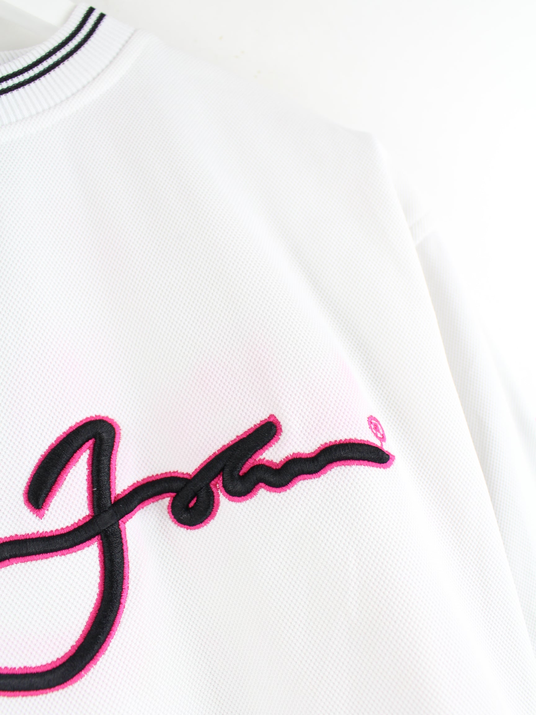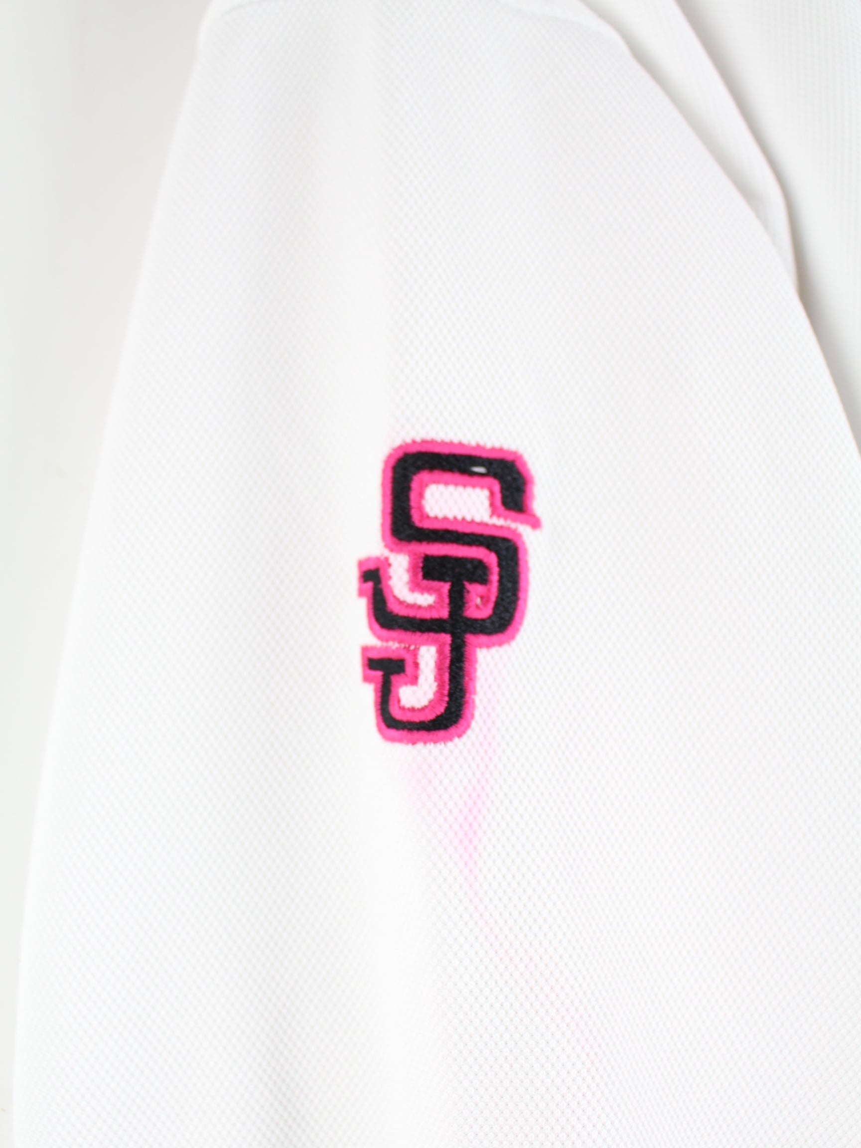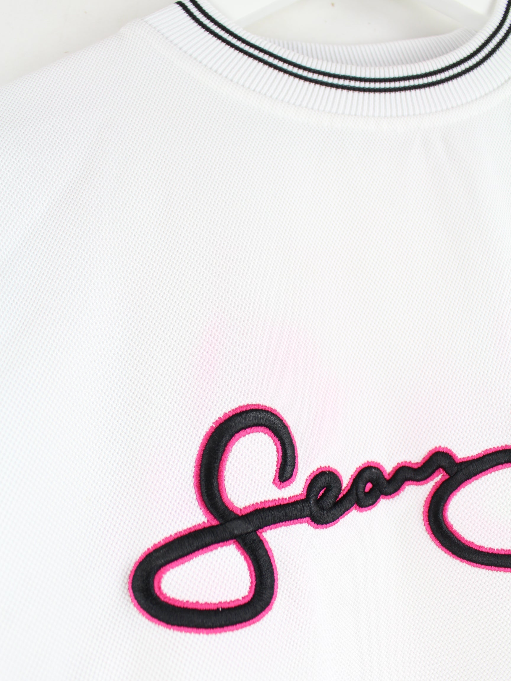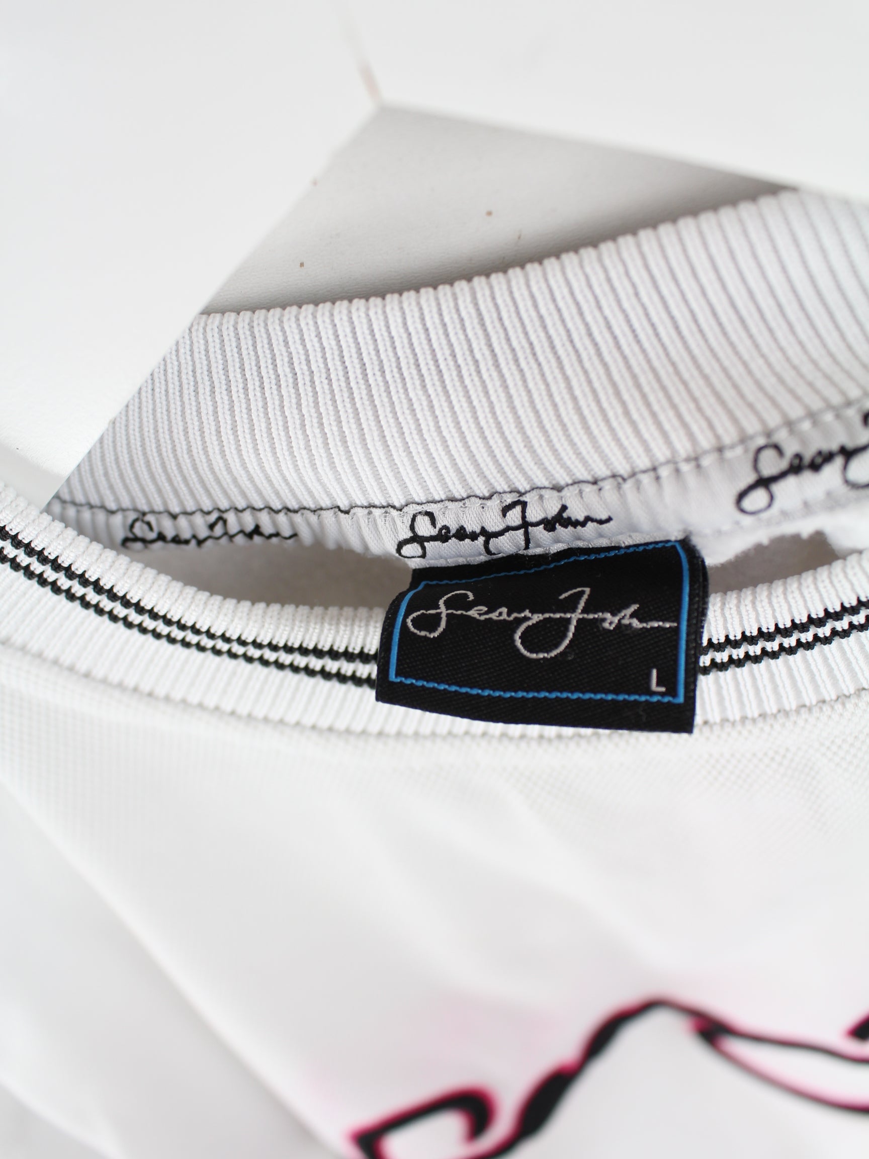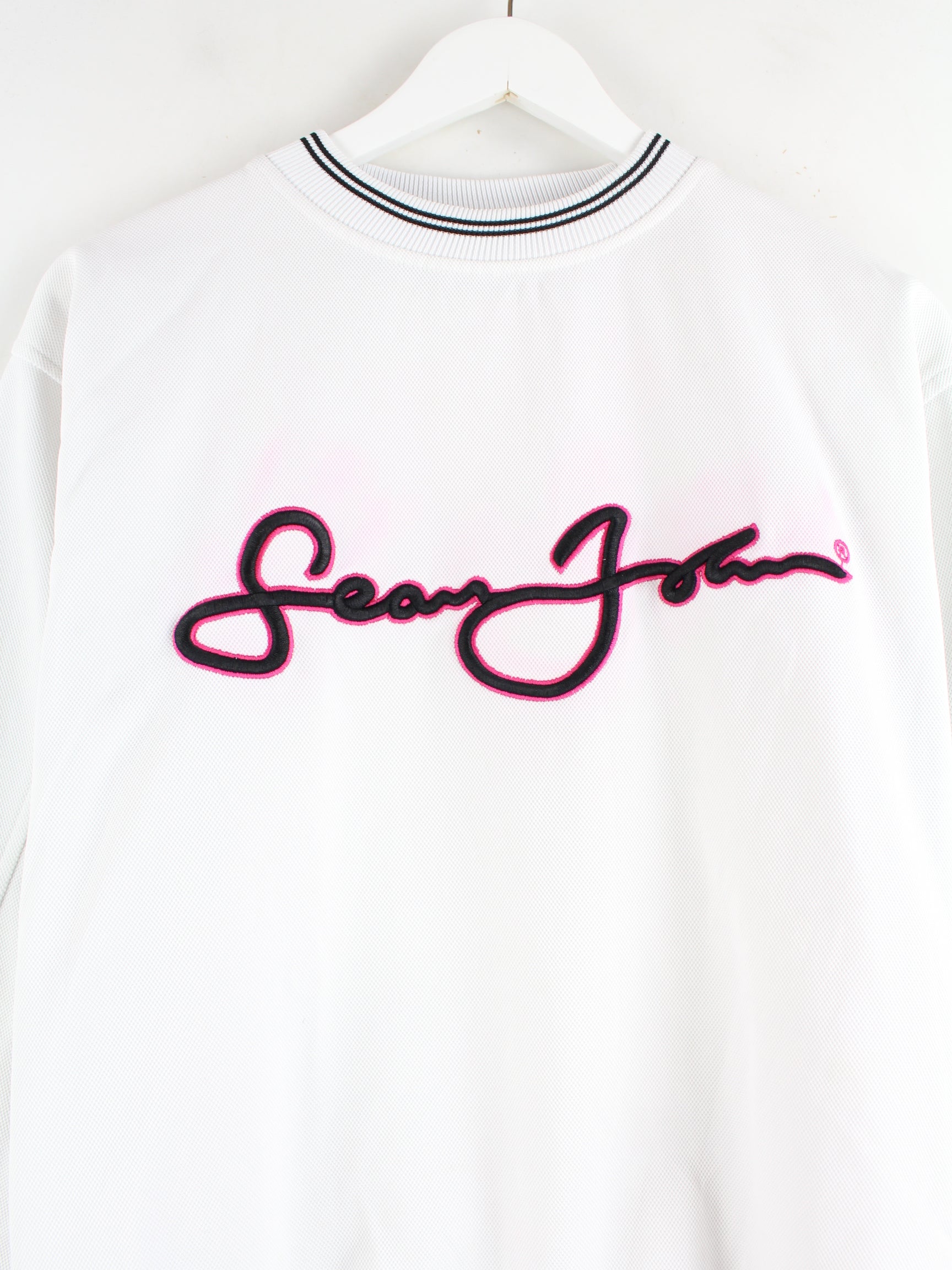 Weißer Sweater mit Stick von Sean John in Größe M. Er ist aus einer Baumwollmischung hergestellt. Den Zustand würden wir als 'In Ordnung' bezeichnen (vergl. Bilder).